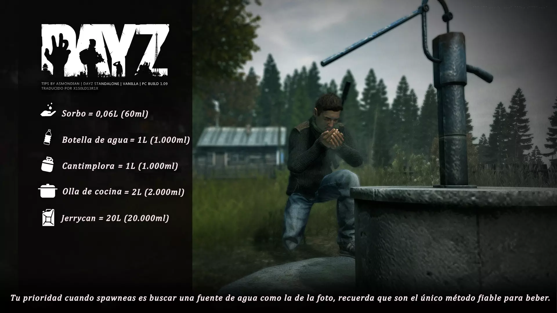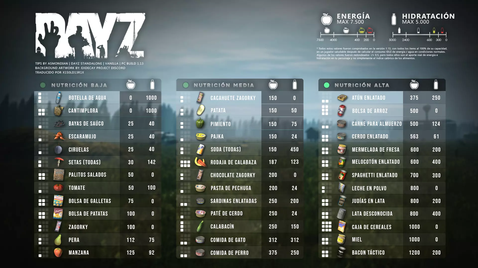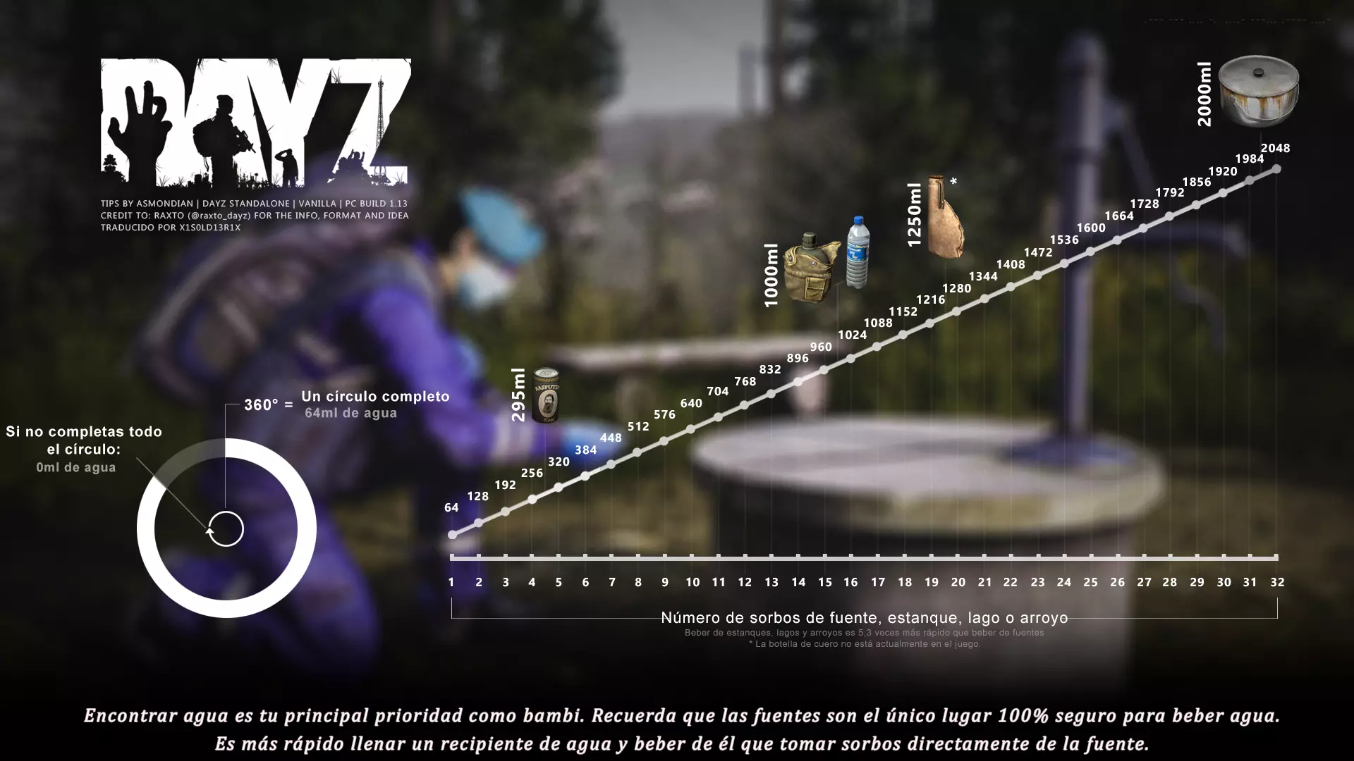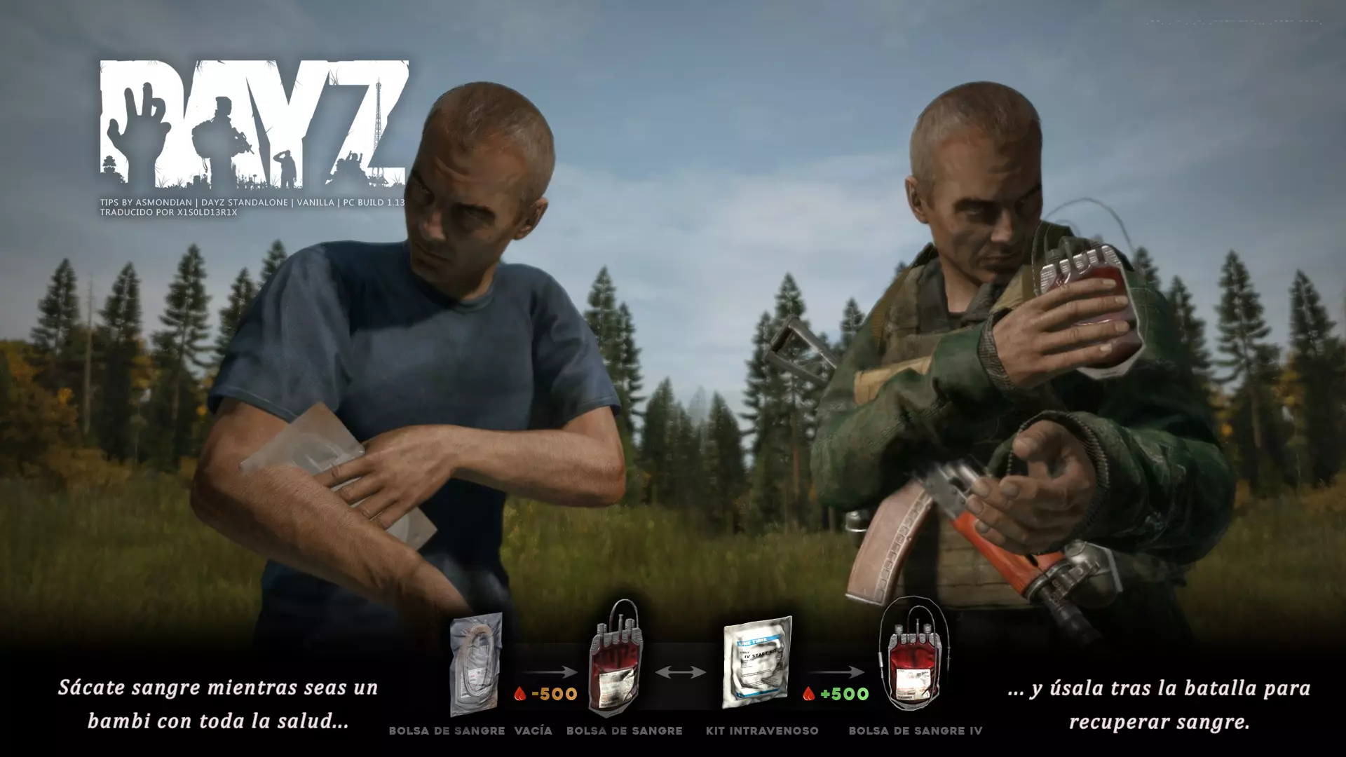 Aquí iré informando de las futuras actualizaciones de la guía. · 23/03/2021 - Guía actualizada hasta la versión 1.11 · 29/05/2021 - Guía actualizada hasta la versión 1.12 También se ha añadido una segunda sección de servers recomendados con el mapa de Namalsk · 13/06/2021 - Añadidos varios servers recomendados de Esseker y añadido un nuevo server recomendado para Chernarus (Invicta server) · 03/07/2021 - Actualizada la imagen principal de la sección "[Primeros pasos] Comida" con los nuevos tipos de comida. Añadida una nueva infografía en "[Info] Horticultura" con más datos significativos. · 04/07/2021 -Actualizada la sección "[Primeros pasos] Comida" con una imagen actualizada de los valores de la carne. Añadido un consejo con infografía de Asmondian en la sección " [Info] Caza" sobre como aprovechar los cadáveres humanos para nuestra supervivencia. · 04/07/2021 - Se están actualizando las infografías de Asmondian a la 1.13 que contienen nueva información, es algo que llevará algún tiempo. · 18/07/2021 - Se ha creado un grupo de Steam para la comunidad hispanohablante de DayZ, es un punto de encuentro para todos los supervivientes donde contar nuestras historias, consultar dudas, problemas y todo lo relacionado sobre el juego. https://steamcommunity.com/groups/DayZ-ESP · 5/08/2021 - Traducidas las infografías de la sección "[Protección] Chalecos y cascos" y "[Sistema inmunitario] Enfermedades" · 7/08/2021 Añadido nuevo server Livonia a recomendados: [GER] TheVoid | Hardcore | Organic RP | 1PP |: 5.230.84.31:2302 Es un Role Play Orgánico muy recomendable y bastante popular a pesar de estar recién abierto. · 13/08/2021 Añadido nuevo server Chernarus a recomendados: 14 DIAS | NEVER ZURRENDER | PVP | ORGANIC RP: 138.201.83.45:2304 Servidor semi-RP Orgánico en español, se ha añadido de manera excepcional por ser un buen sitio para aprender a jugar para aquellos que tengan menos paciencia, el server da bastantes facilidades como un mapa, comida extra y demás añadidos que desde aquí no solemos recomendar, sin embargo está bastante bien para empezar a jugar ya que no es un server Hardcore y además tiene una buena comunidad. · 14/08/2021 - Actualizadas infografías de las medicinas en la sección: [Medicamentos] Clases, [Reparación] Reparar loot, [Primeros pasos] Comida y [Shock] Inconsciencia · 17/08/2021 - Añadida nueva info a la sección [Daños] Dolor que no había sido incluida, básicamente que la morfina es un remedio muy efectivo contra el dolor. · 11/09/2021 - Guía actualizada hasta la versión 1.13, Añadida nueva sección médica llamada [Enfermedad] Heridas infectadas. · 27/10/2021 - Creada sección [Enfermedad] Envenenamiento Tóxico en la guía médica para conocer lo relativo a esta enfermedad. · 30/10/2021 - Creada sección [Info] Zona Tóxica en la guía de supervivencia donde se revelan todos los datos relativos a las zonas contaminadas y actualizada la lista de servers recomendados. · 31/10/2021 - Guía actualizada a la 1.14 en su mayor parte, lo cierto es que no tengo tiempo para completarla como me gustaría pero cuando lo disponga lo haré, añadido nuevo consejo en [Combate] Nociones avanzadas 2 para matar a los zombies de una puñalada, también se ha actualizado la sección de Trampas de la guía de armas y combate. · 15/01/2022 - Actualizadas las secciones de armas de la guía de armamento y combate, se han añadido las armas que faltaban. Actualizada la sección [Crafting] Armas recortadas. · 16/01/2022 - Actualizada la sección [Sangre] Heridas con la nueva info sobre infecciones en los cortes. · 17/01/2022 - Creada nueva sección con los tipos de zombies en la guía básica. · 03/04/2022 - Editada sección [Reparación] Reparar loot de la guía de crafting (básicamente que las máscaras de gas se pueden reparar con Epoxy y el traje NBQ con el kit de reparación de neumáticos. NOTA: Hacer las trampas para peces. · 20/04/2022 - Actualizada la sección de servers, se han incluido nuevos servidores y eliminado las comunidades cerradas, además de actualizas algunas IPs, la mayor novedad es que ha vuelto el servidor DayZ Core de Livonia y ha tenido una gran acogida. · 30/04/2022 -Actualizada la sección de "[Crafting] Básico" de la guía de crafting y loot, se han incluido un par de infografías de Asmondian. · 02/05/2022 - Actualizada la sección de "[Info] Pesca" de la guía de supervivencia, se han incluido las trampas para peces, lo mismo con [Info] Caza, se ha incluido el lazo trampa para conejos y gallinas, también [Info]La cocina (2ª Parte), en ella se ha actualizado el método de cocina "Hervido" con nueva info y por último mencionar que los helicrash cuando spawnean emiten un ruido estrellándose que permite escucharlos, con esto la guía queda completamente actualizada a la versión 1.14 · 07/05/2022 - Voy a tratar de rehacer todas las secciones de la guía para mejorarla, de momento he comenzado con la básica sección por sección. · 20/05/2022 - Guía actualizada completamente a la 1.15 · 10/06/2022 -Actualizada la sección [Info] Zombies 1/1 añadiendo la alarma como método de distracción, actualizada guía con nueva info: es posible beber con las manos manchadas de sagre sin enfermar si se hace desde un recipiente, nueva info sobre la reparación de loot y ahora es posible crear una tablilla para fracturas mediante cinta aislante y palos cortos. Actualizada la guía completamente a la 1.16. · 23/01/2023 - Actualizado servidores recomendados · 02/02/2023 - Estoy actualizando la guía lentamente, ya que algunas partes han quedado obsoletas, actualmente hay datos erróneos debido a que se han cambiado mecánicas. Introducción