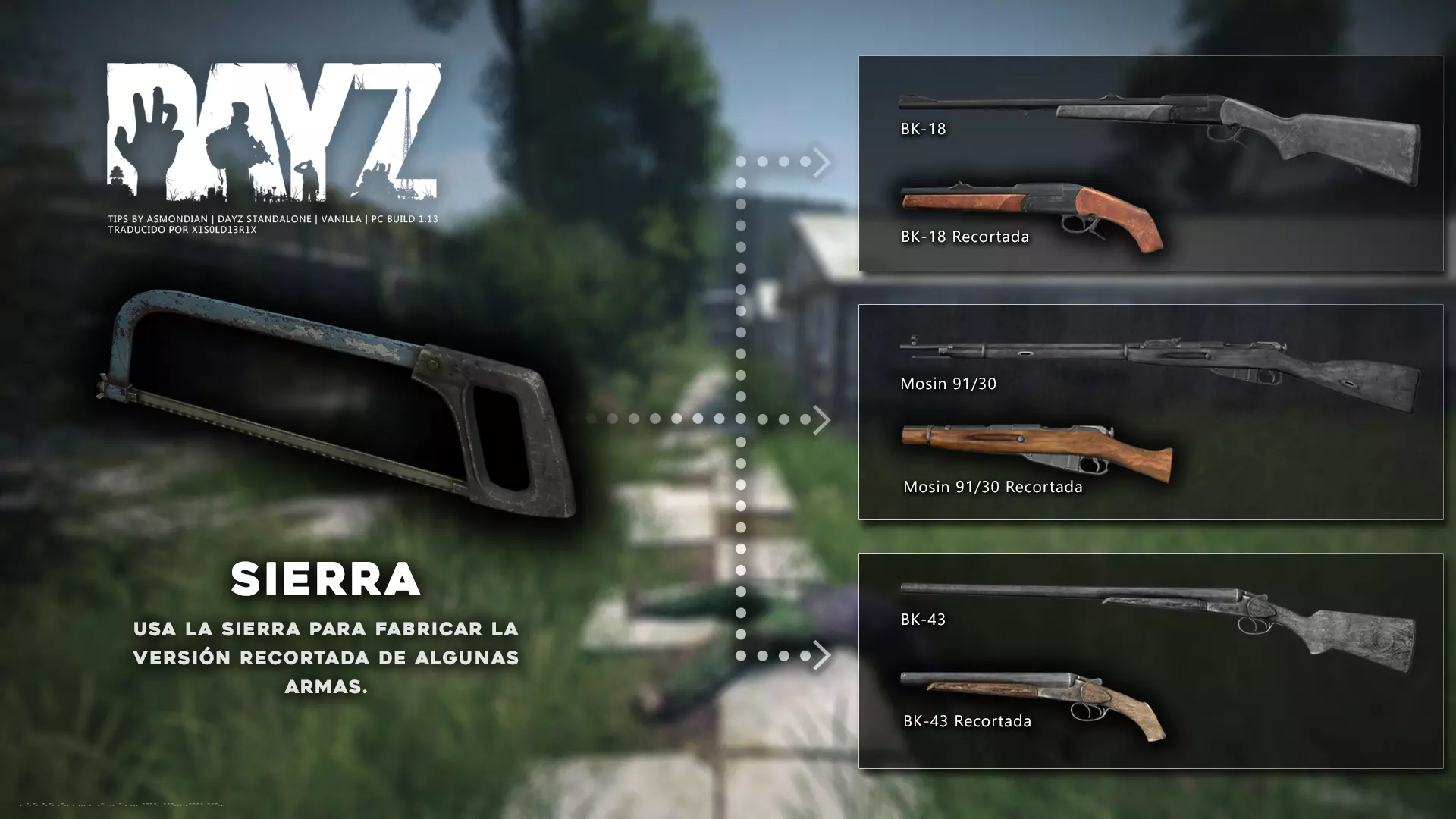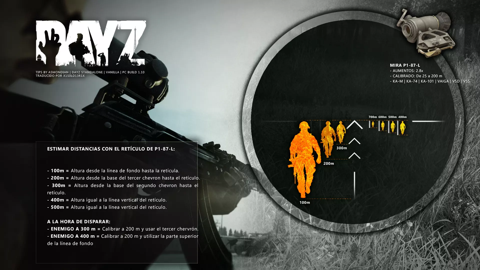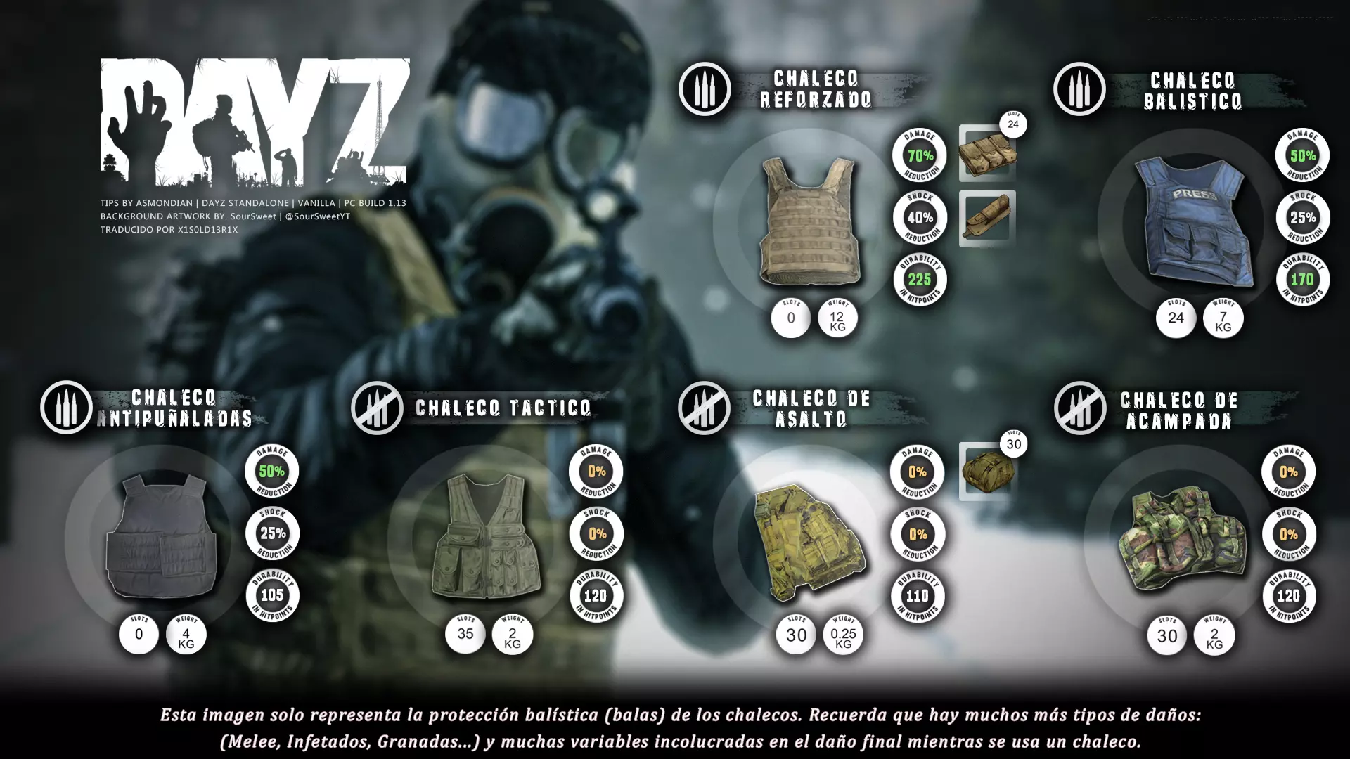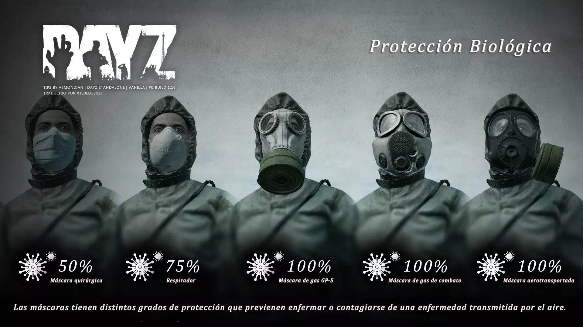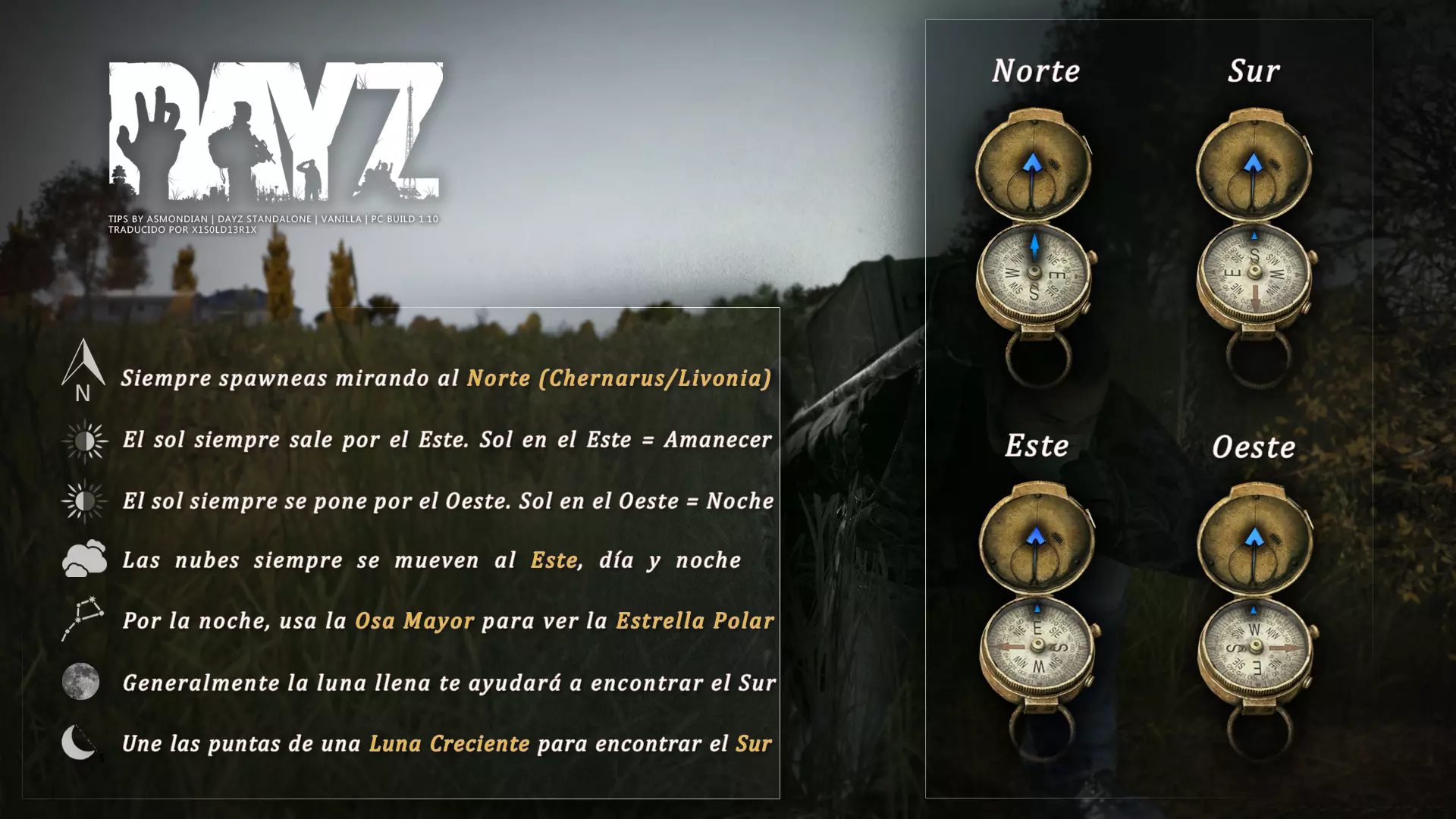 Aquí iré informando de las futuras actualizaciones de la guía. · 23/03/2021 - Guía actualizada hasta la versión 1.11 · 29/05/2021 - Guía actualizada hasta la versión 1.12 También se ha añadido una segunda sección de servers recomendados con el mapa de Namalsk · 13/06/2021 - Añadidos varios servers recomendados de Esseker y añadido un nuevo server recomendado para Chernarus (Invicta server) · 03/07/2021 - Actualizada la imagen principal de la sección "[Primeros pasos] Comida" con los nuevos tipos de comida. Añadida una nueva infografía en "[Info] Horticultura" con más datos significativos. · 04/07/2021 -Actualizada la sección "[Primeros pasos] Comida" con una imagen actualizada de los valores de la carne. Añadido un consejo con infografía de Asmondian en la sección " [Info] Caza" sobre como aprovechar los cadáveres humanos para nuestra supervivencia. · 04/07/2021 - Se están actualizando las infografías de Asmondian a la 1.13 que contienen nueva información, es algo que llevará algún tiempo. · 18/07/2021 - Se ha creado un grupo de Steam para la comunidad hispanohablante de DayZ, es un punto de encuentro para todos los supervivientes donde contar nuestras historias, consultar dudas, problemas y todo lo relacionado sobre el juego. https://steamcommunity.com/groups/DayZ-ESP · 5/08/2021 - Traducidas las infografías de la sección "[Protección] Chalecos y cascos" y "[Sistema inmunitario] Enfermedades" · 7/08/2021 Añadido nuevo server Livonia a recomendados: [GER] TheVoid | Hardcore | Organic RP | 1PP |: 5.230.84.31:2302 Es un Role Play Orgánico muy recomendable y bastante popular a pesar de estar recién abierto. · 13/08/2021 Añadido nuevo server Chernarus a recomendados: 14 DIAS | NEVER ZURRENDER | PVP | ORGANIC RP: 138.201.83.45:2304 Servidor semi-RP Orgánico en español, se ha añadido de manera excepcional por ser un buen sitio para aprender a jugar para aquellos que tengan menos paciencia, el server da bastantes facilidades como un mapa, comida extra y demás añadidos que desde aquí no solemos recomendar, sin embargo está bastante bien para empezar a jugar ya que no es un server Hardcore y además tiene una buena comunidad. · 14/08/2021 - Actualizadas infografías de las medicinas en la sección: [Medicamentos] Clases, [Reparación] Reparar loot, [Primeros pasos] Comida y [Shock] Inconsciencia · 17/08/2021 - Añadida nueva info a la sección [Daños] Dolor que no había sido incluida, básicamente que la morfina es un remedio muy efectivo contra el dolor. · 11/09/2021 - Guía actualizada hasta la versión 1.13, Añadida nueva sección médica llamada [Enfermedad] Heridas infectadas. · 27/10/2021 - Creada sección [Enfermedad] Envenenamiento Tóxico en la guía médica para conocer lo relativo a esta enfermedad. · 30/10/2021 - Creada sección [Info] Zona Tóxica en la guía de supervivencia donde se revelan todos los datos relativos a las zonas contaminadas y actualizada la lista de servers recomendados. · 31/10/2021 - Guía actualizada a la 1.14 en su mayor parte, lo cierto es que no tengo tiempo para completarla como me gustaría pero cuando lo disponga lo haré, añadido nuevo consejo en [Combate] Nociones avanzadas 2 para matar a los zombies de una puñalada, también se ha actualizado la sección de Trampas de la guía de armas y combate. · 15/01/2022 - Actualizadas las secciones de armas de la guía de armamento y combate, se han añadido las armas que faltaban. Actualizada la sección [Crafting] Armas recortadas. · 16/01/2022 - Actualizada la sección [Sangre] Heridas con la nueva info sobre infecciones en los cortes. · 17/01/2022 - Creada nueva sección con los tipos de zombies en la guía básica. · 03/04/2022 - Editada sección [Reparación] Reparar loot de la guía de crafting (básicamente que las máscaras de gas se pueden reparar con Epoxy y el traje NBQ con el kit de reparación de neumáticos. NOTA: Hacer las trampas para peces. · 20/04/2022 - Actualizada la sección de servers, se han incluido nuevos servidores y eliminado las comunidades cerradas, además de actualizas algunas IPs, la mayor novedad es que ha vuelto el servidor DayZ Core de Livonia y ha tenido una gran acogida. · 30/04/2022 -Actualizada la sección de "[Crafting] Básico" de la guía de crafting y loot, se han incluido un par de infografías de Asmondian. · 02/05/2022 - Actualizada la sección de "[Info] Pesca" de la guía de supervivencia, se han incluido las trampas para peces, lo mismo con [Info] Caza, se ha incluido el lazo trampa para conejos y gallinas, también [Info]La cocina (2ª Parte), en ella se ha actualizado el método de cocina "Hervido" con nueva info y por último mencionar que los helicrash cuando spawnean emiten un ruido estrellándose que permite escucharlos, con esto la guía queda completamente actualizada a la versión 1.14 · 07/05/2022 - Voy a tratar de rehacer todas las secciones de la guía para mejorarla, de momento he comenzado con la básica sección por sección. · 20/05/2022 - Guía actualizada completamente a la 1.15 · 10/06/2022 -Actualizada la sección [Info] Zombies 1/1 añadiendo la alarma como método de distracción, actualizada guía con nueva info: es posible beber con las manos manchadas de sagre sin enfermar si se hace desde un recipiente, nueva info sobre la reparación de loot y ahora es posible crear una tablilla para fracturas mediante cinta aislante y palos cortos. Actualizada la guía completamente a la 1.16. · 23/01/2023 - Actualizado servidores recomendados · 02/02/2023 - Estoy actualizando la guía lentamente, ya que algunas partes han quedado obsoletas, actualmente hay datos erróneos debido a que se han cambiado mecánicas. Introducción