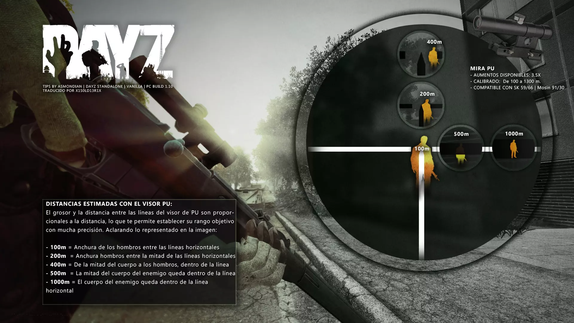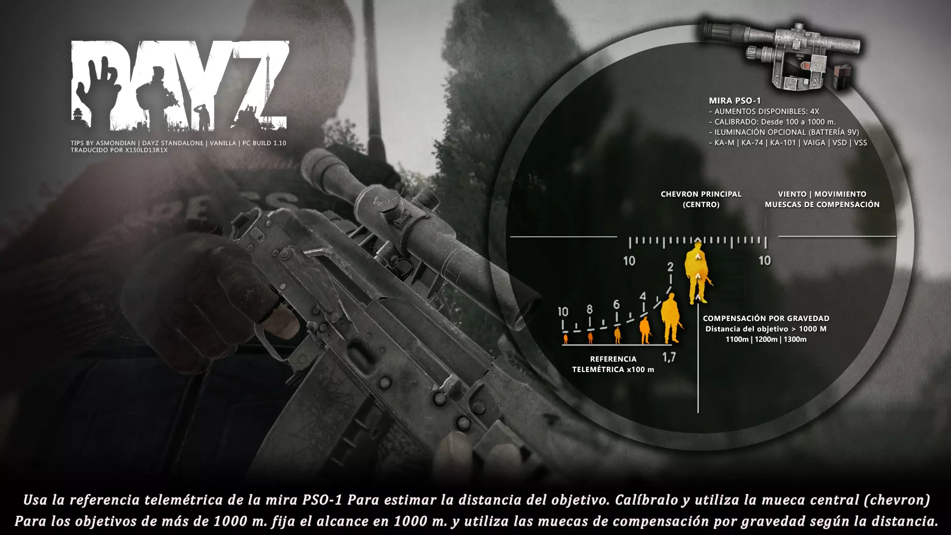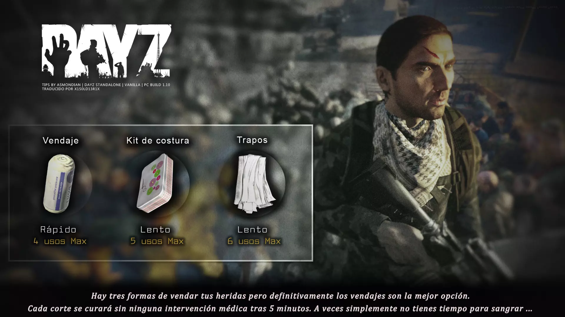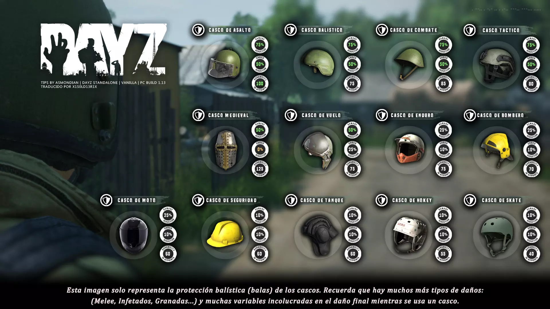 Aquí iré informando de las futuras actualizaciones de la guía. · 23/03/2021 - Guía actualizada hasta la versión 1.11 · 29/05/2021 - Guía actualizada hasta la versión 1.12 También se ha añadido una segunda sección de servers recomendados con el mapa de Namalsk · 13/06/2021 - Añadidos varios servers recomendados de Esseker y añadido un nuevo server recomendado para Chernarus (Invicta server) · 03/07/2021 - Actualizada la imagen principal de la sección "[Primeros pasos] Comida" con los nuevos tipos de comida. Añadida una nueva infografía en "[Info] Horticultura" con más datos significativos. · 04/07/2021 -Actualizada la sección "[Primeros pasos] Comida" con una imagen actualizada de los valores de la carne. Añadido un consejo con infografía de Asmondian en la sección " [Info] Caza" sobre como aprovechar los cadáveres humanos para nuestra supervivencia. · 04/07/2021 - Se están actualizando las infografías de Asmondian a la 1.13 que contienen nueva información, es algo que llevará algún tiempo. · 18/07/2021 - Se ha creado un grupo de Steam para la comunidad hispanohablante de DayZ, es un punto de encuentro para todos los supervivientes donde contar nuestras historias, consultar dudas, problemas y todo lo relacionado sobre el juego. https://steamcommunity.com/groups/DayZ-ESP · 5/08/2021 - Traducidas las infografías de la sección "[Protección] Chalecos y cascos" y "[Sistema inmunitario] Enfermedades" · 7/08/2021 Añadido nuevo server Livonia a recomendados: [GER] TheVoid | Hardcore | Organic RP | 1PP |: 5.230.84.31:2302 Es un Role Play Orgánico muy recomendable y bastante popular a pesar de estar recién abierto. · 13/08/2021 Añadido nuevo server Chernarus a recomendados: 14 DIAS | NEVER ZURRENDER | PVP | ORGANIC RP: 138.201.83.45:2304 Servidor semi-RP Orgánico en español, se ha añadido de manera excepcional por ser un buen sitio para aprender a jugar para aquellos que tengan menos paciencia, el server da bastantes facilidades como un mapa, comida extra y demás añadidos que desde aquí no solemos recomendar, sin embargo está bastante bien para empezar a jugar ya que no es un server Hardcore y además tiene una buena comunidad. · 14/08/2021 - Actualizadas infografías de las medicinas en la sección: [Medicamentos] Clases, [Reparación] Reparar loot, [Primeros pasos] Comida y [Shock] Inconsciencia · 17/08/2021 - Añadida nueva info a la sección [Daños] Dolor que no había sido incluida, básicamente que la morfina es un remedio muy efectivo contra el dolor. · 11/09/2021 - Guía actualizada hasta la versión 1.13, Añadida nueva sección médica llamada [Enfermedad] Heridas infectadas. · 27/10/2021 - Creada sección [Enfermedad] Envenenamiento Tóxico en la guía médica para conocer lo relativo a esta enfermedad. · 30/10/2021 - Creada sección [Info] Zona Tóxica en la guía de supervivencia donde se revelan todos los datos relativos a las zonas contaminadas y actualizada la lista de servers recomendados. · 31/10/2021 - Guía actualizada a la 1.14 en su mayor parte, lo cierto es que no tengo tiempo para completarla como me gustaría pero cuando lo disponga lo haré, añadido nuevo consejo en [Combate] Nociones avanzadas 2 para matar a los zombies de una puñalada, también se ha actualizado la sección de Trampas de la guía de armas y combate. · 15/01/2022 - Actualizadas las secciones de armas de la guía de armamento y combate, se han añadido las armas que faltaban. Actualizada la sección [Crafting] Armas recortadas. · 16/01/2022 - Actualizada la sección [Sangre] Heridas con la nueva info sobre infecciones en los cortes. · 17/01/2022 - Creada nueva sección con los tipos de zombies en la guía básica. · 03/04/2022 - Editada sección [Reparación] Reparar loot de la guía de crafting (básicamente que las máscaras de gas se pueden reparar con Epoxy y el traje NBQ con el kit de reparación de neumáticos. NOTA: Hacer las trampas para peces. · 20/04/2022 - Actualizada la sección de servers, se han incluido nuevos servidores y eliminado las comunidades cerradas, además de actualizas algunas IPs, la mayor novedad es que ha vuelto el servidor DayZ Core de Livonia y ha tenido una gran acogida. · 30/04/2022 -Actualizada la sección de "[Crafting] Básico" de la guía de crafting y loot, se han incluido un par de infografías de Asmondian. · 02/05/2022 - Actualizada la sección de "[Info] Pesca" de la guía de supervivencia, se han incluido las trampas para peces, lo mismo con [Info] Caza, se ha incluido el lazo trampa para conejos y gallinas, también [Info]La cocina (2ª Parte), en ella se ha actualizado el método de cocina "Hervido" con nueva info y por último mencionar que los helicrash cuando spawnean emiten un ruido estrellándose que permite escucharlos, con esto la guía queda completamente actualizada a la versión 1.14 · 07/05/2022 - Voy a tratar de rehacer todas las secciones de la guía para mejorarla, de momento he comenzado con la básica sección por sección. · 20/05/2022 - Guía actualizada completamente a la 1.15 · 10/06/2022 -Actualizada la sección [Info] Zombies 1/1 añadiendo la alarma como método de distracción, actualizada guía con nueva info: es posible beber con las manos manchadas de sagre sin enfermar si se hace desde un recipiente, nueva info sobre la reparación de loot y ahora es posible crear una tablilla para fracturas mediante cinta aislante y palos cortos. Actualizada la guía completamente a la 1.16. · 23/01/2023 - Actualizado servidores recomendados · 02/02/2023 - Estoy actualizando la guía lentamente, ya que algunas partes han quedado obsoletas, actualmente hay datos erróneos debido a que se han cambiado mecánicas. Introducción