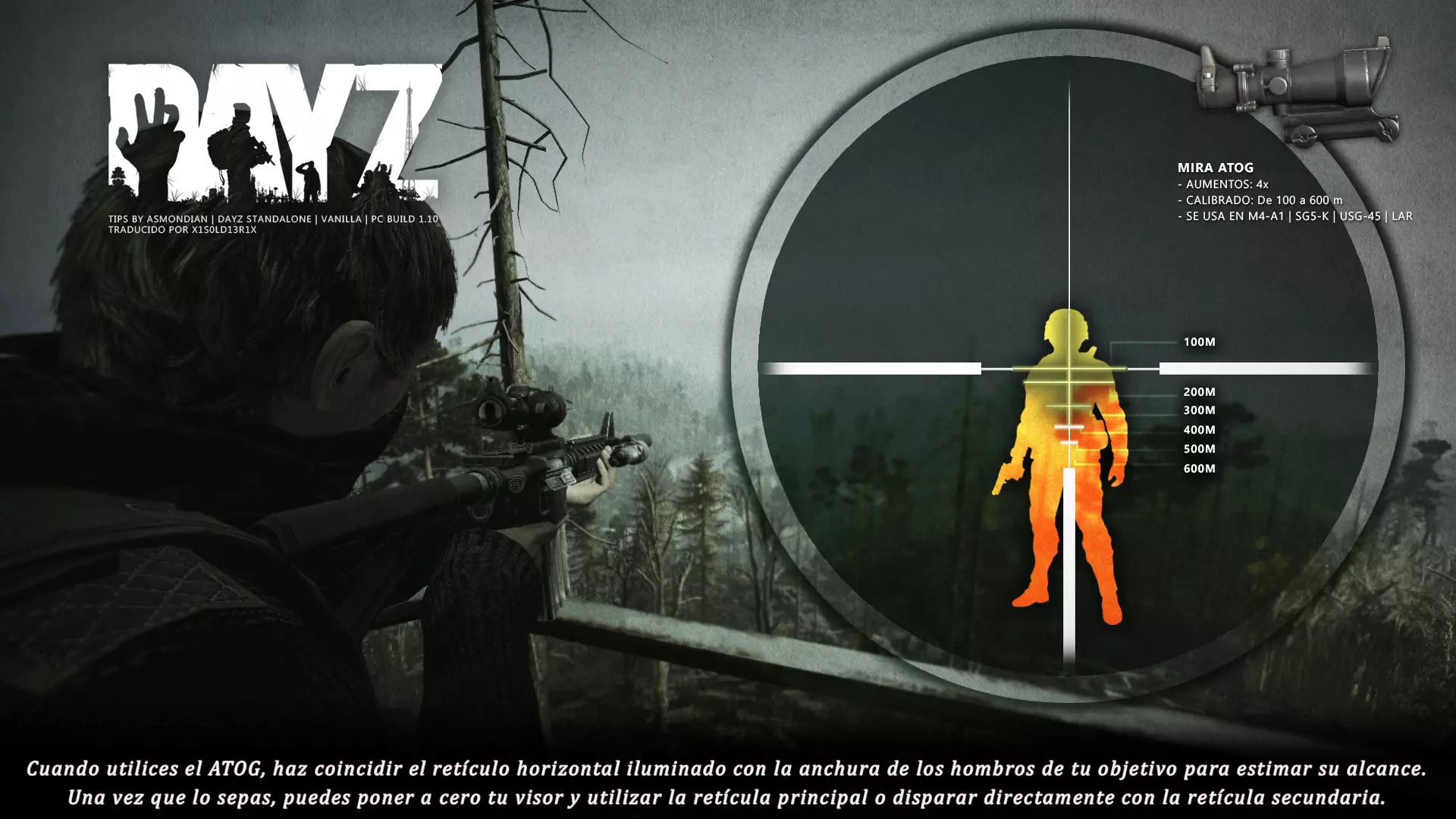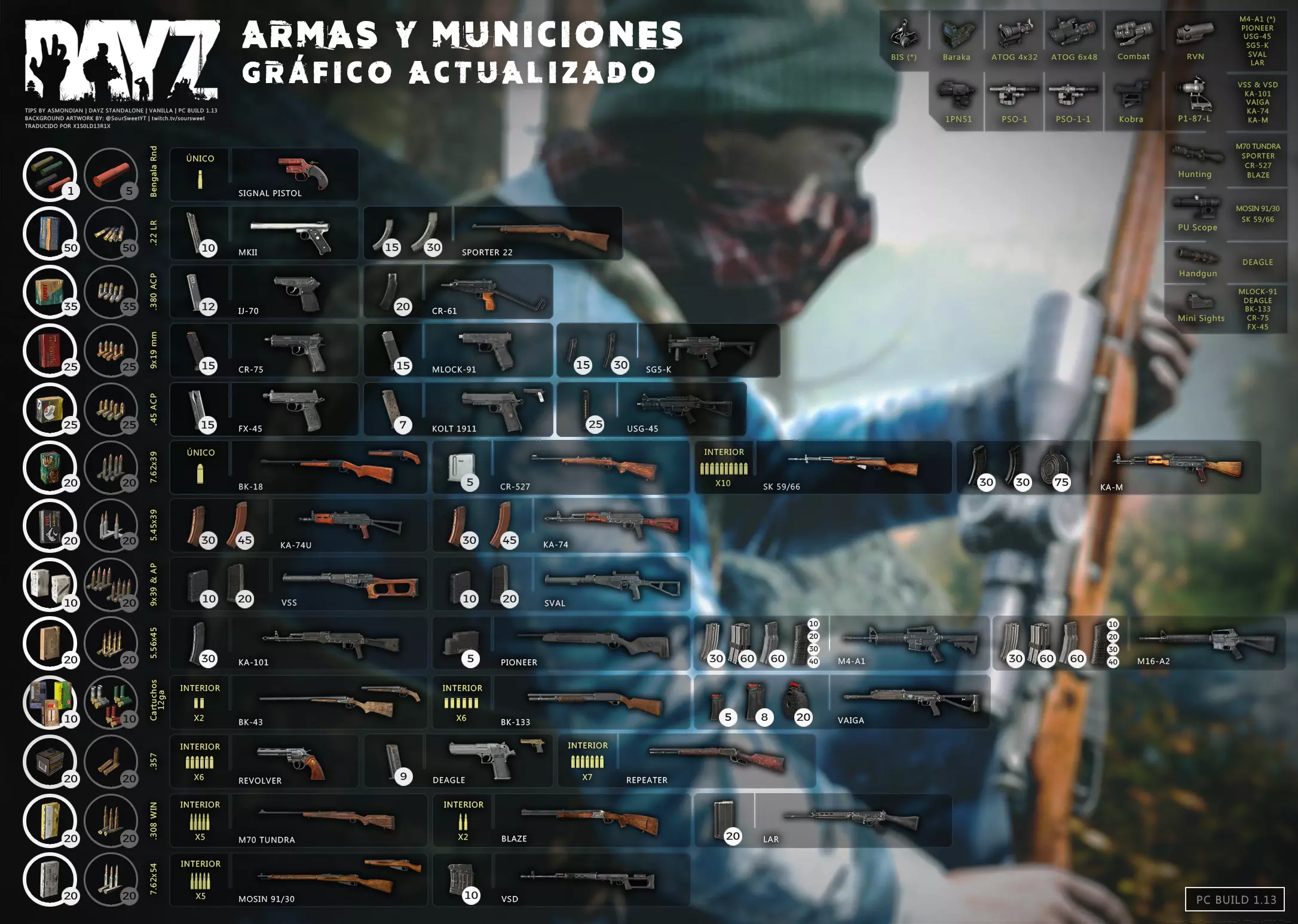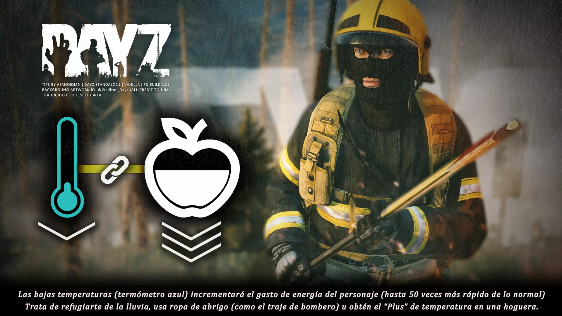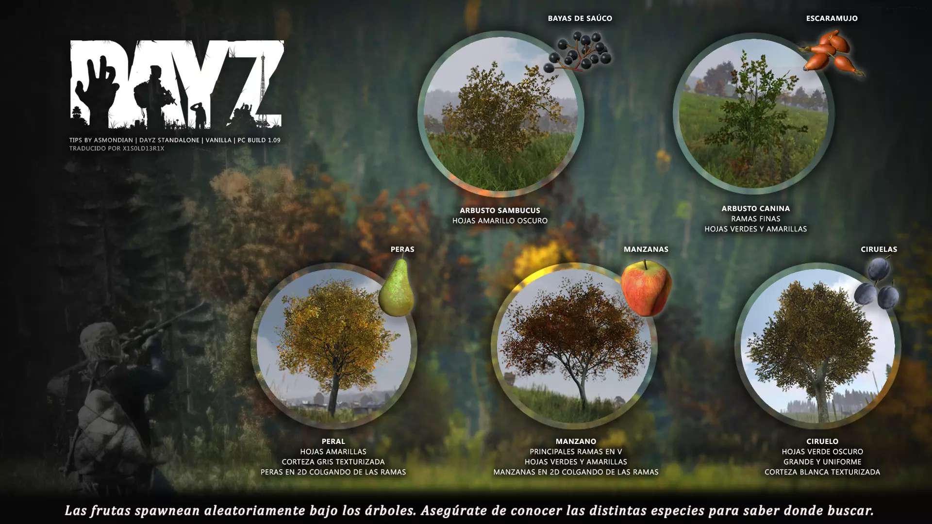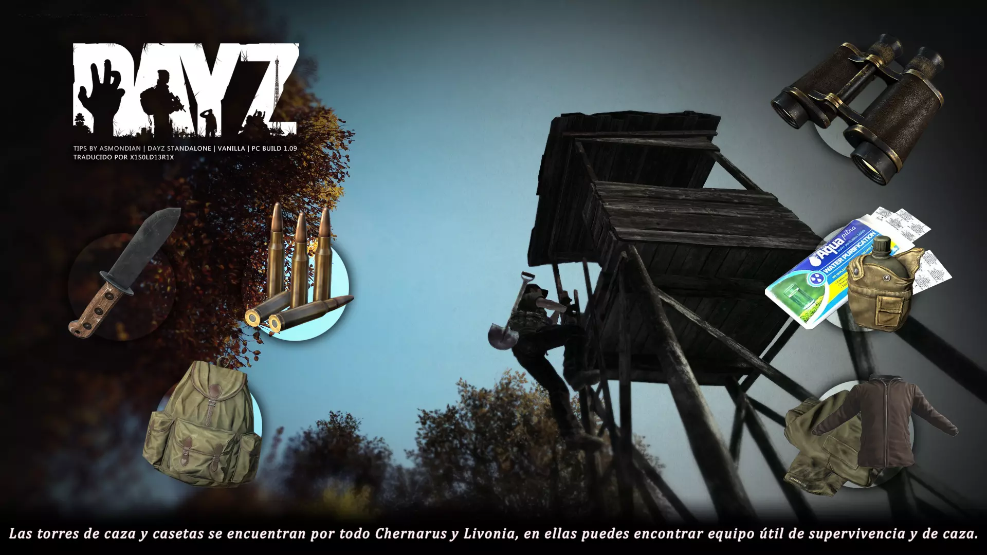 Aquí iré informando de las futuras actualizaciones de la guía. · 23/03/2021 - Guía actualizada hasta la versión 1.11 · 29/05/2021 - Guía actualizada hasta la versión 1.12 También se ha añadido una segunda sección de servers recomendados con el mapa de Namalsk · 13/06/2021 - Añadidos varios servers recomendados de Esseker y añadido un nuevo server recomendado para Chernarus (Invicta server) · 03/07/2021 - Actualizada la imagen principal de la sección "[Primeros pasos] Comida" con los nuevos tipos de comida. Añadida una nueva infografía en "[Info] Horticultura" con más datos significativos. · 04/07/2021 -Actualizada la sección "[Primeros pasos] Comida" con una imagen actualizada de los valores de la carne. Añadido un consejo con infografía de Asmondian en la sección " [Info] Caza" sobre como aprovechar los cadáveres humanos para nuestra supervivencia. · 04/07/2021 - Se están actualizando las infografías de Asmondian a la 1.13 que contienen nueva información, es algo que llevará algún tiempo. · 18/07/2021 - Se ha creado un grupo de Steam para la comunidad hispanohablante de DayZ, es un punto de encuentro para todos los supervivientes donde contar nuestras historias, consultar dudas, problemas y todo lo relacionado sobre el juego. https://steamcommunity.com/groups/DayZ-ESP · 5/08/2021 - Traducidas las infografías de la sección "[Protección] Chalecos y cascos" y "[Sistema inmunitario] Enfermedades" · 7/08/2021 Añadido nuevo server Livonia a recomendados: [GER] TheVoid | Hardcore | Organic RP | 1PP |: 5.230.84.31:2302 Es un Role Play Orgánico muy recomendable y bastante popular a pesar de estar recién abierto. · 13/08/2021 Añadido nuevo server Chernarus a recomendados: 14 DIAS | NEVER ZURRENDER | PVP | ORGANIC RP: 138.201.83.45:2304 Servidor semi-RP Orgánico en español, se ha añadido de manera excepcional por ser un buen sitio para aprender a jugar para aquellos que tengan menos paciencia, el server da bastantes facilidades como un mapa, comida extra y demás añadidos que desde aquí no solemos recomendar, sin embargo está bastante bien para empezar a jugar ya que no es un server Hardcore y además tiene una buena comunidad. · 14/08/2021 - Actualizadas infografías de las medicinas en la sección: [Medicamentos] Clases, [Reparación] Reparar loot, [Primeros pasos] Comida y [Shock] Inconsciencia · 17/08/2021 - Añadida nueva info a la sección [Daños] Dolor que no había sido incluida, básicamente que la morfina es un remedio muy efectivo contra el dolor. · 11/09/2021 - Guía actualizada hasta la versión 1.13, Añadida nueva sección médica llamada [Enfermedad] Heridas infectadas. · 27/10/2021 - Creada sección [Enfermedad] Envenenamiento Tóxico en la guía médica para conocer lo relativo a esta enfermedad. · 30/10/2021 - Creada sección [Info] Zona Tóxica en la guía de supervivencia donde se revelan todos los datos relativos a las zonas contaminadas y actualizada la lista de servers recomendados. · 31/10/2021 - Guía actualizada a la 1.14 en su mayor parte, lo cierto es que no tengo tiempo para completarla como me gustaría pero cuando lo disponga lo haré, añadido nuevo consejo en [Combate] Nociones avanzadas 2 para matar a los zombies de una puñalada, también se ha actualizado la sección de Trampas de la guía de armas y combate. · 15/01/2022 - Actualizadas las secciones de armas de la guía de armamento y combate, se han añadido las armas que faltaban. Actualizada la sección [Crafting] Armas recortadas. · 16/01/2022 - Actualizada la sección [Sangre] Heridas con la nueva info sobre infecciones en los cortes. · 17/01/2022 - Creada nueva sección con los tipos de zombies en la guía básica. · 03/04/2022 - Editada sección [Reparación] Reparar loot de la guía de crafting (básicamente que las máscaras de gas se pueden reparar con Epoxy y el traje NBQ con el kit de reparación de neumáticos. NOTA: Hacer las trampas para peces. · 20/04/2022 - Actualizada la sección de servers, se han incluido nuevos servidores y eliminado las comunidades cerradas, además de actualizas algunas IPs, la mayor novedad es que ha vuelto el servidor DayZ Core de Livonia y ha tenido una gran acogida. · 30/04/2022 -Actualizada la sección de "[Crafting] Básico" de la guía de crafting y loot, se han incluido un par de infografías de Asmondian. · 02/05/2022 - Actualizada la sección de "[Info] Pesca" de la guía de supervivencia, se han incluido las trampas para peces, lo mismo con [Info] Caza, se ha incluido el lazo trampa para conejos y gallinas, también [Info]La cocina (2ª Parte), en ella se ha actualizado el método de cocina "Hervido" con nueva info y por último mencionar que los helicrash cuando spawnean emiten un ruido estrellándose que permite escucharlos, con esto la guía queda completamente actualizada a la versión 1.14 · 07/05/2022 - Voy a tratar de rehacer todas las secciones de la guía para mejorarla, de momento he comenzado con la básica sección por sección. · 20/05/2022 - Guía actualizada completamente a la 1.15 · 10/06/2022 -Actualizada la sección [Info] Zombies 1/1 añadiendo la alarma como método de distracción, actualizada guía con nueva info: es posible beber con las manos manchadas de sagre sin enfermar si se hace desde un recipiente, nueva info sobre la reparación de loot y ahora es posible crear una tablilla para fracturas mediante cinta aislante y palos cortos. Actualizada la guía completamente a la 1.16. · 23/01/2023 - Actualizado servidores recomendados · 02/02/2023 - Estoy actualizando la guía lentamente, ya que algunas partes han quedado obsoletas, actualmente hay datos erróneos debido a que se han cambiado mecánicas. Introducción