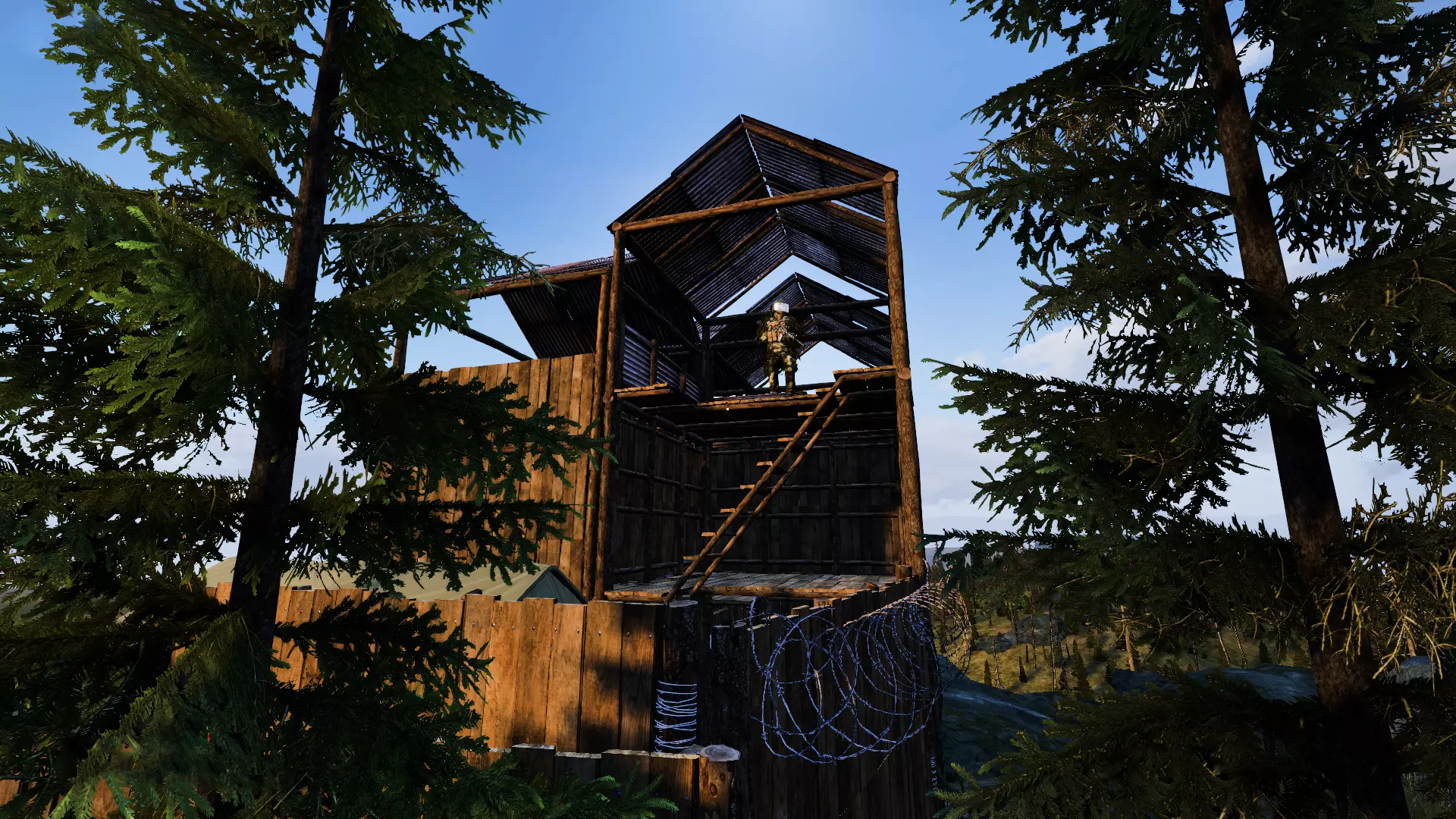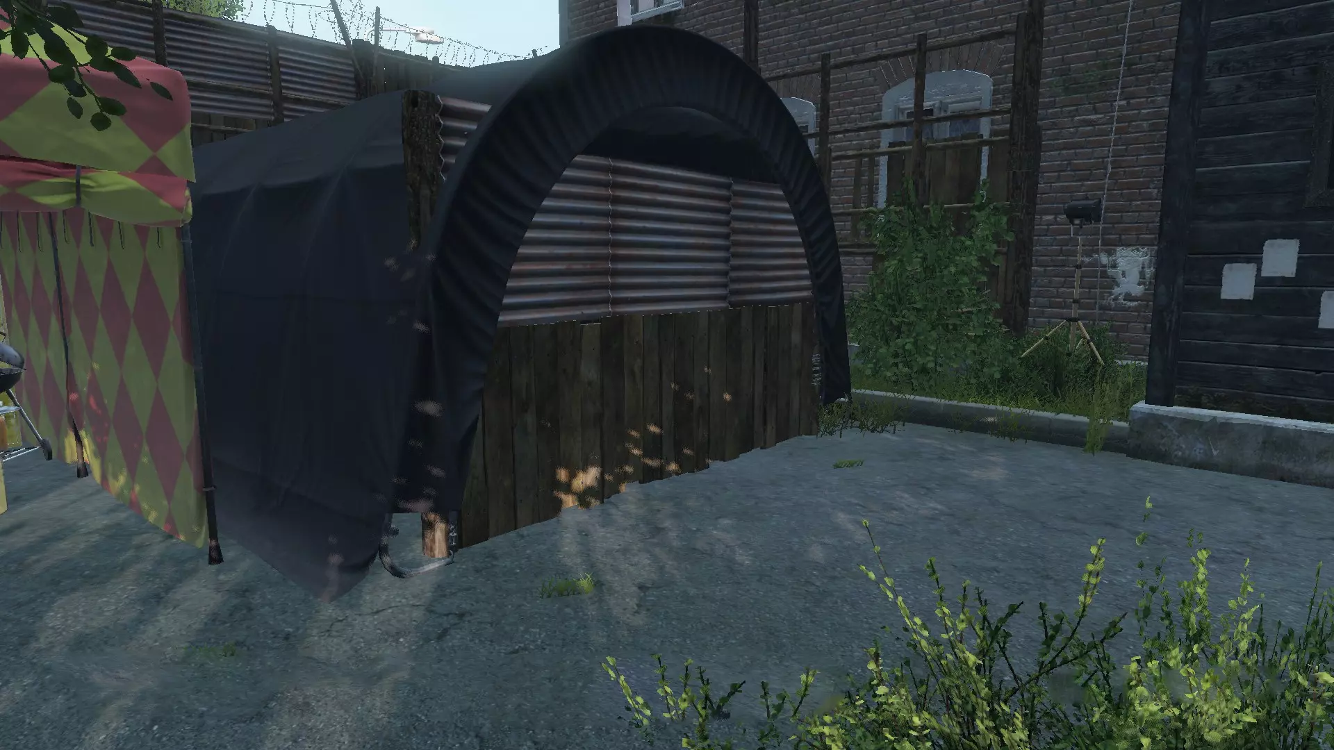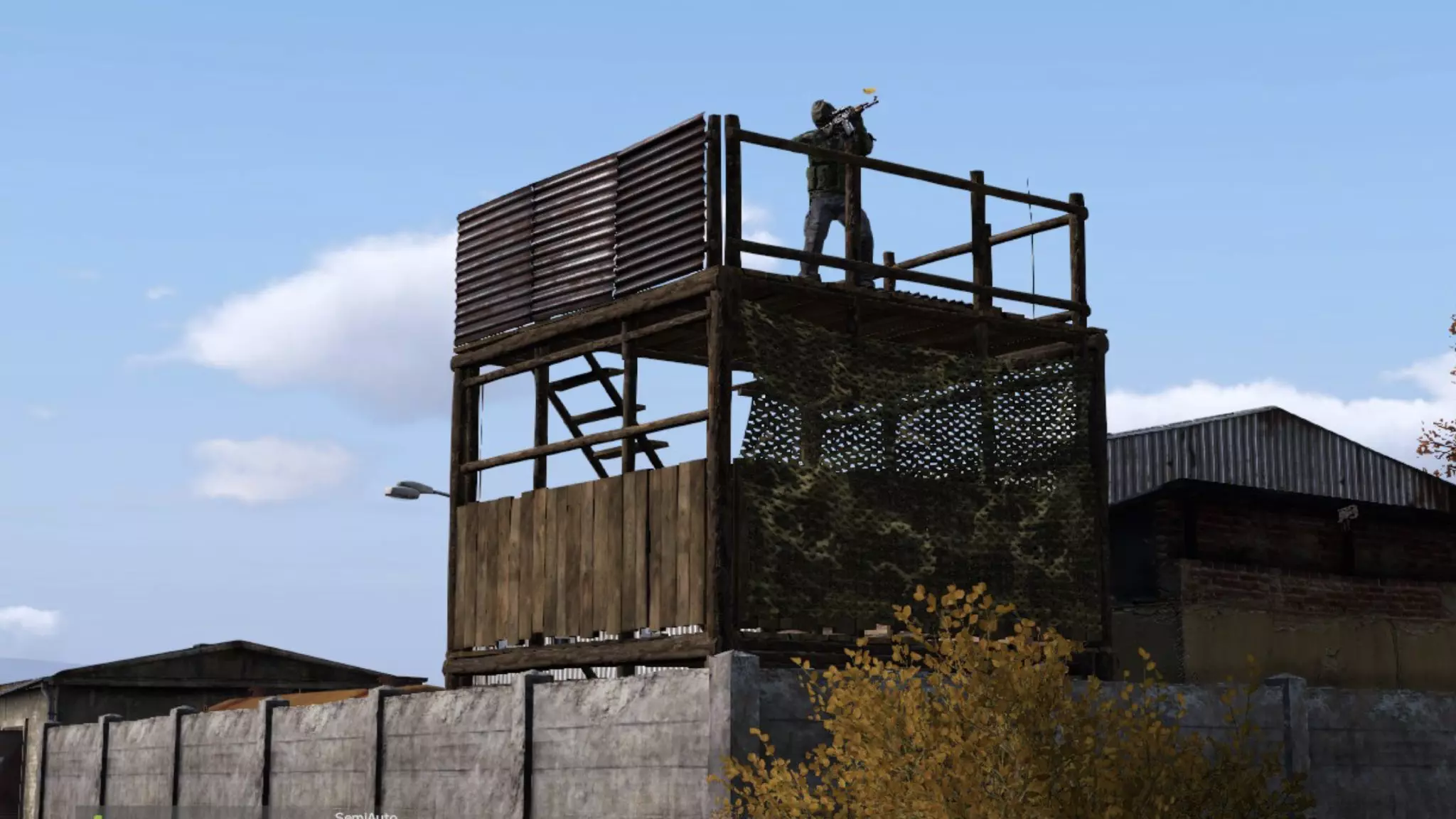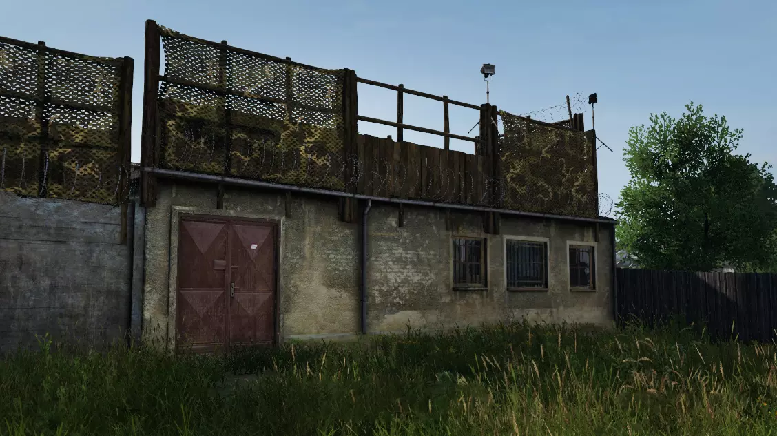你可以利用地图环境来建造你的基地。在《DayZ》的Chernarus和Livonia地图中,你会发现各种带有游戏内围墙的区域,比如军事区域等。你可以加固这些围墙并封锁其入口。游戏内的围墙可以被幸存者翻越,但如果在上面建造基地建筑,幸存者就无法翻越了,此时围墙高度约为两层。例如,有玩家利用左侧的棚屋和围墙进行了加固。