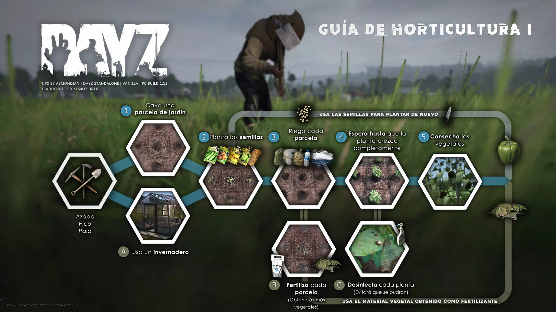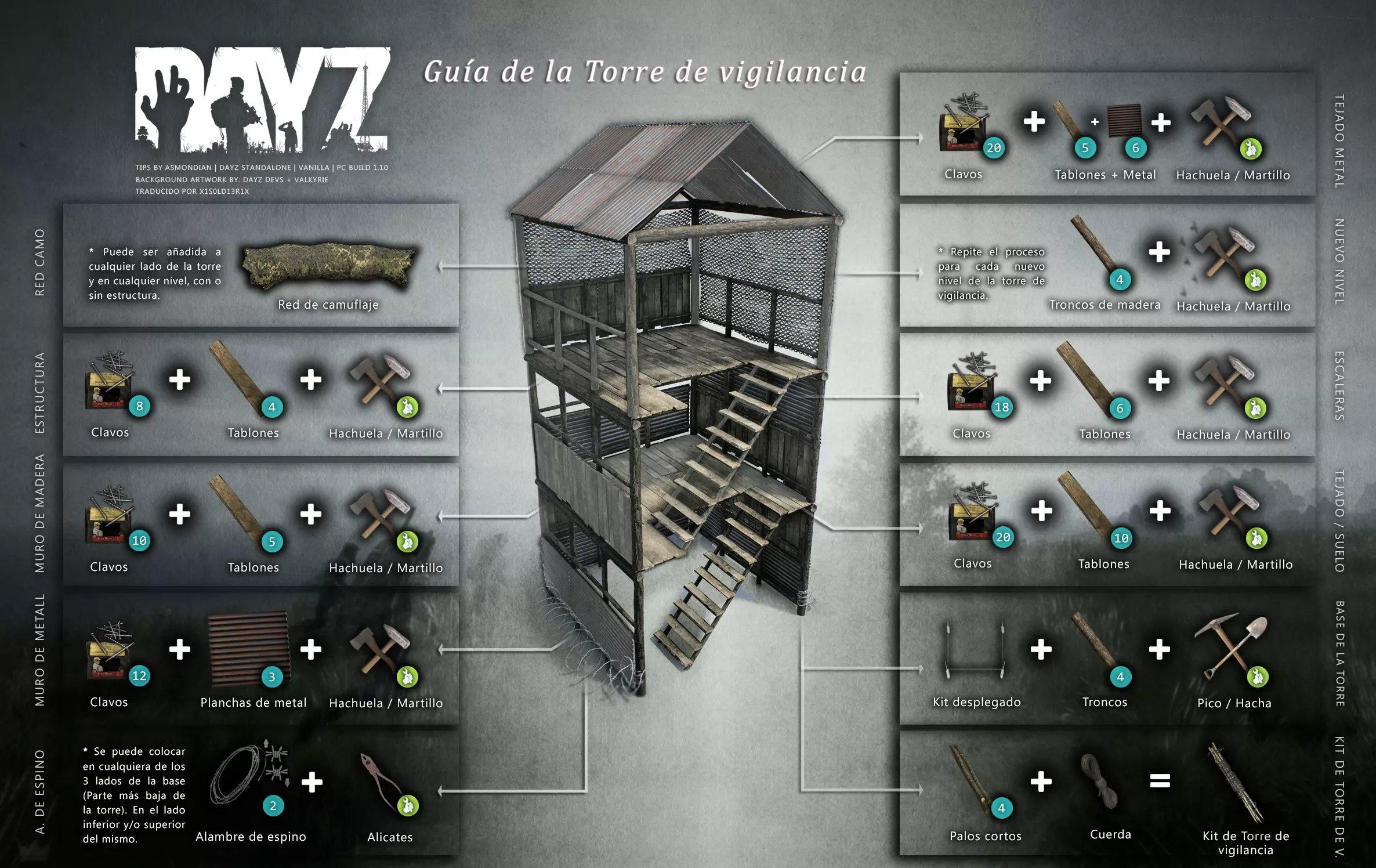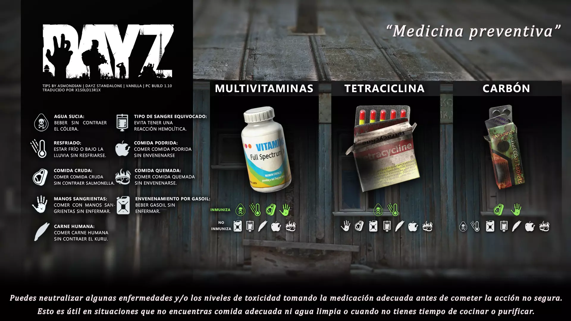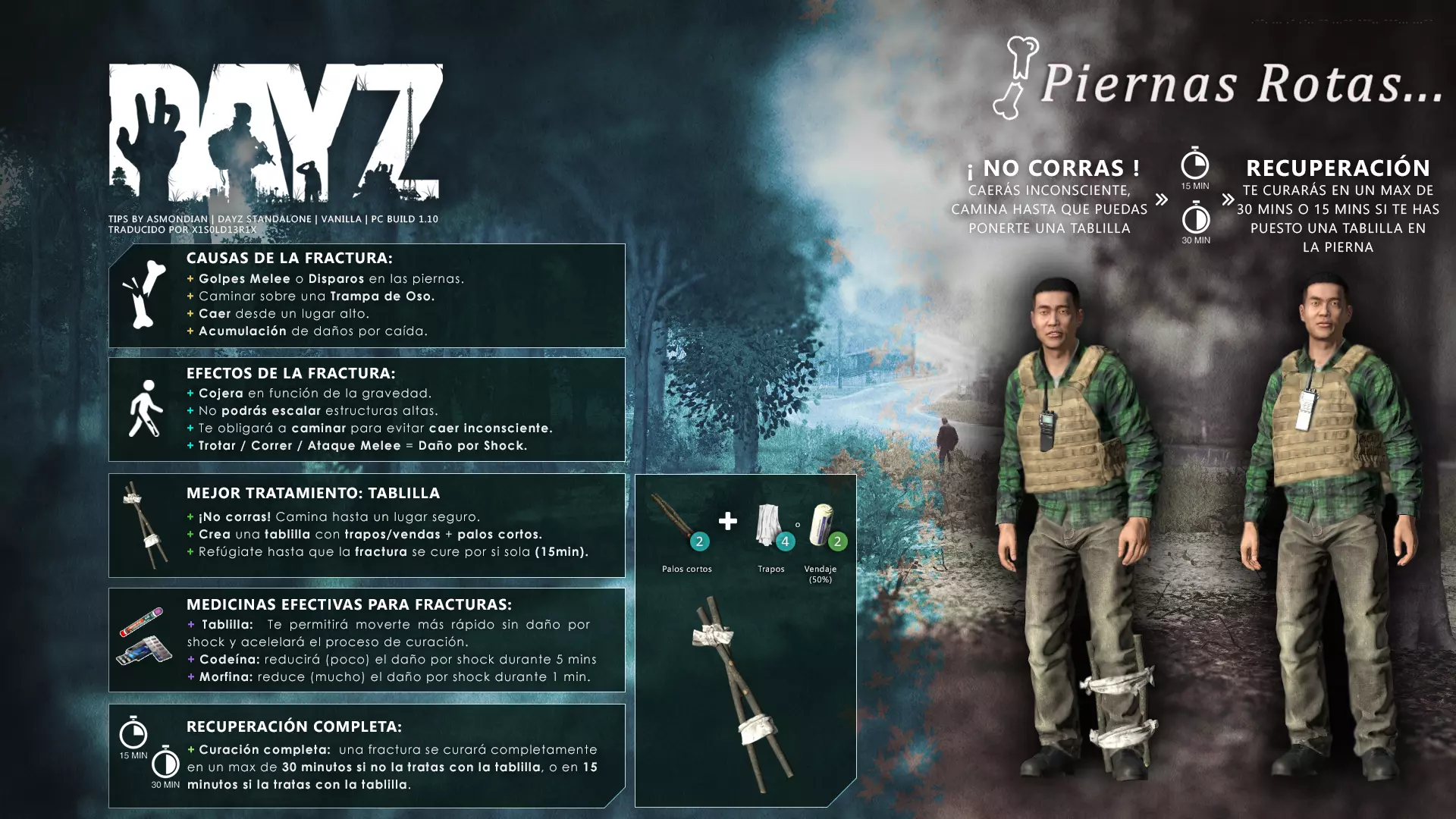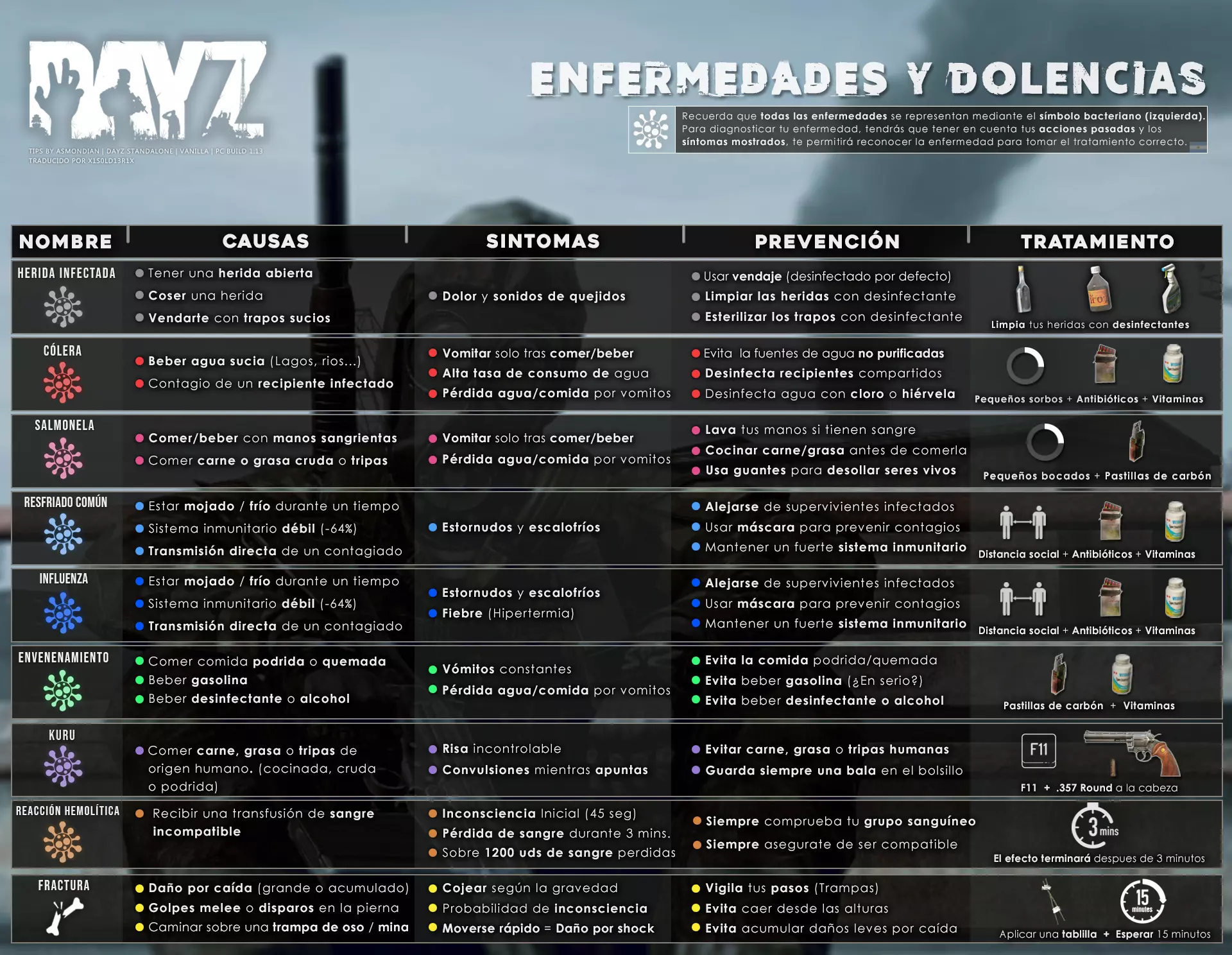 Aquí iré informando de las futuras actualizaciones de la guía. · 20/11/2020 - Guía actualizada hasta la versión 1.09 · 21/11/2020 - Actualizados iconos de la sección "Indicadores HUD" a la 1.10 y añadido un gif. Añadida nueva info acerca del cuchillo improvisado en la sección "[Primeros pasos] El cuchillo" de la guía básica. · 22/11/2020 - Texto de la sección de "Caza" de la guía de supervivencia actualizado a la 1.10. Añadida nueva info en la sección de "[Medicamentos] Clases" de la guía médica con información relativa a los medicamentos, lo mismo con la sección de " [Medicamentos] Medicina preventiva" · 23/11/2020 - La sección de materiales de construcción de la guía de base building casi se ha completado a falta de unos datos que iré añadiendo. · 24/11/2020 - La sección "[Info] RP orgánico con Facciones" de la guía de servers ha sido reescrita de manera más breve. · 25/11/2020 - Las imágenes de la sección "[Almacenamiento] Tipos" de la guía de base building han sido redimensionadas quedando más cómodo visualmente a la hora de leer. · 26/11/2020 - Creada nueva sección llamada "[Refugios] Materiales requeridos" en la guía de base building donde se explica todo lo relativo a la creación de refugios, faltan detalles por completar pero se explica todo detalladamente. Añadido el refugio a la sección de " [Almacenamiento] Tipos" de la guía de base building ya que es una forma más de guardar tu equipo. · 27/11/2020 - Añadida infografía de Asmond sobre las enfermedades a la sección de [Enfermedades] Nociones básicas de la guía médica, está en inglés aún pero actualizada a la versión 1.10 · 01/12/2020 - Se ha actualizado la sección [Info] La cocina (1ª Parte), en concreto la parte de cocinar a la brasa con el palo largo de madera, ahora requiere afilarlo antes con alguna herramienta cortante para poder clavar el trozo de comida en el, para posteriormente cocinarla. · 03/12/2020 - Se ha actualizado la sección [Info] Frío y lluvia a la versión 1.10 de la guía de supervivencia. · 06/12/2020 - El texto de la sección [Info] La cocina (1ª Parte) de la guía de supervivencia se ha actualizado a la 1.10 (solo texto, no las infografías) lo más relevante que se ha añadido es la explicación del nuevo método de cocina (deshidratación) que sirve para que la comida no se pudra. · 07/12/2020 - Añadida nueva sección en la guía de crafting llamada "Fabricación con cuero" aquí aprenderás a fabricar prendas de vestir mediante piel animal. · 12/12/2020 - Actualizada infografía de Asmondian en la sección Frío y lluvia de la guía de supervivencia en la relación a las prendas de ropa. · 17/12/2020 - Añadida sección llamada "[Defensas] Reforzar una base" en la guía de basebuilding donde aprenderemos los elementos básicos para proteger nuestra base. También se ha añadido una infografía de Asmond muy útil en "Indicadores HUD" de la guía básica en la que se resumen los principales indicadores HUD. · 26/12/2020 - La guía de crafting ahora también será de loot para añadir allí información relativa a éste. Se han añadido dos nuevas secciones a la guía de crafting y loot llamadas "[Reparación] reparar loot" y "[Baterías] duración" aquí podremos ver todas las herramientas de reparación y los objetos que reparar y por otro lado las distintas baterías que existen y la duración que tienen en cada objeto. · 04/01/2021 - Se han traducido y actualizado las imágenes a la versión 1.10 de las siguientes secciones: [Primeros pasos] Indicadores HUD, [Enfermedad] Cólera y [Medicamentos] Medicina preventiva. · 05/01/2021 - Se han traducido y actualizado las imágenes a la versión 1.10 de las siguientes secciones: [Medicamentos] Clases, [Crafting] Avanzado, [Info] Pesca, [Crafting] Armas recortadas y [Daños] Fracturas. En la sección [Primeros pasos] Comida se ha añadido un apartado explicando la descomposición de la comida y una imagen explicativa con la duración. · 07/01/2021 - Se ha editado y añadido nueva información a la sección [Info] Zombies y traducido la imagen explicativa de la guía de basebuilding [Materiales] Muro / Puerta y [Materiales] Torre de vigilancia y [Raid] Resistencia de las construcciones. · 08/01/2021 - Editada la sección [Traje Ghillie] Fabricación y tipos de la guía de armas y combate, también se ha traducido la imagen explicativa. Traducida la sección [Materiales] Mástil con bandera de la guía de basebuilding. Editada la sección [Info] Frío y lluvia de la guía de supervivencia y traducido dos imágenes explicativas, actualizada imagen explicativa principal de la sección de [Primeros pasos] Comida de la guía básica, añadidos consejos e imagenes explicativas en la sección [Combate] Nociones avanzadas de la guía de armas y municiones. · 09/01/2021 - actualizada sección [Vehículos] Clases disponibles de la guía de vehículos a la 1.10 añadiendo el camión. Editada sección " [Defensas] Reforzar una base" con nueva información muy importante a la hora de hacer una base. Añadida imagen explicativa de los valores nutricionales de la comida en la sección de [Primeros pasos] Comida de la guía básica. · 10/01/2021 - He revisado secciones y corregido algunas erratas, también se han traducido varias imágenes, la más importante la de [Enfermedades] Nociones básicas el resto son de menor importancia. · 11/01/2021 - Editada y reorganizada la sección de "Capturar y ser capturado de la guía de armas y combate" Traducidas las imágenes explicativas de la sección [Sangre] Heridas y transfusiones de la guía médica excepto la principal. Traducida imagen explicativa "[Reparación] Reparar loot" de la guía de crafting y loot. Se han traducido muchas imagen de Asmondian a nivel general en la guía. Editada la sección de raid con nuevos consejos importantes. · 15/01/2021 - Estos días he estado traduciendo la mayoría de imágenes que quedaban en inglés y corrigiendo 