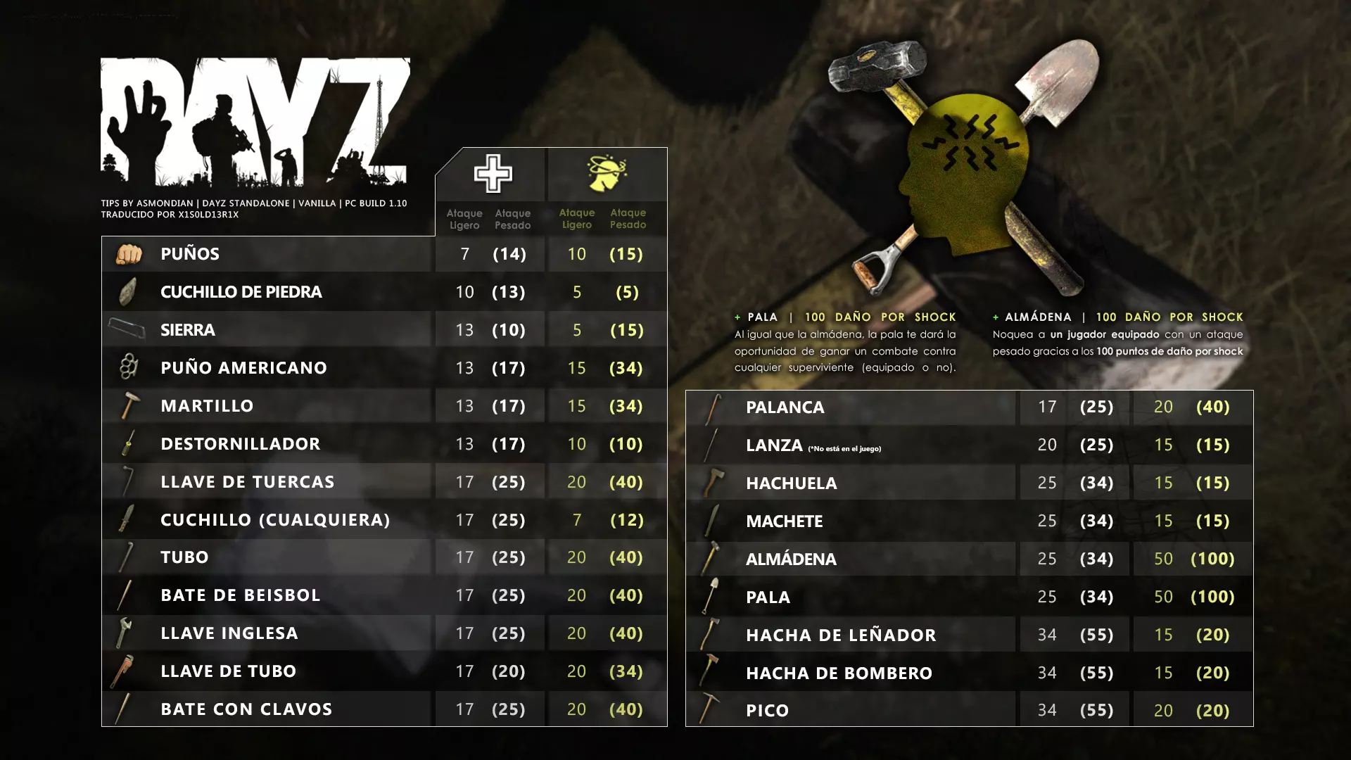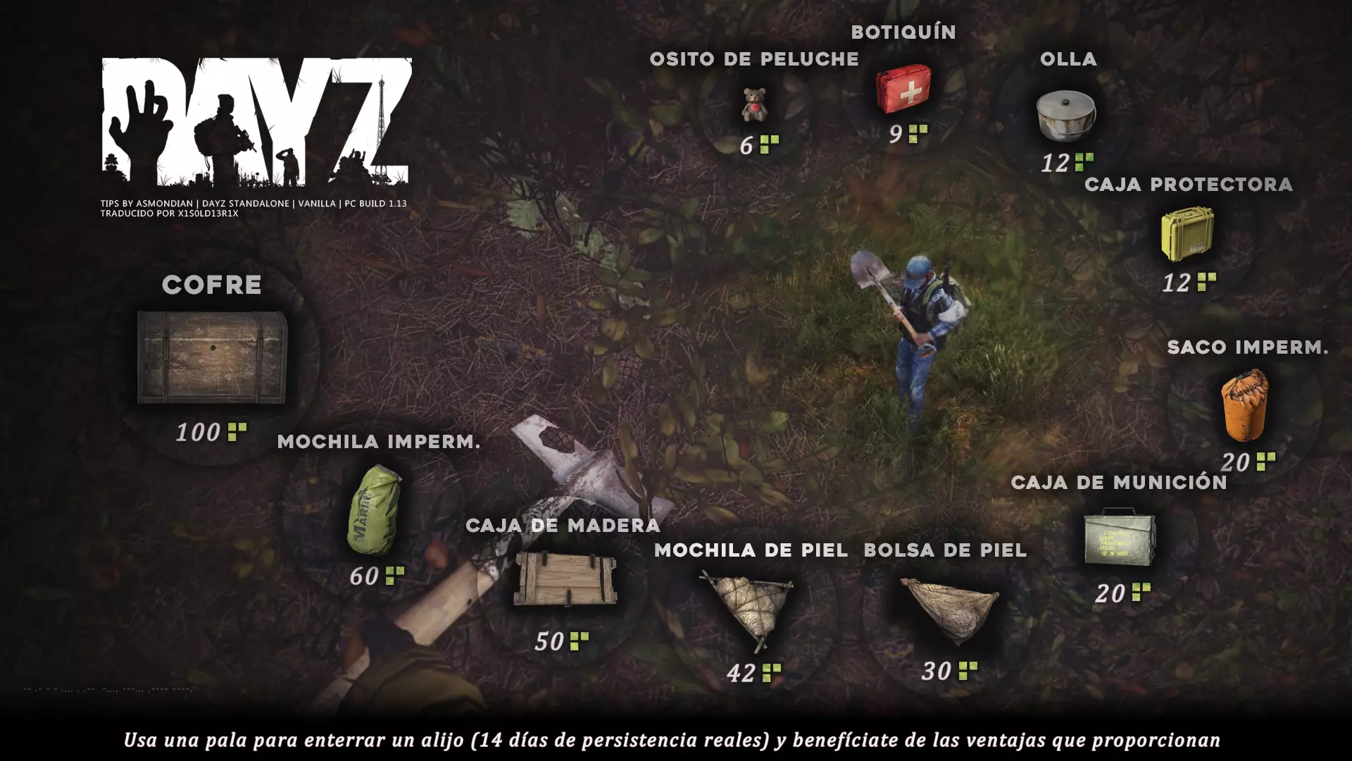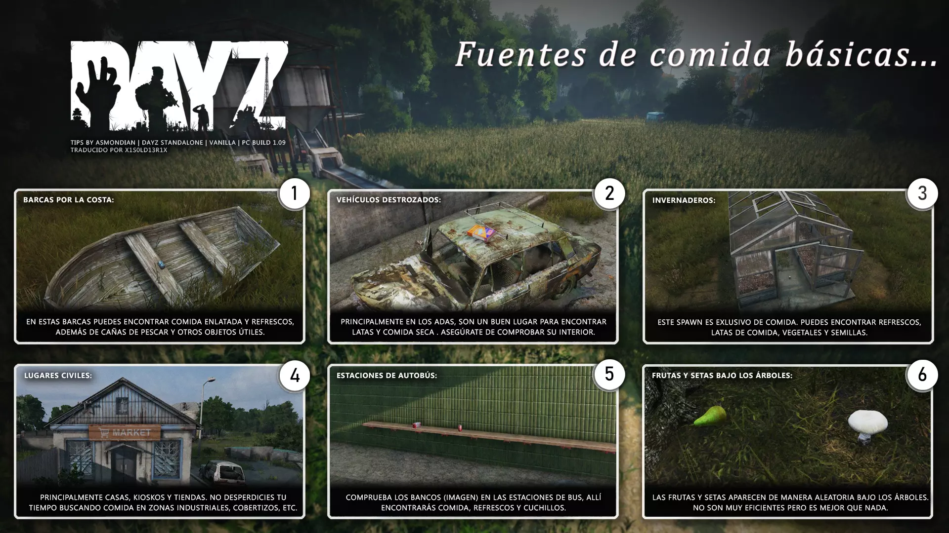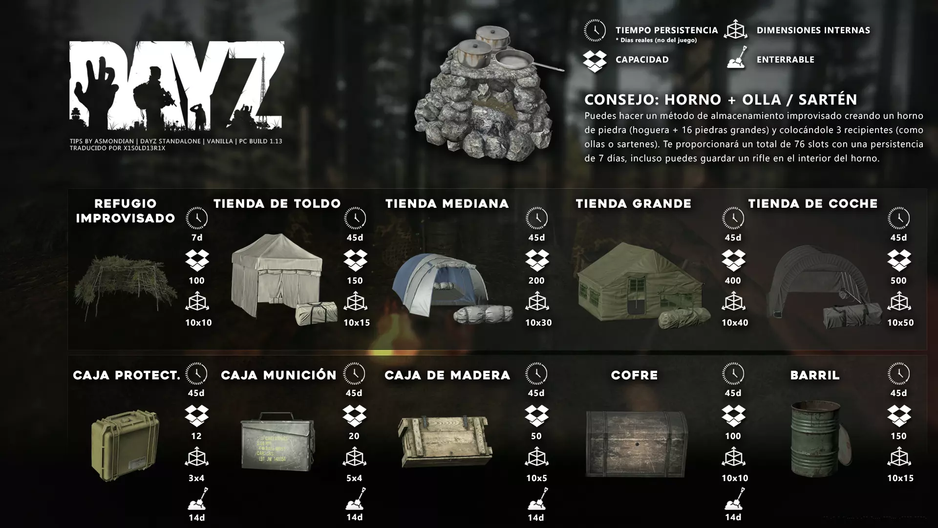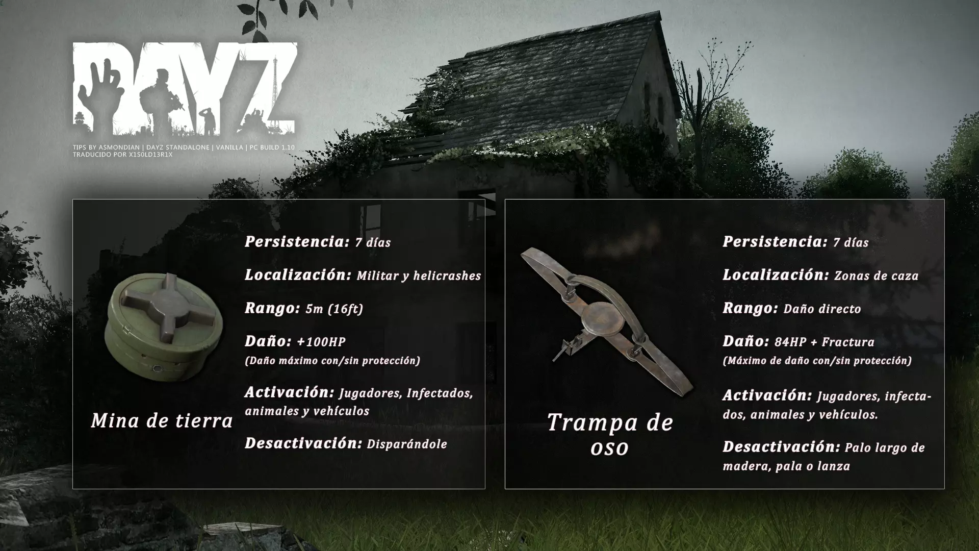 Aquí iré informando de las futuras actualizaciones de la guía. · 20/11/2020 - Guía actualizada hasta la versión 1.09 · 21/11/2020 - Actualizados iconos de la sección "Indicadores HUD" a la 1.10 y añadido un gif. Añadida nueva info acerca del cuchillo improvisado en la sección "[Primeros pasos] El cuchillo" de la guía básica. · 22/11/2020 - Texto de la sección de "Caza" de la guía de supervivencia actualizado a la 1.10. Añadida nueva info en la sección de "[Medicamentos] Clases" de la guía médica con información relativa a los medicamentos, lo mismo con la sección de " [Medicamentos] Medicina preventiva" · 23/11/2020 - La sección de materiales de construcción de la guía de base building casi se ha completado a falta de unos datos que iré añadiendo. · 24/11/2020 - La sección "[Info] RP orgánico con Facciones" de la guía de servers ha sido reescrita de manera más breve. · 25/11/2020 - Las imágenes de la sección "[Almacenamiento] Tipos" de la guía de base building han sido redimensionadas quedando más cómodo visualmente a la hora de leer. · 26/11/2020 - Creada nueva sección llamada "[Refugios] Materiales requeridos" en la guía de base building donde se explica todo lo relativo a la creación de refugios, faltan detalles por completar pero se explica todo detalladamente. Añadido el refugio a la sección de " [Almacenamiento] Tipos" de la guía de base building ya que es una forma más de guardar tu equipo. · 27/11/2020 - Añadida infografía de Asmond sobre las enfermedades a la sección de [Enfermedades] Nociones básicas de la guía médica, está en inglés aún pero actualizada a la versión 1.10 · 01/12/2020 - Se ha actualizado la sección [Info] La cocina (1ª Parte), en concreto la parte de cocinar a la brasa con el palo largo de madera, ahora requiere afilarlo antes con alguna herramienta cortante para poder clavar el trozo de comida en el, para posteriormente cocinarla. · 03/12/2020 - Se ha actualizado la sección [Info] Frío y lluvia a la versión 1.10 de la guía de supervivencia. · 06/12/2020 - El texto de la sección [Info] La cocina (1ª Parte) de la guía de supervivencia se ha actualizado a la 1.10 (solo texto, no las infografías) lo más relevante que se ha añadido es la explicación del nuevo método de cocina (deshidratación) que sirve para que la comida no se pudra. · 07/12/2020 - Añadida nueva sección en la guía de crafting llamada "Fabricación con cuero" aquí aprenderás a fabricar prendas de vestir mediante piel animal. · 12/12/2020 - Actualizada infografía de Asmondian en la sección Frío y lluvia de la guía de supervivencia en la relación a las prendas de ropa. · 17/12/2020 - Añadida sección llamada "[Defensas] Reforzar una base" en la guía de basebuilding donde aprenderemos los elementos básicos para proteger nuestra base. También se ha añadido una infografía de Asmond muy útil en "Indicadores HUD" de la guía básica en la que se resumen los principales indicadores HUD. · 26/12/2020 - La guía de crafting ahora también será de loot para añadir allí información relativa a éste. Se han añadido dos nuevas secciones a la guía de crafting y loot llamadas "[Reparación] reparar loot" y "[Baterías] duración" aquí podremos ver todas las herramientas de reparación y los objetos que reparar y por otro lado las distintas baterías que existen y la duración que tienen en cada objeto. · 04/01/2021 - Se han traducido y actualizado las imágenes a la versión 1.10 de las siguientes secciones: [Primeros pasos] Indicadores HUD, [Enfermedad] Cólera y [Medicamentos] Medicina preventiva. · 05/01/2021 - Se han traducido y actualizado las imágenes a la versión 1.10 de las siguientes secciones: [Medicamentos] Clases, [Crafting] Avanzado, [Info] Pesca, [Crafting] Armas recortadas y [Daños] Fracturas. En la sección [Primeros pasos] Comida se ha añadido un apartado explicando la descomposición de la comida y una imagen explicativa con la duración. · 07/01/2021 - Se ha editado y añadido nueva información a la sección [Info] Zombies y traducido la imagen explicativa de la guía de basebuilding [Materiales] Muro / Puerta y [Materiales] Torre de vigilancia y [Raid] Resistencia de las construcciones. · 08/01/2021 - Editada la sección [Traje Ghillie] Fabricación y tipos de la guía de armas y combate, también se ha traducido la imagen explicativa. Traducida la sección [Materiales] Mástil con bandera de la guía de basebuilding. Editada la sección [Info] Frío y lluvia de la guía de supervivencia y traducido dos imágenes explicativas, actualizada imagen explicativa principal de la sección de [Primeros pasos] Comida de la guía básica, añadidos consejos e imagenes explicativas en la sección [Combate] Nociones avanzadas de la guía de armas y municiones. · 09/01/2021 - actualizada sección [Vehículos] Clases disponibles de la guía de vehículos a la 1.10 añadiendo el camión. Editada sección " [Defensas] Reforzar una base" con nueva información muy importante a la hora de hacer una base. Añadida imagen explicativa de los valores nutricionales de la comida en la sección de [Primeros pasos] Comida de la guía básica. · 10/01/2021 - He revisado secciones y corregido algunas erratas, también se han traducido varias imágenes, la más importante la de [Enfermedades] Nociones básicas el resto son de menor importancia. · 11/01/2021 - Editada y reorganizada la sección de "Capturar y ser capturado de la guía de armas y combate" Traducidas las imágenes explicativas de la sección [Sangre] Heridas y transfusiones de la guía médica excepto la principal. Traducida imagen explicativa "[Reparación] Reparar loot" de la guía de crafting y loot. Se han traducido muchas imagen de Asmondian a nivel general en la guía. Editada la sección de raid con nuevos consejos importantes. · 15/01/2021 - Estos días he estado traduciendo la mayoría de imágenes que quedaban en inglés y corrigiendo 