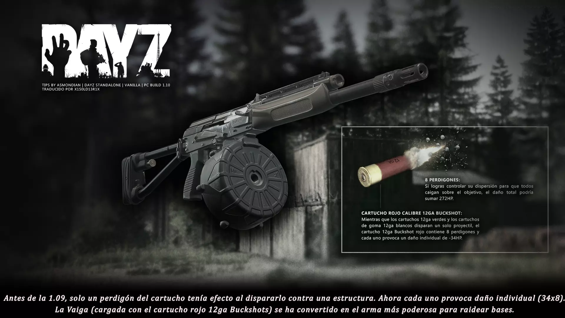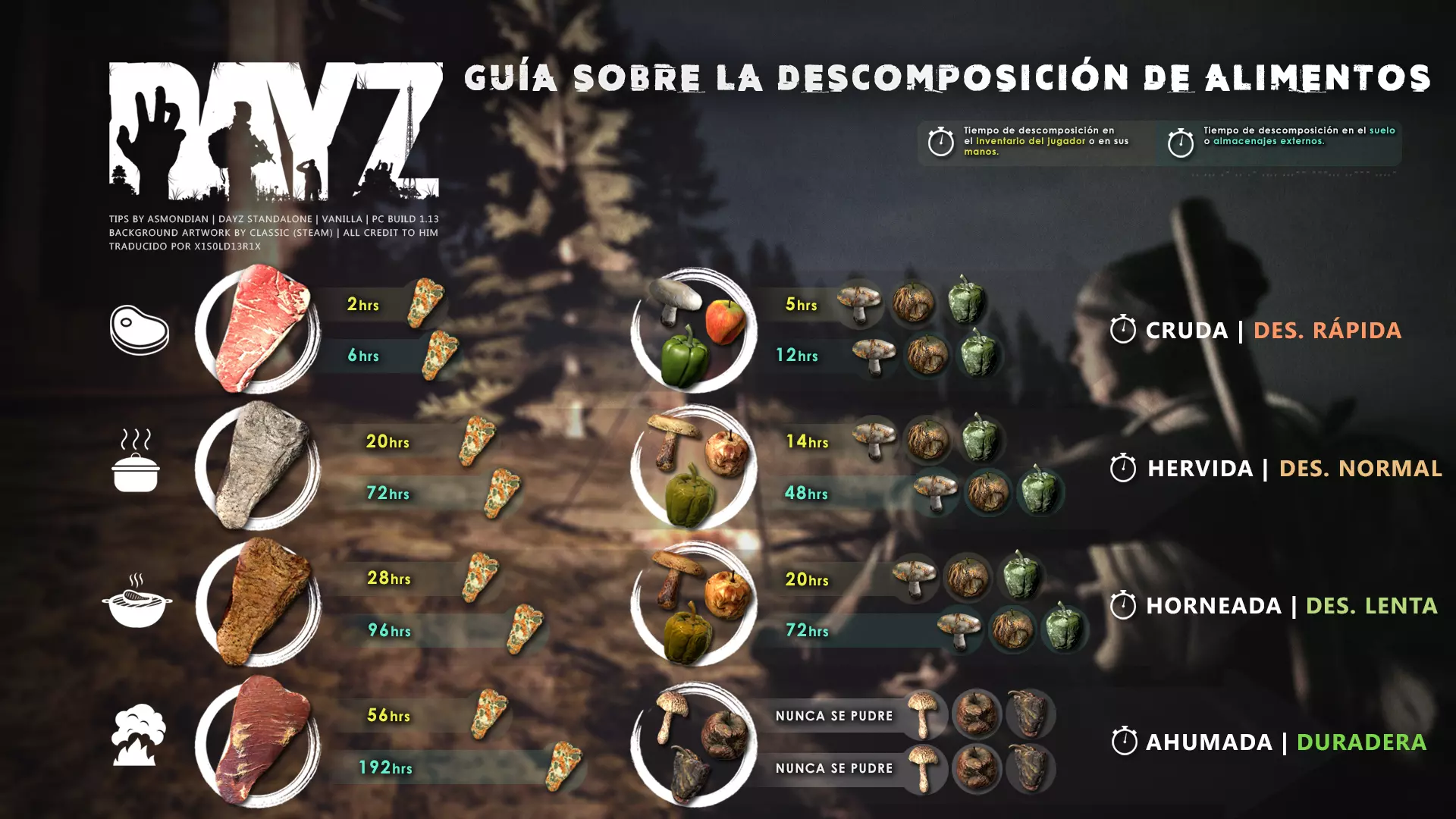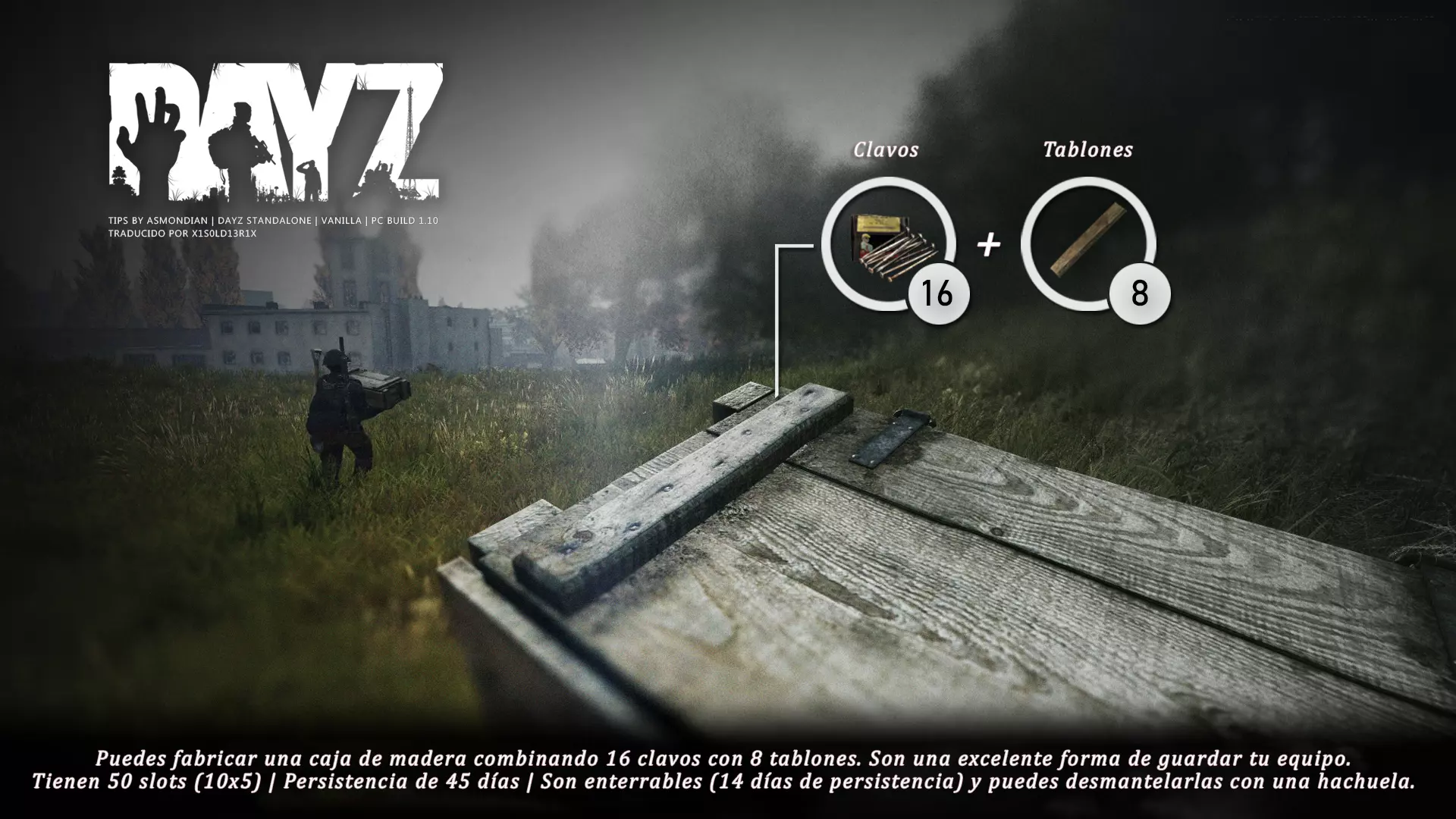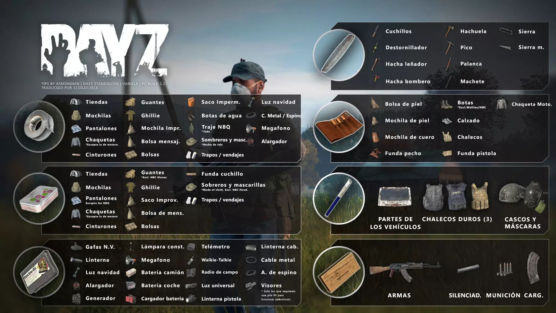 Aquí iré informando de las futuras actualizaciones de la guía. · 20/11/2020 - Guía actualizada hasta la versión 1.09 · 21/11/2020 - Actualizados iconos de la sección "Indicadores HUD" a la 1.10 y añadido un gif. Añadida nueva info acerca del cuchillo improvisado en la sección "[Primeros pasos] El cuchillo" de la guía básica. · 22/11/2020 - Texto de la sección de "Caza" de la guía de supervivencia actualizado a la 1.10. Añadida nueva info en la sección de "[Medicamentos] Clases" de la guía médica con información relativa a los medicamentos, lo mismo con la sección de " [Medicamentos] Medicina preventiva" · 23/11/2020 - La sección de materiales de construcción de la guía de base building casi se ha completado a falta de unos datos que iré añadiendo. · 24/11/2020 - La sección "[Info] RP orgánico con Facciones" de la guía de servers ha sido reescrita de manera más breve. · 25/11/2020 - Las imágenes de la sección "[Almacenamiento] Tipos" de la guía de base building han sido redimensionadas quedando más cómodo visualmente a la hora de leer. · 26/11/2020 - Creada nueva sección llamada "[Refugios] Materiales requeridos" en la guía de base building donde se explica todo lo relativo a la creación de refugios, faltan detalles por completar pero se explica todo detalladamente. Añadido el refugio a la sección de " [Almacenamiento] Tipos" de la guía de base building ya que es una forma más de guardar tu equipo. · 27/11/2020 - Añadida infografía de Asmond sobre las enfermedades a la sección de [Enfermedades] Nociones básicas de la guía médica, está en inglés aún pero actualizada a la versión 1.10 · 01/12/2020 - Se ha actualizado la sección [Info] La cocina (1ª Parte), en concreto la parte de cocinar a la brasa con el palo largo de madera, ahora requiere afilarlo antes con alguna herramienta cortante para poder clavar el trozo de comida en el, para posteriormente cocinarla. · 03/12/2020 - Se ha actualizado la sección [Info] Frío y lluvia a la versión 1.10 de la guía de supervivencia. · 06/12/2020 - El texto de la sección [Info] La cocina (1ª Parte) de la guía de supervivencia se ha actualizado a la 1.10 (solo texto, no las infografías) lo más relevante que se ha añadido es la explicación del nuevo método de cocina (deshidratación) que sirve para que la comida no se pudra. · 07/12/2020 - Añadida nueva sección en la guía de crafting llamada "Fabricación con cuero" aquí aprenderás a fabricar prendas de vestir mediante piel animal. · 12/12/2020 - Actualizada infografía de Asmondian en la sección Frío y lluvia de la guía de supervivencia en la relación a las prendas de ropa. · 17/12/2020 - Añadida sección llamada "[Defensas] Reforzar una base" en la guía de basebuilding donde aprenderemos los elementos básicos para proteger nuestra base. También se ha añadido una infografía de Asmond muy útil en "Indicadores HUD" de la guía básica en la que se resumen los principales indicadores HUD. · 26/12/2020 - La guía de crafting ahora también será de loot para añadir allí información relativa a éste. Se han añadido dos nuevas secciones a la guía de crafting y loot llamadas "[Reparación] reparar loot" y "[Baterías] duración" aquí podremos ver todas las herramientas de reparación y los objetos que reparar y por otro lado las distintas baterías que existen y la duración que tienen en cada objeto. · 04/01/2021 - Se han traducido y actualizado las imágenes a la versión 1.10 de las siguientes secciones: [Primeros pasos] Indicadores HUD, [Enfermedad] Cólera y [Medicamentos] Medicina preventiva. · 05/01/2021 - Se han traducido y actualizado las imágenes a la versión 1.10 de las siguientes secciones: [Medicamentos] Clases, [Crafting] Avanzado, [Info] Pesca, [Crafting] Armas recortadas y [Daños] Fracturas. En la sección [Primeros pasos] Comida se ha añadido un apartado explicando la descomposición de la comida y una imagen explicativa con la duración. · 07/01/2021 - Se ha editado y añadido nueva información a la sección [Info] Zombies y traducido la imagen explicativa de la guía de basebuilding [Materiales] Muro / Puerta y [Materiales] Torre de vigilancia y [Raid] Resistencia de las construcciones. · 08/01/2021 - Editada la sección [Traje Ghillie] Fabricación y tipos de la guía de armas y combate, también se ha traducido la imagen explicativa. Traducida la sección [Materiales] Mástil con bandera de la guía de basebuilding. Editada la sección [Info] Frío y lluvia de la guía de supervivencia y traducido dos imágenes explicativas, actualizada imagen explicativa principal de la sección de [Primeros pasos] Comida de la guía básica, añadidos consejos e imagenes explicativas en la sección [Combate] Nociones avanzadas de la guía de armas y municiones. · 09/01/2021 - actualizada sección [Vehículos] Clases disponibles de la guía de vehículos a la 1.10 añadiendo el camión. Editada sección " [Defensas] Reforzar una base" con nueva información muy importante a la hora de hacer una base. Añadida imagen explicativa de los valores nutricionales de la comida en la sección de [Primeros pasos] Comida de la guía básica. · 10/01/2021 - He revisado secciones y corregido algunas erratas, también se han traducido varias imágenes, la más importante la de [Enfermedades] Nociones básicas el resto son de menor importancia. · 11/01/2021 - Editada y reorganizada la sección de "Capturar y ser capturado de la guía de armas y combate" Traducidas las imágenes explicativas de la sección [Sangre] Heridas y transfusiones de la guía médica excepto la principal. Traducida imagen explicativa "[Reparación] Reparar loot" de la guía de crafting y loot. Se han traducido muchas imagen de Asmondian a nivel general en la guía. Editada la sección de raid con nuevos consejos importantes. · 15/01/2021 - Estos días he estado traduciendo la mayoría de imágenes que quedaban en inglés y corrigiendo 