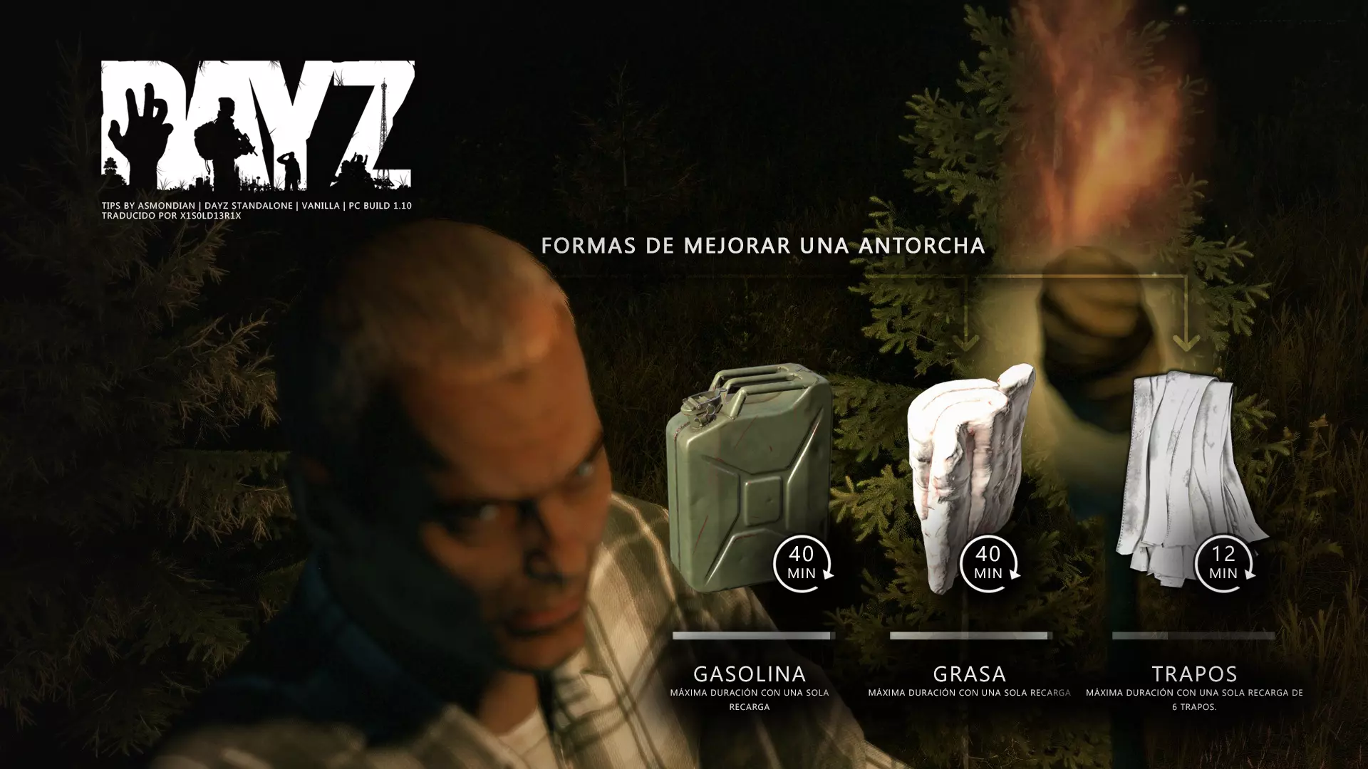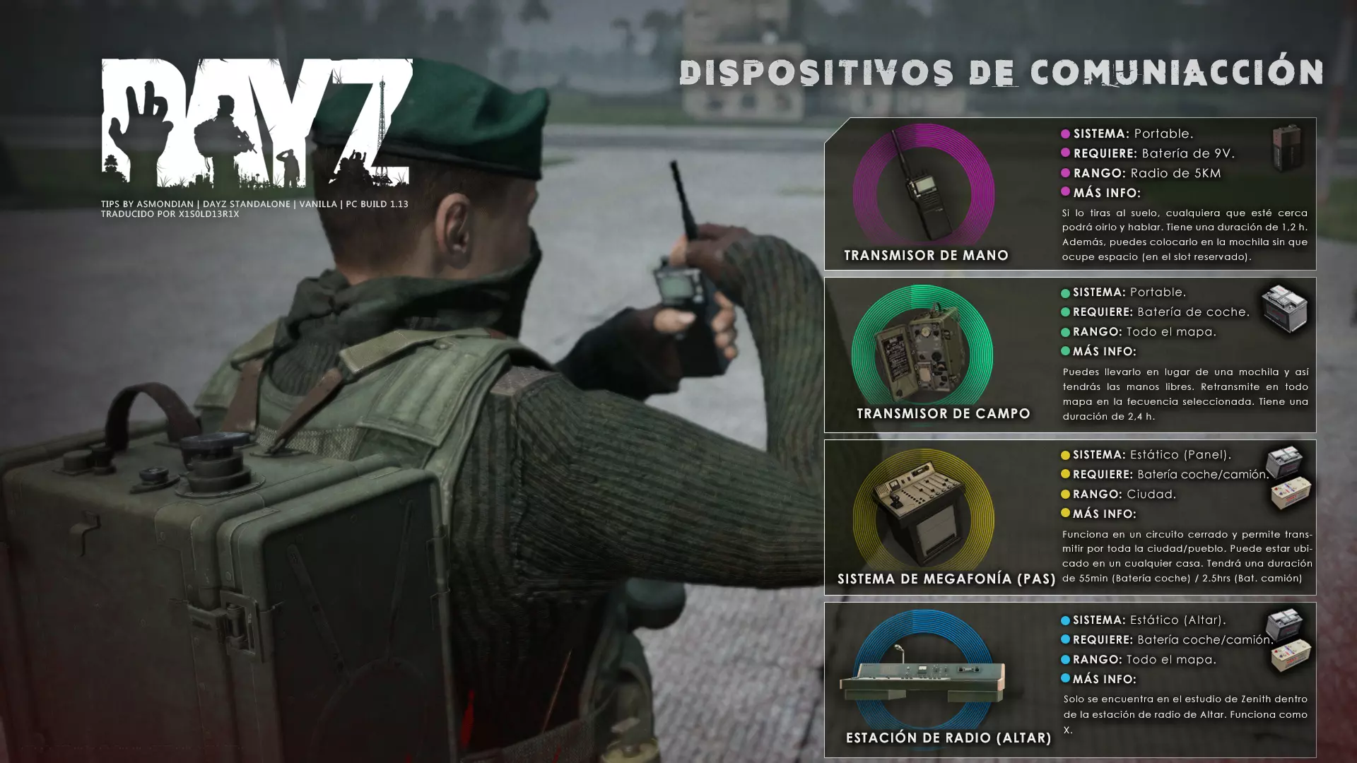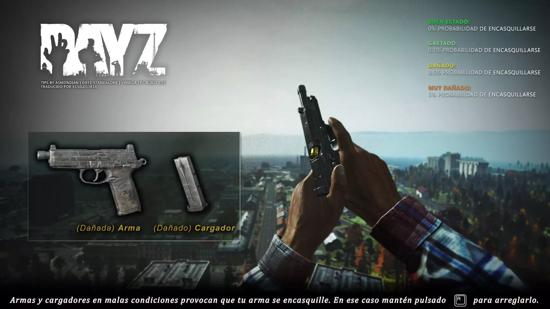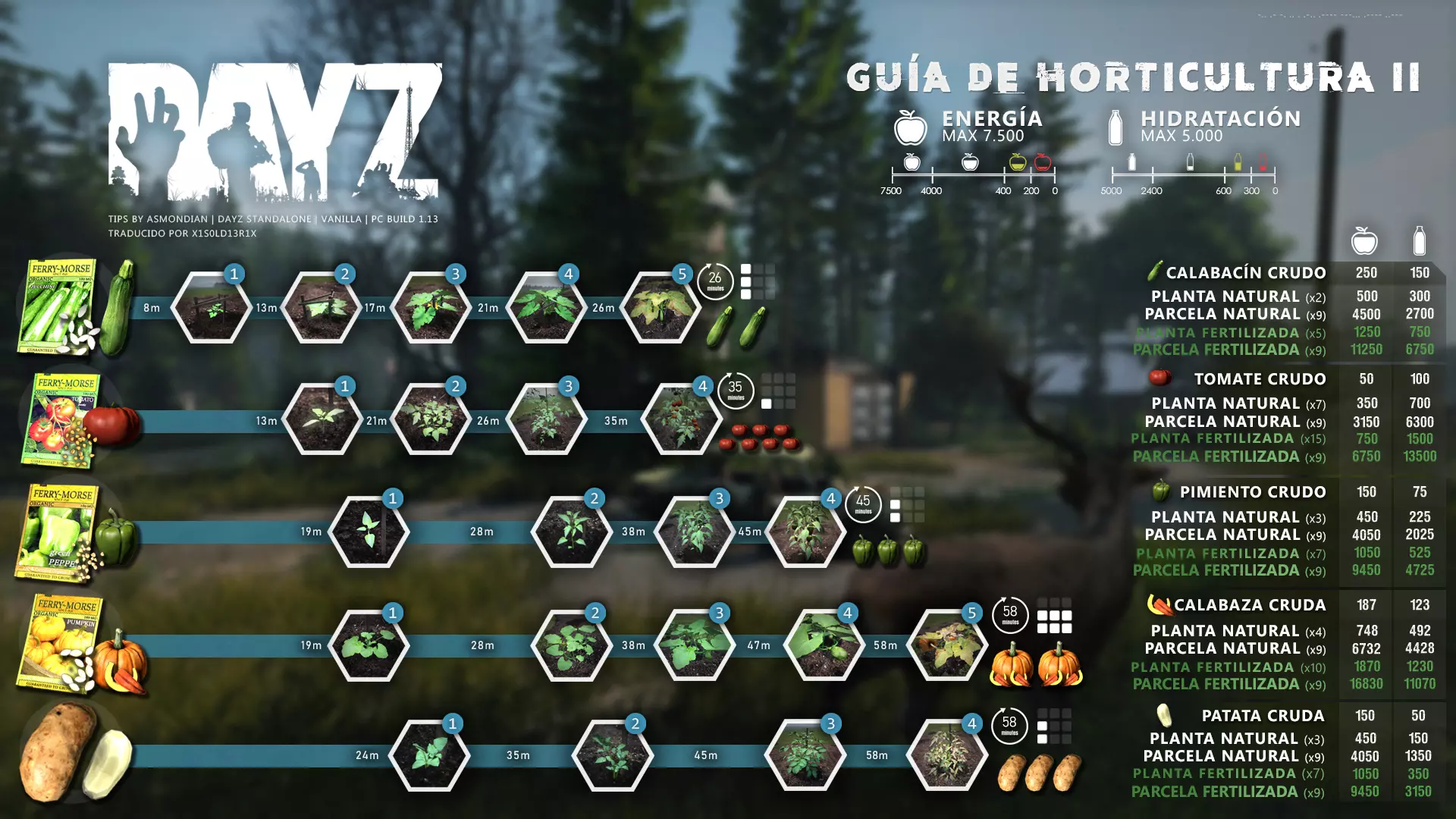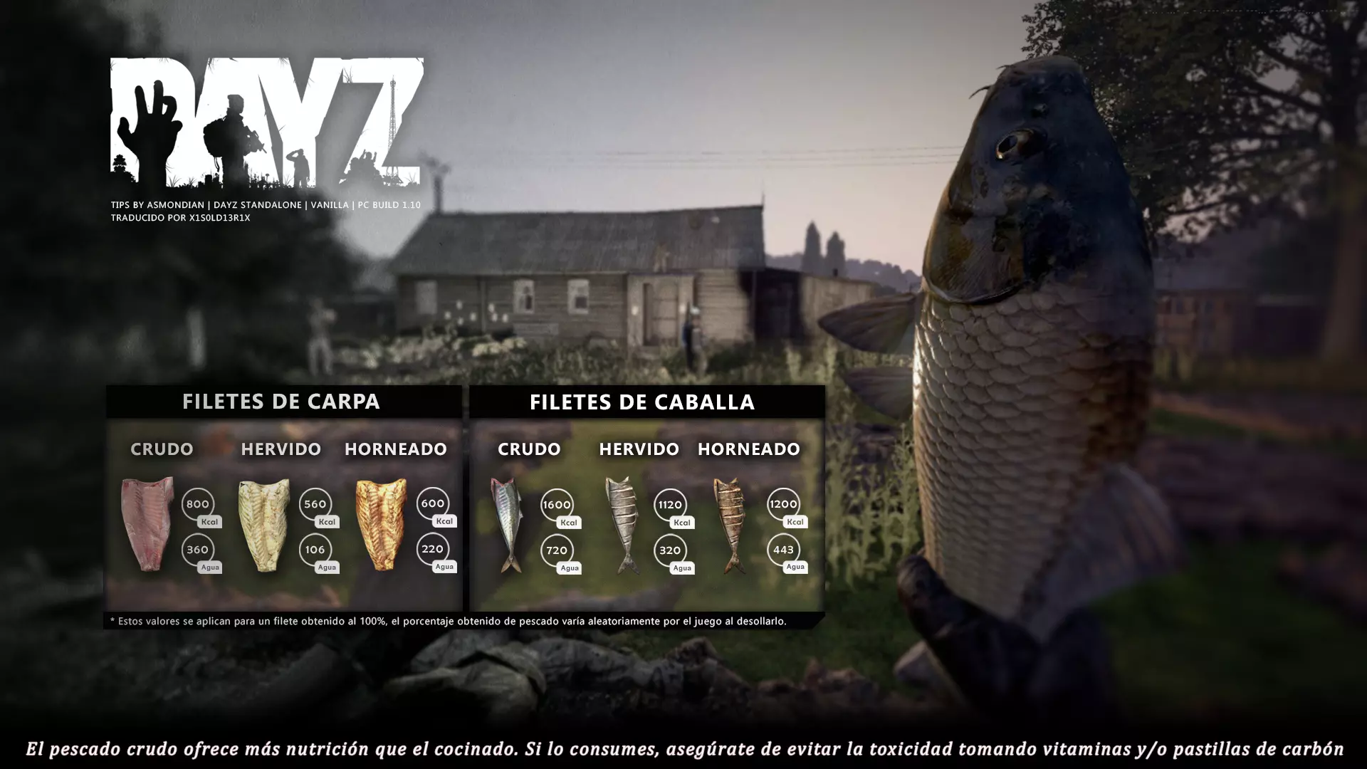 Aquí iré informando de las futuras actualizaciones de la guía. · 20/11/2020 - Guía actualizada hasta la versión 1.09 · 21/11/2020 - Actualizados iconos de la sección "Indicadores HUD" a la 1.10 y añadido un gif. Añadida nueva info acerca del cuchillo improvisado en la sección "[Primeros pasos] El cuchillo" de la guía básica. · 22/11/2020 - Texto de la sección de "Caza" de la guía de supervivencia actualizado a la 1.10. Añadida nueva info en la sección de "[Medicamentos] Clases" de la guía médica con información relativa a los medicamentos, lo mismo con la sección de " [Medicamentos] Medicina preventiva" · 23/11/2020 - La sección de materiales de construcción de la guía de base building casi se ha completado a falta de unos datos que iré añadiendo. · 24/11/2020 - La sección "[Info] RP orgánico con Facciones" de la guía de servers ha sido reescrita de manera más breve. · 25/11/2020 - Las imágenes de la sección "[Almacenamiento] Tipos" de la guía de base building han sido redimensionadas quedando más cómodo visualmente a la hora de leer. · 26/11/2020 - Creada nueva sección llamada "[Refugios] Materiales requeridos" en la guía de base building donde se explica todo lo relativo a la creación de refugios, faltan detalles por completar pero se explica todo detalladamente. Añadido el refugio a la sección de " [Almacenamiento] Tipos" de la guía de base building ya que es una forma más de guardar tu equipo. · 27/11/2020 - Añadida infografía de Asmond sobre las enfermedades a la sección de [Enfermedades] Nociones básicas de la guía médica, está en inglés aún pero actualizada a la versión 1.10 · 01/12/2020 - Se ha actualizado la sección [Info] La cocina (1ª Parte), en concreto la parte de cocinar a la brasa con el palo largo de madera, ahora requiere afilarlo antes con alguna herramienta cortante para poder clavar el trozo de comida en el, para posteriormente cocinarla. · 03/12/2020 - Se ha actualizado la sección [Info] Frío y lluvia a la versión 1.10 de la guía de supervivencia. · 06/12/2020 - El texto de la sección [Info] La cocina (1ª Parte) de la guía de supervivencia se ha actualizado a la 1.10 (solo texto, no las infografías) lo más relevante que se ha añadido es la explicación del nuevo método de cocina (deshidratación) que sirve para que la comida no se pudra. · 07/12/2020 - Añadida nueva sección en la guía de crafting llamada "Fabricación con cuero" aquí aprenderás a fabricar prendas de vestir mediante piel animal. · 12/12/2020 - Actualizada infografía de Asmondian en la sección Frío y lluvia de la guía de supervivencia en la relación a las prendas de ropa. · 17/12/2020 - Añadida sección llamada "[Defensas] Reforzar una base" en la guía de basebuilding donde aprenderemos los elementos básicos para proteger nuestra base. También se ha añadido una infografía de Asmond muy útil en "Indicadores HUD" de la guía básica en la que se resumen los principales indicadores HUD. · 26/12/2020 - La guía de crafting ahora también será de loot para añadir allí información relativa a éste. Se han añadido dos nuevas secciones a la guía de crafting y loot llamadas "[Reparación] reparar loot" y "[Baterías] duración" aquí podremos ver todas las herramientas de reparación y los objetos que reparar y por otro lado las distintas baterías que existen y la duración que tienen en cada objeto. · 04/01/2021 - Se han traducido y actualizado las imágenes a la versión 1.10 de las siguientes secciones: [Primeros pasos] Indicadores HUD, [Enfermedad] Cólera y [Medicamentos] Medicina preventiva. · 05/01/2021 - Se han traducido y actualizado las imágenes a la versión 1.10 de las siguientes secciones: [Medicamentos] Clases, [Crafting] Avanzado, [Info] Pesca, [Crafting] Armas recortadas y [Daños] Fracturas. En la sección [Primeros pasos] Comida se ha añadido un apartado explicando la descomposición de la comida y una imagen explicativa con la duración. · 07/01/2021 - Se ha editado y añadido nueva información a la sección [Info] Zombies y traducido la imagen explicativa de la guía de basebuilding [Materiales] Muro / Puerta y [Materiales] Torre de vigilancia y [Raid] Resistencia de las construcciones. · 08/01/2021 - Editada la sección [Traje Ghillie] Fabricación y tipos de la guía de armas y combate, también se ha traducido la imagen explicativa. Traducida la sección [Materiales] Mástil con bandera de la guía de basebuilding. Editada la sección [Info] Frío y lluvia de la guía de supervivencia y traducido dos imágenes explicativas, actualizada imagen explicativa principal de la sección de [Primeros pasos] Comida de la guía básica, añadidos consejos e imagenes explicativas en la sección [Combate] Nociones avanzadas de la guía de armas y municiones. · 09/01/2021 - actualizada sección [Vehículos] Clases disponibles de la guía de vehículos a la 1.10 añadiendo el camión. Editada sección " [Defensas] Reforzar una base" con nueva información muy importante a la hora de hacer una base. Añadida imagen explicativa de los valores nutricionales de la comida en la sección de [Primeros pasos] Comida de la guía básica. · 10/01/2021 - He revisado secciones y corregido algunas erratas, también se han traducido varias imágenes, la más importante la de [Enfermedades] Nociones básicas el resto son de menor importancia. · 11/01/2021 - Editada y reorganizada la sección de "Capturar y ser capturado de la guía de armas y combate" Traducidas las imágenes explicativas de la sección [Sangre] Heridas y transfusiones de la guía médica excepto la principal. Traducida imagen explicativa "[Reparación] Reparar loot" de la guía de crafting y loot. Se han traducido muchas imagen de Asmondian a nivel general en la guía. Editada la sección de raid con nuevos consejos importantes. · 15/01/2021 - Estos días he estado traduciendo la mayoría de imágenes que quedaban en inglés y corrigiendo 