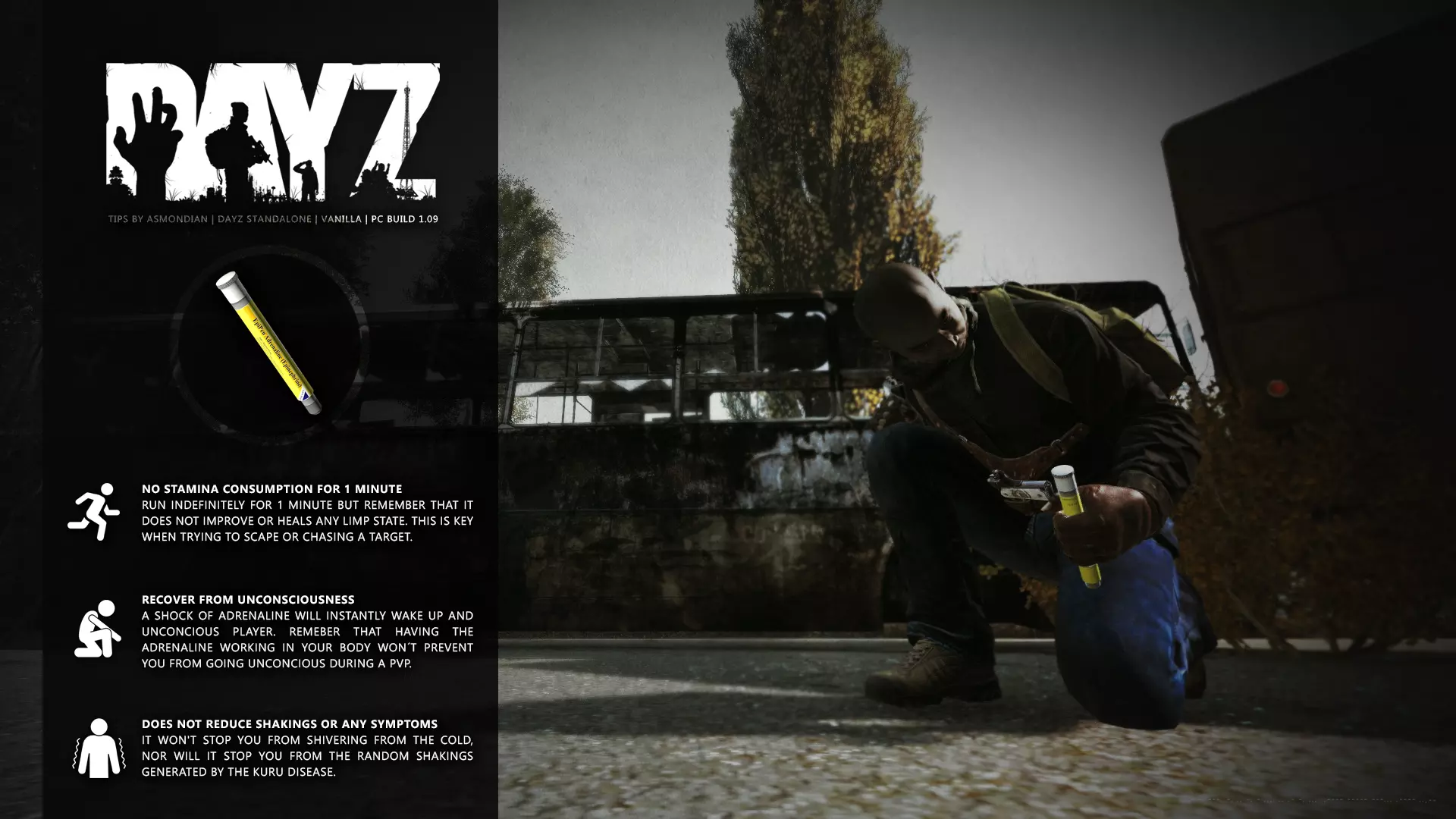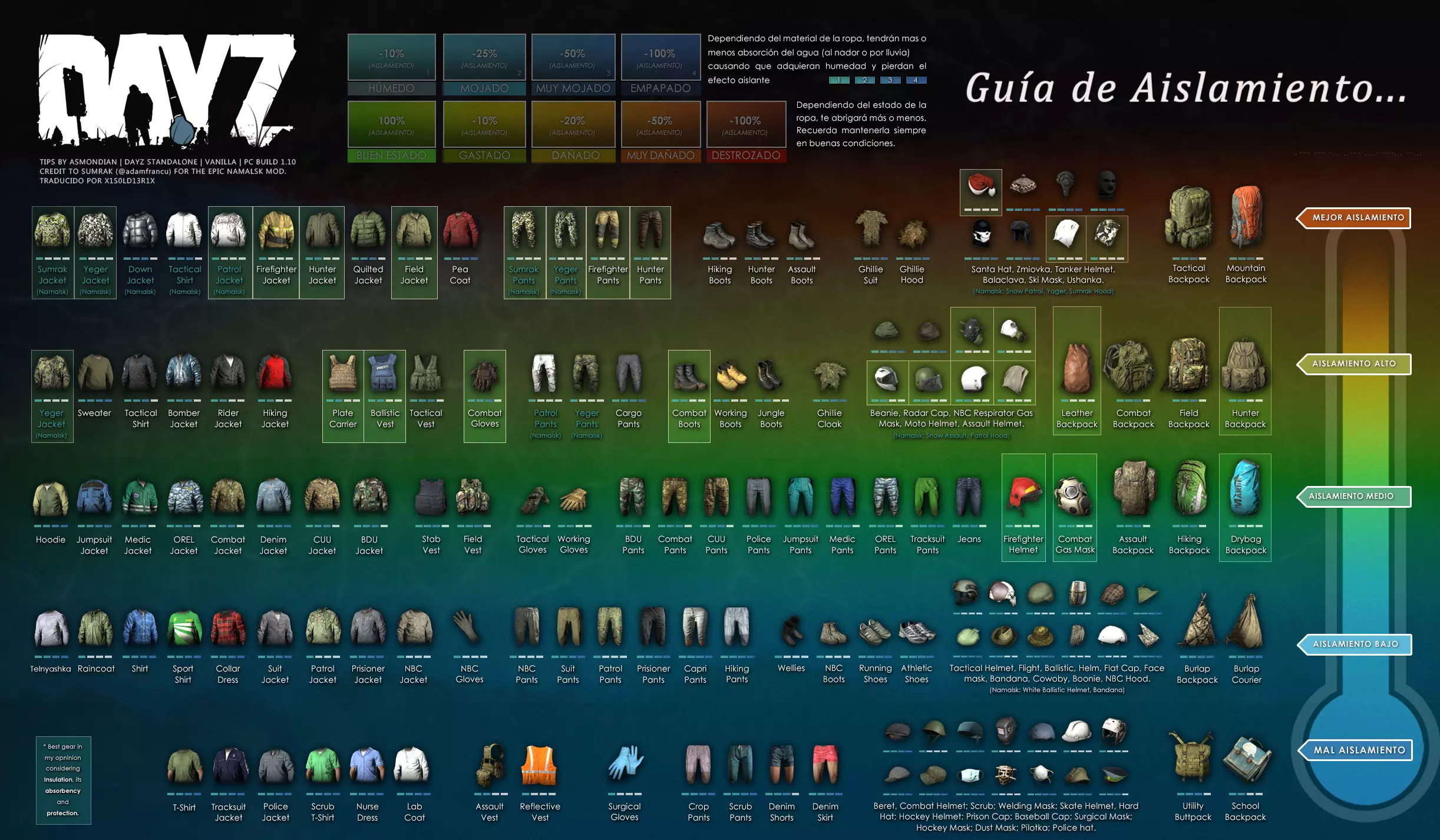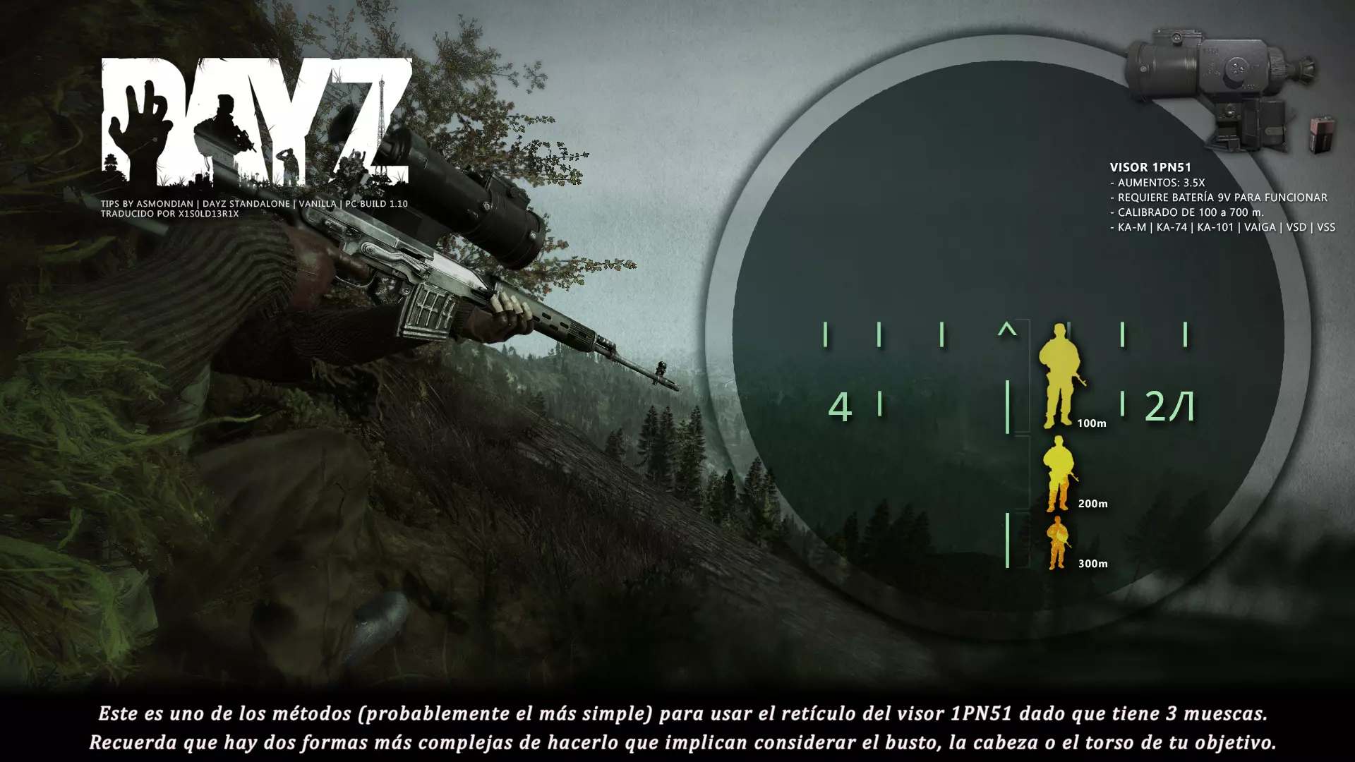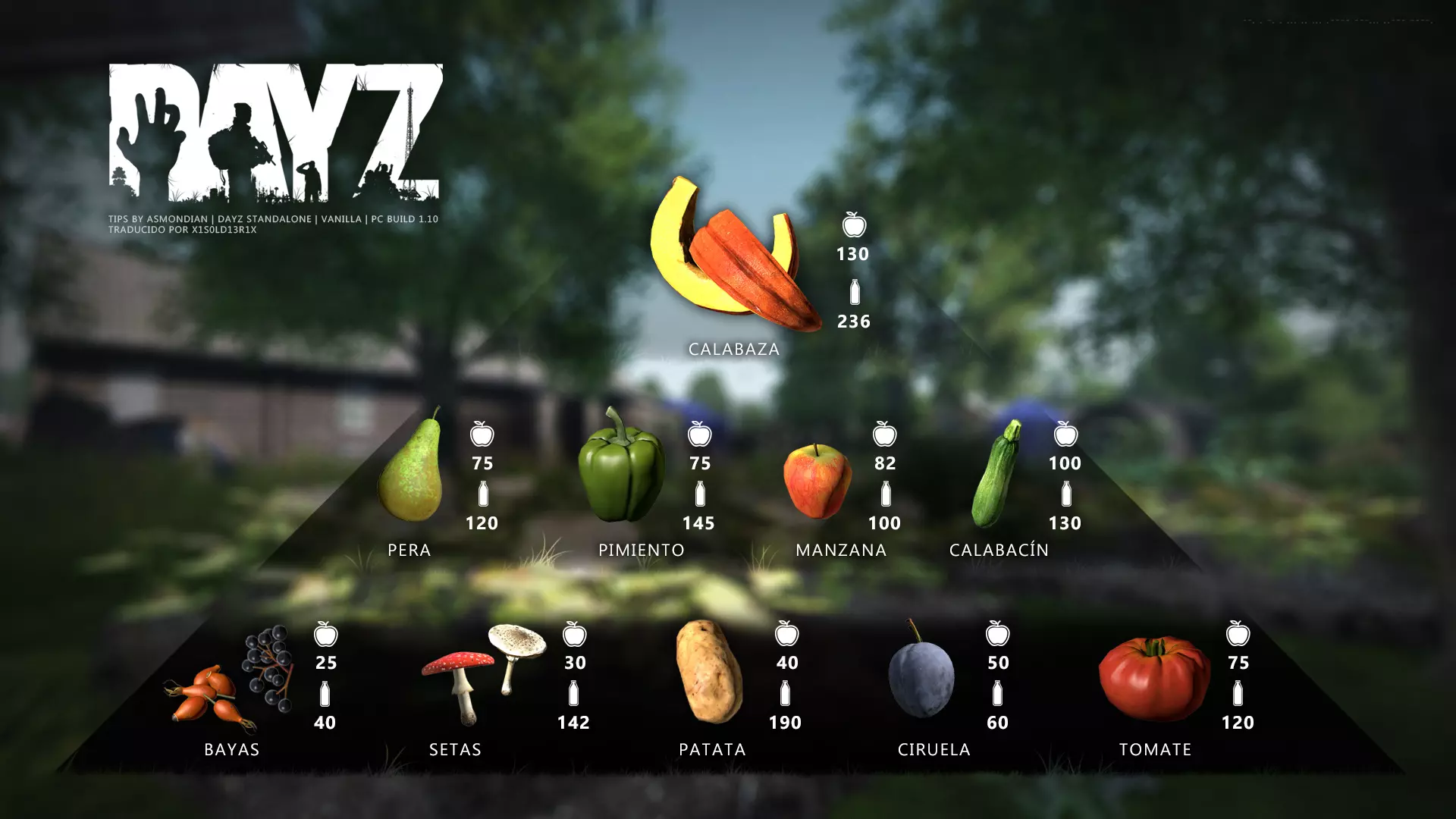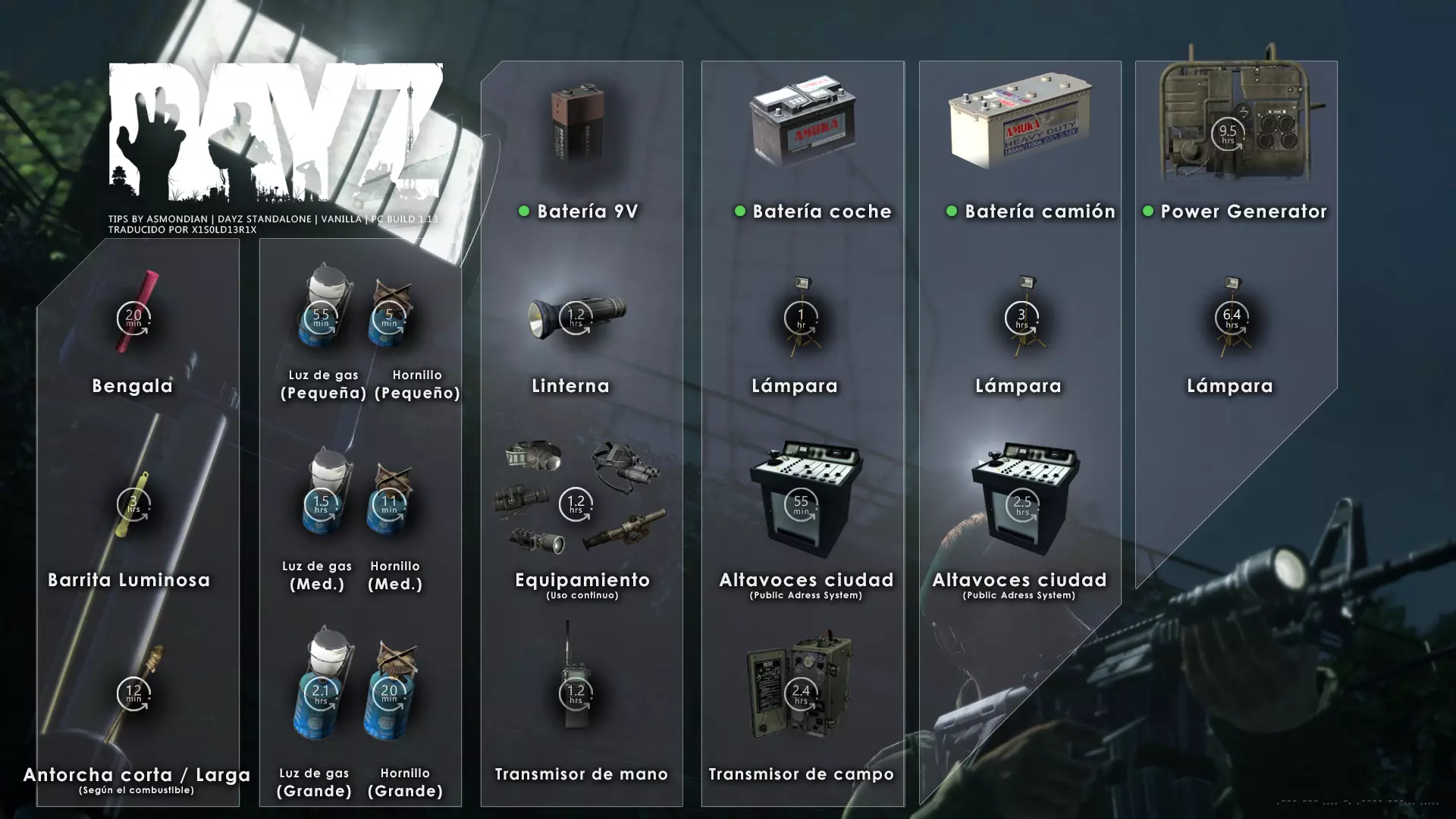 Aquí iré informando de las futuras actualizaciones de la guía. · 20/11/2020 - Guía actualizada hasta la versión 1.09 · 21/11/2020 - Actualizados iconos de la sección "Indicadores HUD" a la 1.10 y añadido un gif. Añadida nueva info acerca del cuchillo improvisado en la sección "[Primeros pasos] El cuchillo" de la guía básica. · 22/11/2020 - Texto de la sección de "Caza" de la guía de supervivencia actualizado a la 1.10. Añadida nueva info en la sección de "[Medicamentos] Clases" de la guía médica con información relativa a los medicamentos, lo mismo con la sección de " [Medicamentos] Medicina preventiva" · 23/11/2020 - La sección de materiales de construcción de la guía de base building casi se ha completado a falta de unos datos que iré añadiendo. · 24/11/2020 - La sección "[Info] RP orgánico con Facciones" de la guía de servers ha sido reescrita de manera más breve. · 25/11/2020 - Las imágenes de la sección "[Almacenamiento] Tipos" de la guía de base building han sido redimensionadas quedando más cómodo visualmente a la hora de leer. · 26/11/2020 - Creada nueva sección llamada "[Refugios] Materiales requeridos" en la guía de base building donde se explica todo lo relativo a la creación de refugios, faltan detalles por completar pero se explica todo detalladamente. Añadido el refugio a la sección de " [Almacenamiento] Tipos" de la guía de base building ya que es una forma más de guardar tu equipo. · 27/11/2020 - Añadida infografía de Asmond sobre las enfermedades a la sección de [Enfermedades] Nociones básicas de la guía médica, está en inglés aún pero actualizada a la versión 1.10 · 01/12/2020 - Se ha actualizado la sección [Info] La cocina (1ª Parte), en concreto la parte de cocinar a la brasa con el palo largo de madera, ahora requiere afilarlo antes con alguna herramienta cortante para poder clavar el trozo de comida en el, para posteriormente cocinarla. · 03/12/2020 - Se ha actualizado la sección [Info] Frío y lluvia a la versión 1.10 de la guía de supervivencia. · 06/12/2020 - El texto de la sección [Info] La cocina (1ª Parte) de la guía de supervivencia se ha actualizado a la 1.10 (solo texto, no las infografías) lo más relevante que se ha añadido es la explicación del nuevo método de cocina (deshidratación) que sirve para que la comida no se pudra. · 07/12/2020 - Añadida nueva sección en la guía de crafting llamada "Fabricación con cuero" aquí aprenderás a fabricar prendas de vestir mediante piel animal. · 12/12/2020 - Actualizada infografía de Asmondian en la sección Frío y lluvia de la guía de supervivencia en la relación a las prendas de ropa. · 17/12/2020 - Añadida sección llamada "[Defensas] Reforzar una base" en la guía de basebuilding donde aprenderemos los elementos básicos para proteger nuestra base. También se ha añadido una infografía de Asmond muy útil en "Indicadores HUD" de la guía básica en la que se resumen los principales indicadores HUD. · 26/12/2020 - La guía de crafting ahora también será de loot para añadir allí información relativa a éste. Se han añadido dos nuevas secciones a la guía de crafting y loot llamadas "[Reparación] reparar loot" y "[Baterías] duración" aquí podremos ver todas las herramientas de reparación y los objetos que reparar y por otro lado las distintas baterías que existen y la duración que tienen en cada objeto. · 04/01/2021 - Se han traducido y actualizado las imágenes a la versión 1.10 de las siguientes secciones: [Primeros pasos] Indicadores HUD, [Enfermedad] Cólera y [Medicamentos] Medicina preventiva. · 05/01/2021 - Se han traducido y actualizado las imágenes a la versión 1.10 de las siguientes secciones: [Medicamentos] Clases, [Crafting] Avanzado, [Info] Pesca, [Crafting] Armas recortadas y [Daños] Fracturas. En la sección [Primeros pasos] Comida se ha añadido un apartado explicando la descomposición de la comida y una imagen explicativa con la duración. · 07/01/2021 - Se ha editado y añadido nueva información a la sección [Info] Zombies y traducido la imagen explicativa de la guía de basebuilding [Materiales] Muro / Puerta y [Materiales] Torre de vigilancia y [Raid] Resistencia de las construcciones. · 08/01/2021 - Editada la sección [Traje Ghillie] Fabricación y tipos de la guía de armas y combate, también se ha traducido la imagen explicativa. Traducida la sección [Materiales] Mástil con bandera de la guía de basebuilding. Editada la sección [Info] Frío y lluvia de la guía de supervivencia y traducido dos imágenes explicativas, actualizada imagen explicativa principal de la sección de [Primeros pasos] Comida de la guía básica, añadidos consejos e imagenes explicativas en la sección [Combate] Nociones avanzadas de la guía de armas y municiones. · 09/01/2021 - actualizada sección [Vehículos] Clases disponibles de la guía de vehículos a la 1.10 añadiendo el camión. Editada sección " [Defensas] Reforzar una base" con nueva información muy importante a la hora de hacer una base. Añadida imagen explicativa de los valores nutricionales de la comida en la sección de [Primeros pasos] Comida de la guía básica. · 10/01/2021 - He revisado secciones y corregido algunas erratas, también se han traducido varias imágenes, la más importante la de [Enfermedades] Nociones básicas el resto son de menor importancia. · 11/01/2021 - Editada y reorganizada la sección de "Capturar y ser capturado de la guía de armas y combate" Traducidas las imágenes explicativas de la sección [Sangre] Heridas y transfusiones de la guía médica excepto la principal. Traducida imagen explicativa "[Reparación] Reparar loot" de la guía de crafting y loot. Se han traducido muchas imagen de Asmondian a nivel general en la guía. Editada la sección de raid con nuevos consejos importantes. · 15/01/2021 - Estos días he estado traduciendo la mayoría de imágenes que quedaban en inglés y corrigiendo 