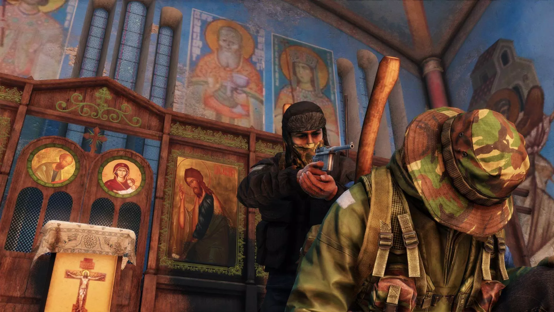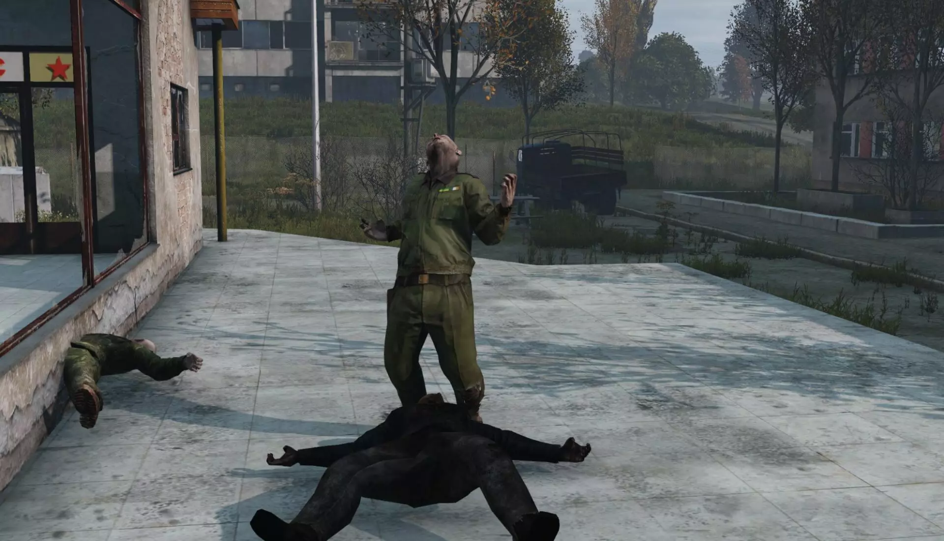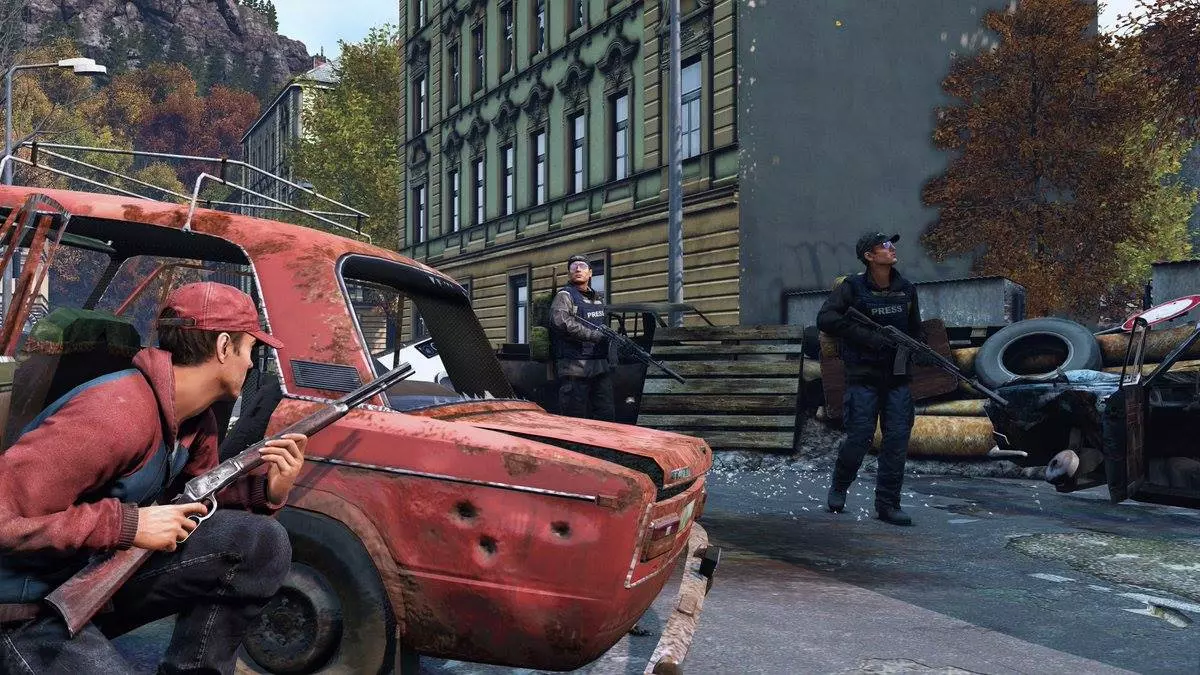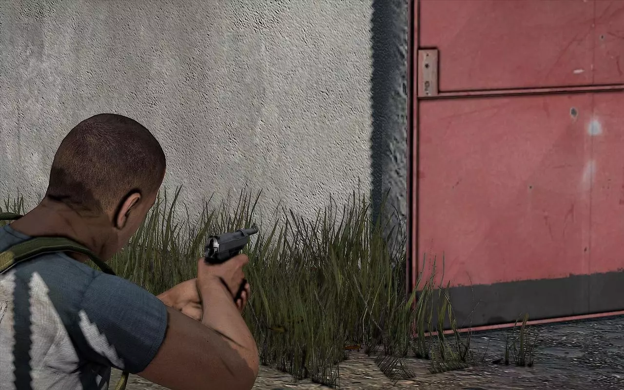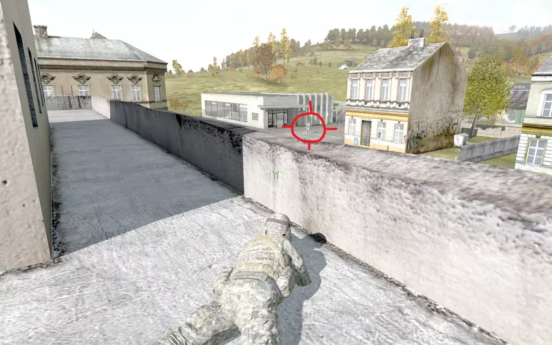 中间的玩家正安全地隔墙观察被红色标记的玩家,他能看到对方的武器、服装、身体状态、人数以及最可能采取的行动方向,同时自身受到墙壁保护,等待进攻时机。而另一名玩家则完全无法获取信息,由于不知道自己正被监视且没有任何察觉手段,他无法预判接下来的行动。 如果中间的玩家在最佳时机开火,被观察者很可能会被击杀。即便对方幸存,其任何行动或位置都会被监视者持续关注,并在自身无风险的情况下向可能存在的队友通报。如果决定逃跑,中央玩家会知晓并在留意该区域其他潜在威胁的同时通报你的位置。 如果决定正面应对,你需要寻找掩护,中央玩家会知道你的位置并开始一场“摄像头对决”——双方互相监视,直到有人因疲惫而暴露,同时可能会向同伴泄露位置和动向。 如果决定快速突袭对方位置,你会被发现,这会让中央玩家提前行动,从建筑内占据另一个有利位置以利用摄像头。第三人称视角的真正目的是获取环境信息,但如果将其应用于《DayZ》等特定多人游戏中,玩家往往会在这类情况下滥用该视角,导致某些对抗被部分玩家认为不公平。因为在第一人称视角下,观察方需要探身并承担风险才能获取任何信息,而被观察方则有机会发现对方,这样每个玩家的个人能力就能在游戏中体现出来。为了让你有个概念,我来详细说明一下这类情况的不便之处: 第三方服务器存在以下缺点: 1. 基于蹲守的游戏风格:玩家持续蹲守,滥用第三人称向其他玩家射击。这种情况在军事区等战略要地尤为常见,这些地方经常被团队蹲守。如果你辛辛苦苦获得了一套好装备,却突然毫无反抗之力地死亡,会非常令人沮丧。游戏性缺乏吸引力:玩家失去了对周围情况未知的不安感和紧张感,以及为了探索而冒险的恐惧,尤其是在面临威胁时,因为玩家可以在不暴露自己的情况下完美观察周围环境并及时做出反应。 破坏了真实感和沉浸感:疾病症状和玩家所受伤害在体验上与第一人称视角不同,通过角色的视角,借助视觉和声音效果能带来更激动人心且强烈的体验。监视的效果大打折扣:提前监视一个区域以防范威胁是常见策略,但在任何时候都可能有玩家躲在遮蔽物(如窗户)后观察,无需暴露自己就能伺机射击。潜行完全失效:由于对方能时刻清晰地看到身后的全景,因此不可能悄悄接近他人。压制火力被移除了:另一种常见战术是向已找到掩护的敌人射击,以阻止其探头获取信息,但在第三人称视角下,玩家无需暴露自身就能判断射击来源、是否被瞄准,甚至能看到是否有人从侧面接近准备包抄,同时还能向队友通报敌人位置。 这种玩法变得更像街机游戏,也更无聊,玩家滥用第三人称视角,疯狂奔跑射击,甚至进入房屋前,会先观察下一个走廊或房间再前进。在森林等开阔区域的战斗,往往是躲在树后观察周围,直到有人不耐烦而暴露自己。战斗失衡:善于通过良好的站位利用视角的玩家可以轻松应对多个敌人。如果你在允许第三人称视角的服务器中游玩却不使用该视角,那么与其他玩家相比你将处于劣势。