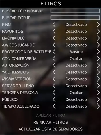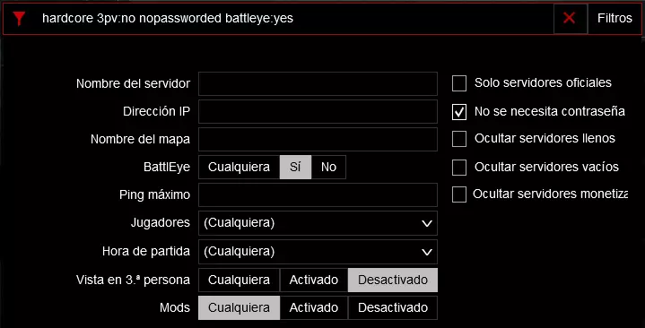 持久性是部分服务器可选择使用的参数。所有服务器为了性能考虑,都会定期进行重启。持久性的作用是,在每日重启后,玩家遗弃和放置的物品(包括基地)会在服务器中保留,直至自然消失。需要注意的是,所有物品都有各自持续数小时或数天的留存时间,这是为了防止玩家将武器藏在永远不会被发现的地方。要重置该留存时间,玩家需要与物品进行互动。例如,如果你藏了一件武器,如果在48小时内无人触碰,它就会消失。在有留存机制的服务器中,无论服务器重启多少次,该武器都要等48小时后才会消失。而在没有留存机制的服务器中,如果在48小时内服务器重启,武器就会消失,服务器也会清理掉所有被遗弃的物品。事实上,服务器通常不会标明持久性参数,但一般来说,在官方服务器中你可以找到这两种类型的服务器,而在社区服务器中,当涉及到 vanilla 模式或硬核模式时,通常会启用持久性。如果服务器允许建造基地,那么它就具有持久性。 正如我们所说,服务器分为两种类型:持久性服务器和非持久性服务器,下面我们来详细了解一下: 非持久性服务器:在非持久性服务器重启后,所有不在玩家 inventory 中的物品都会消失,并在生成点重新刷新。无持久化服务器的优势在于性能非常好,因为重启后服务器会“清理”干净,但缺点是不允许建造基地,因为基地会在重启后消失。你也不能把任何东西放在地上,因为如果发生意外重启,你没放在 inventory(物品栏)里的东西都会丢失。 持久化服务器:启用持久化的服务器重启后,物品不会消失,而是会自行逐渐消失并在刷新点重新生成。这使得装备获取会稍微困难一些,但允许你建造基地,还能避免在意外重启前意外掉落在地上的武器或物品丢失的问题。这是最推荐的选择。这些服务器的缺点是性能问题,在部分服务器中,大量营地的建立以及重启后过多物品未被“清理”的情况,有时(在极端情况下)可能会导致“卡顿”。不过这些服务器本就设计为能够承受此类情况,管理员也会尽力维护服务器的良好运行,此外还可以通过“重置”(删除所有不在玩家背包内的物品)来恢复服务器的正常运行,因此在大多数情况下你都能正常游戏。我建议在持久服务器上游玩,这样你可以建造自己的基地或在某个地方隐藏一个小型储藏点。如我们所述,所有不在玩家背包中的物品都有一定的存在时间,如果无人与之互动,它们将逐渐消失。这样一来,持久服务器会逐渐自行清理,而非持久服务器则会在重启后立即清理。 【信息】搜索参数 搜索参数用于根据我们的游戏偏好查找服务器,位于服务器菜单的右侧。建议你使用下图所示的参数设置,不过接下来我会对这些参数进行解释,以便你能自行进行设置。