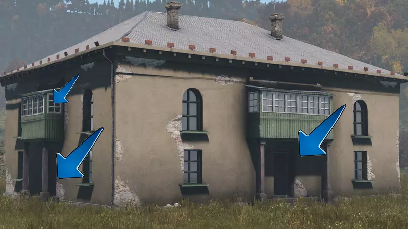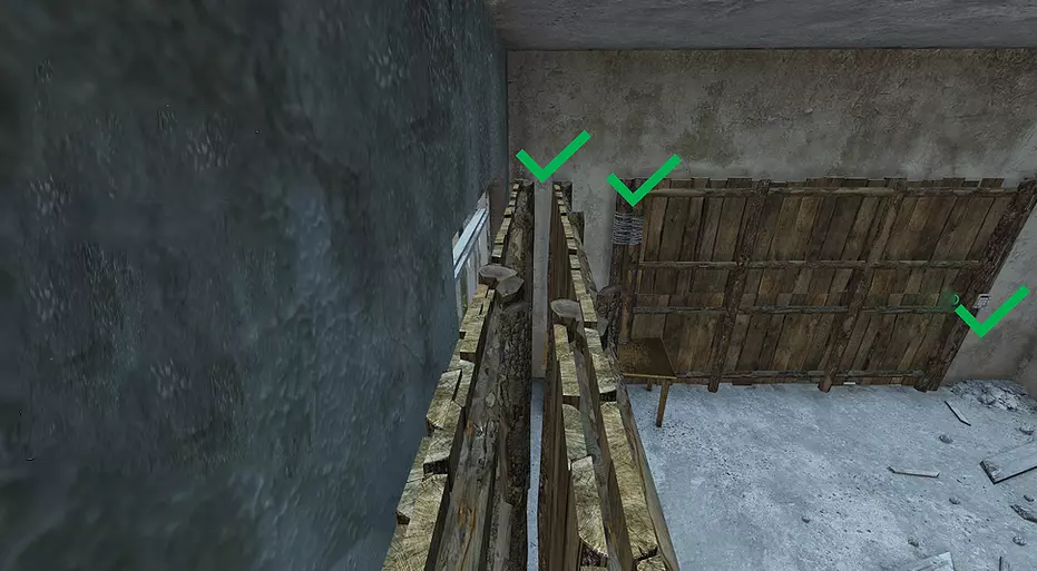 如果你的基地只有一个入口,那么只需要一堵墙就能保证安全,其余的墙都只是加固,攻击者必须摧毁它们才能拿到战利品。如果一个巨大的基地有很多入口,而攻击者只需要打破其中一个就能进入,那么这个基地就毫无用处。这种情况在大型工业建筑中很常见。 单一入口的例子有(切尔诺贝利和利沃尼亚的)监狱,它们只有一条主通道可以进入。 同样重要的是,要确保基地内部可以设置尽可能多的门来阻挡敌人接近战利品,你可以用便宜的栅栏工具包来检查这一点。