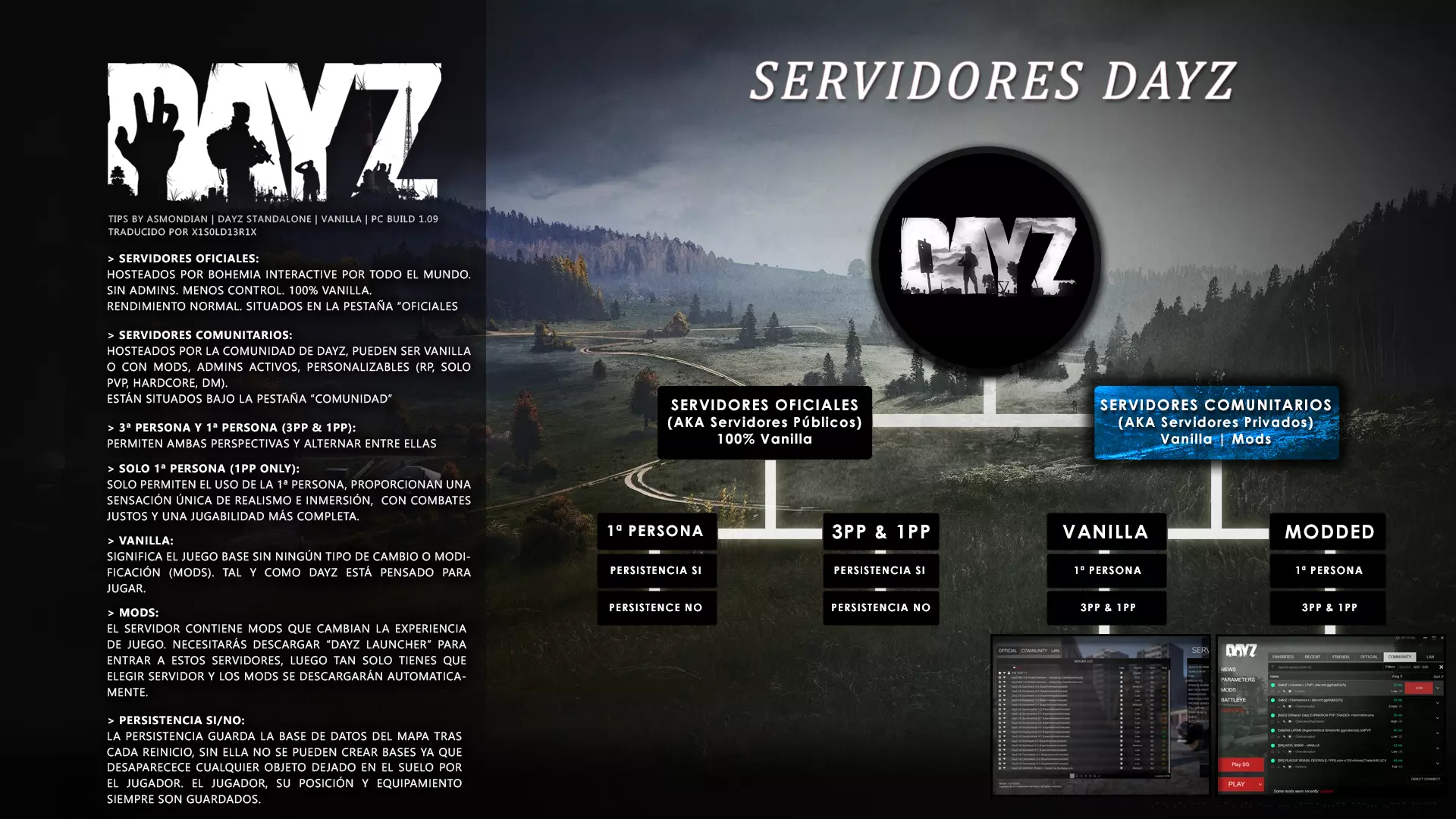 Principalmente hay dos tipos de servidores en DayZ como ya vimos anteriormente: Oficiales y Comunitarios, aquí vamos a verlos en profundidad. Personalmente no recomiendo en absoluto los oficiales, de hecho bajo mi punto de vista deberían eliminarlos y moverlos a los comunitarios para no dividir tanto a la comunidad, aquí suelen jugar los supervivientes novatos por desconocimiento. Oficiales (públicos): Son todos aquellos servidores hosteados de manera oficial por Bohemia Interactive, el modo de juego es el oficial de DayZ, lo que viene siendo el "Vanilla" tal y como DayZ está pensado para jugar, estos servers se caracterizan por la particularidad de que comparten tu personaje entre ellos y puedes ir de un servidor público a otro conservando tu personaje e inventario, lo cual, te proporciona más flexibilidad a la hora de elegir servidor ya que puedes seleccionar entre diversos parámetros cada vez que cambias del servidor, (cantidad de jugadores, hora, día, noche, etc) pero la desventaja es que los hackers y glitchers son más frecuentes en los oficiales ya que no pueden ser baneados al carecer de admins, estos jugadores pueden huir de un servidor a otro sin perder su inventario con lo cual resulta muy molesto, esto ocurre al igual que en el modo competitivo de CS:GO donde no hay admins, los hackers se aprovechan de ello, sin embargo esto no ocurre en los servers comunitarios debido a que son baneados por las comunidades. Otro inconveniente es que los servers oficiales permiten el "Jumping" Nota: Los jumpers son jugadores que saltan de un servidor a otro con tres objetivos: Lotear masivamente lugares militares para equiparse sin esfuerzo con buen loot dejando las mejores zonas completamente vacías. Spawnear en la espalda de otros jugadores durante el combate aprovechando un salto desde otro servidor. Entrar en bases con acceso bloqueado mediante un salto desde otro servidor, el jumper se posiciona dentro de la base desde un servidor vacío (ya que allí no existirá la base) y luego realiza el cambio de servidor apareciendo dentro de la base bloqueada. Esto hace que crear una base sea inútil y para rematar esconden el botín robado en otro servidor. Comunitarios (Privados): Un servidor comunitario es hosteado por los jugadores de DayZ, en mi opinión son el mejor sitio para jugar ya que este tipo de servers tienen muchas ventajas y además se pueden personalizar mediante los mods. A los servidores comunitarios también se les llama privados porque tu personaje quedará únicamente guardado en ese servidor concreto que juegues, de modo que si vas a otro diferente, sea privado o público, no se conserva y empezarás de cero, podrás retomar el personaje cuando vuelvas al mismo server privado. El "inconveniente" es que tienes que adaptarte a las condiciones del servidor, número de jugadores, hora, clima y demás pero en cambio tiene otras ventajas ya que lo hacen el mejor sitio para jugar. Baja/nula existencia de hackers y tramposos (Los hackers evitan este tipo de servers ya que pueden ser baneados Admins generalmente activos y localizables Medios para contactar y reportar cualquier problema (web, facebook, twitter, Discord...) Foro con contenido y eventos especiales Posibilidad de Roleplay Posibilidad de Whitelist Economía de loot propia (No se puede robar en una base y esconder el botín en otro servidor) Posibilidad de modding Sin posibilidad de jumping Más facilidad de conocer gente ya que juegan en el mismo servidor También hay que mencionar que los servers comunitarios se dividen a su vez en dos tipos (servers con mods y servers sin mods): Server sin mods: Parten del modo normal del juego (Hardcore/Vanilla), pueden tener configuraciones extra o no y debido a esto también se subdividen en 2 tipos: Vanilla 100%: Los conservan el modo del juego por defecto, en el nombre del servidor especifican las palabras "Vanilla" o "Hardcore", es el juego base con las configuraciones por defecto tal y como DayZ está pensado para jugar. Yo aconsejo este tipo de servers, de hecho encontrarás unas recomendaciones del servidores más adelante. No vanilla: Son los que añaden configuraciones para facilitar el juego, en el nombre del servidor especifican cosas como high loot, guns, weapons... significa que el loot es mucho más abundante (armas, comida, ropa...) y te equipas en muy poco tiempo eliminando cualquier tipo de desafío del juego como la supervivencia por la comida, la lucha contra las enfermedades... en estos servers muchas mecánicas de supervivencia y demás caen en el olvido ya que están más pensados para el PVP. Por mi parte no aconsejo estos severs ya que se basan en lotear durante un rato para equiparse y después ir a alguna base militar concurrida para morir, si quieres matar lo mejor es ir a un server DeathMatch en el que apareces equipado y listo para matar. También encontrarás más adelante unas recomendaciones de estos servers. Server con mods: Estos servidores ofrecen todo tipo de experiencias y formas de juego, lo cierto es que la mayoría son suprimibles bajo mi punto de vista. Yo aquí solo recomiendo los servers que amplían y mejoran la experiencia Vanilla ya que el resto lo que hacen es desvirtuar el concepto del juego y transformarlo en otra cosa que poco tiene que ver con un apocalipsis zombie, algo de lo que hablaré más adelante. Sin embargo hay servers muy buenos que mejoran el modo Vanilla/Hardcore y proporcionan auténticas experiencias en DayZ y con un gran rendimiento, esos son los que yo aconsejo jugar y por ello he incluido varios servers de estas características en la recomendación de servidores que encontrarás más adelante. No aconsejo los que tengan trader, loot excesivo, no stamina, zonas seguras y fuercen el comportamiento y libertad del jugador... son servers que cambian el juego casi por completo ofreciendo un tipo de experiencia distinta a un apocalipsis, en algunos casos se llega incluso a eliminar los zombies. 👉 1ª Persona VS