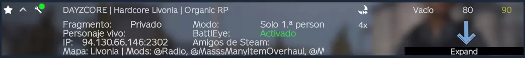纯净/硬核模式与模组模式 纯净/硬核模式:官方设计的《DayZ》标准游玩模式。需要注意的是,并非所有社区服务器都是100%纯净模式,部分服务器会通过调整使游戏难度降低,从而不再属于纯净模式。名称中包含“GUNS”“HIGH LOOT”“WEAPONS”等字样的服务器,通常对游戏内容进行了修改,让玩家能快速获取装备,无需过多担心饥饿、口渴、疾病等生存要素,这在一定程度上偏离了游戏的核心玩法。 名称中仅标注“Vanilla”(纯净)或“Hardcore”(硬核)的服务器,一般符合官方标准模式。 模组模式:此类服务器对基础游戏进行修改,添加了更多内容,包括新的游戏模式、机制、服装、武器等。这在某些情况下是好的,在另一些情况下则不然,因为有些服务器会改变游戏的核心玩法,而且不一定会变得更好,比如TRADERS(商人)类服务器。然而,其他服务器则会弥补原版游戏的不足,并能提供真正的游戏体验。 要查看服务器是否有模组,点击“Expand”(展开)按钮,就像你在图片中看到的那样。如果只显示@Livonia,说明该服务器没有模组,只有地图DLC。
