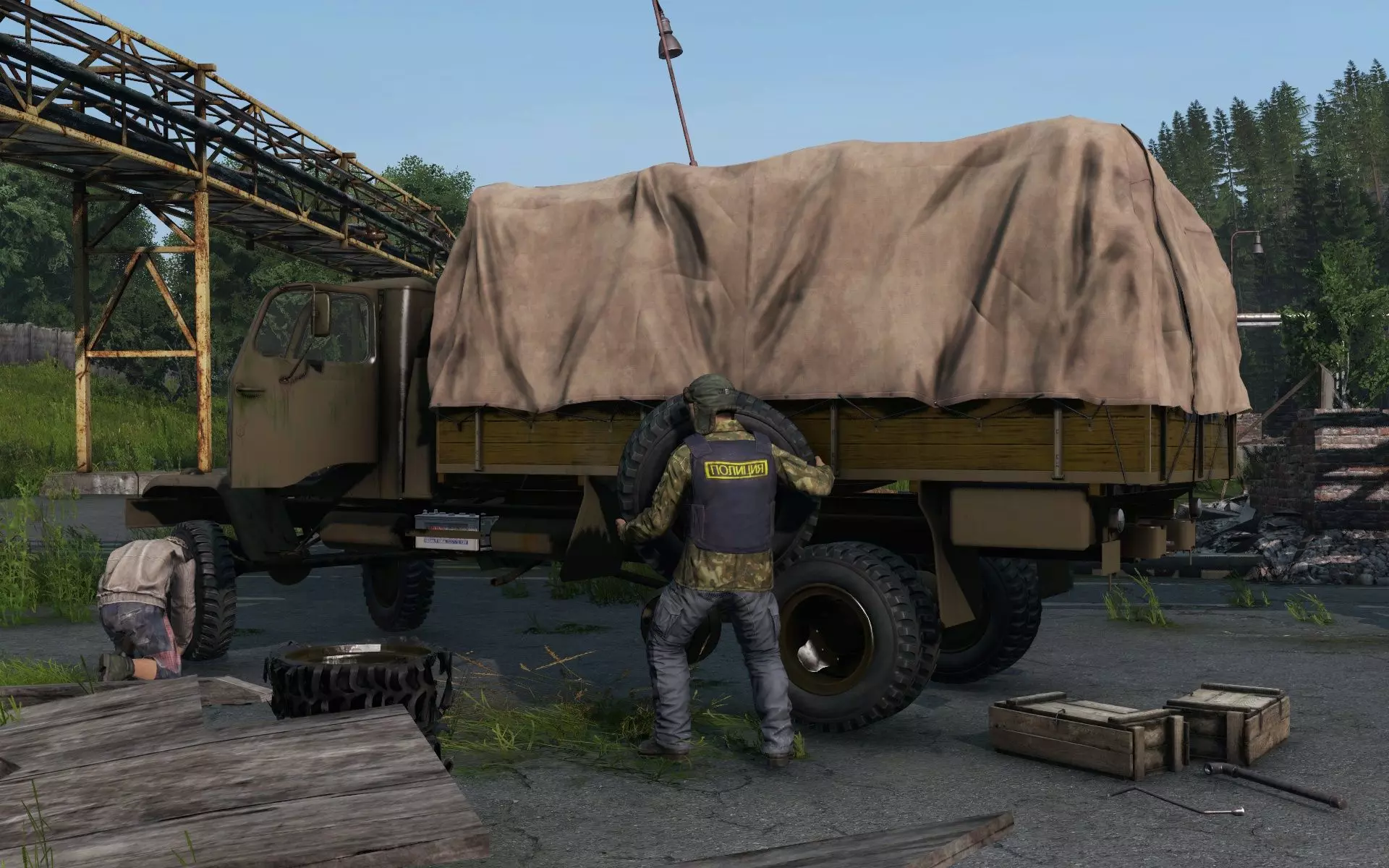 轮胎根据车辆类型分为多种,每种车辆都需要适配的轮胎才能行驶。对于汽车而言,使用3个轮胎仍可行驶,但会损失速度和操控性;使用2个轮胎也能勉强移动,但速度会极慢,此时步行反而更可行,但可以将车辆藏在附近区域,直到找到其他轮胎。轮胎可以通过轮胎修理包进行修复,并且可以用扳手锁上。