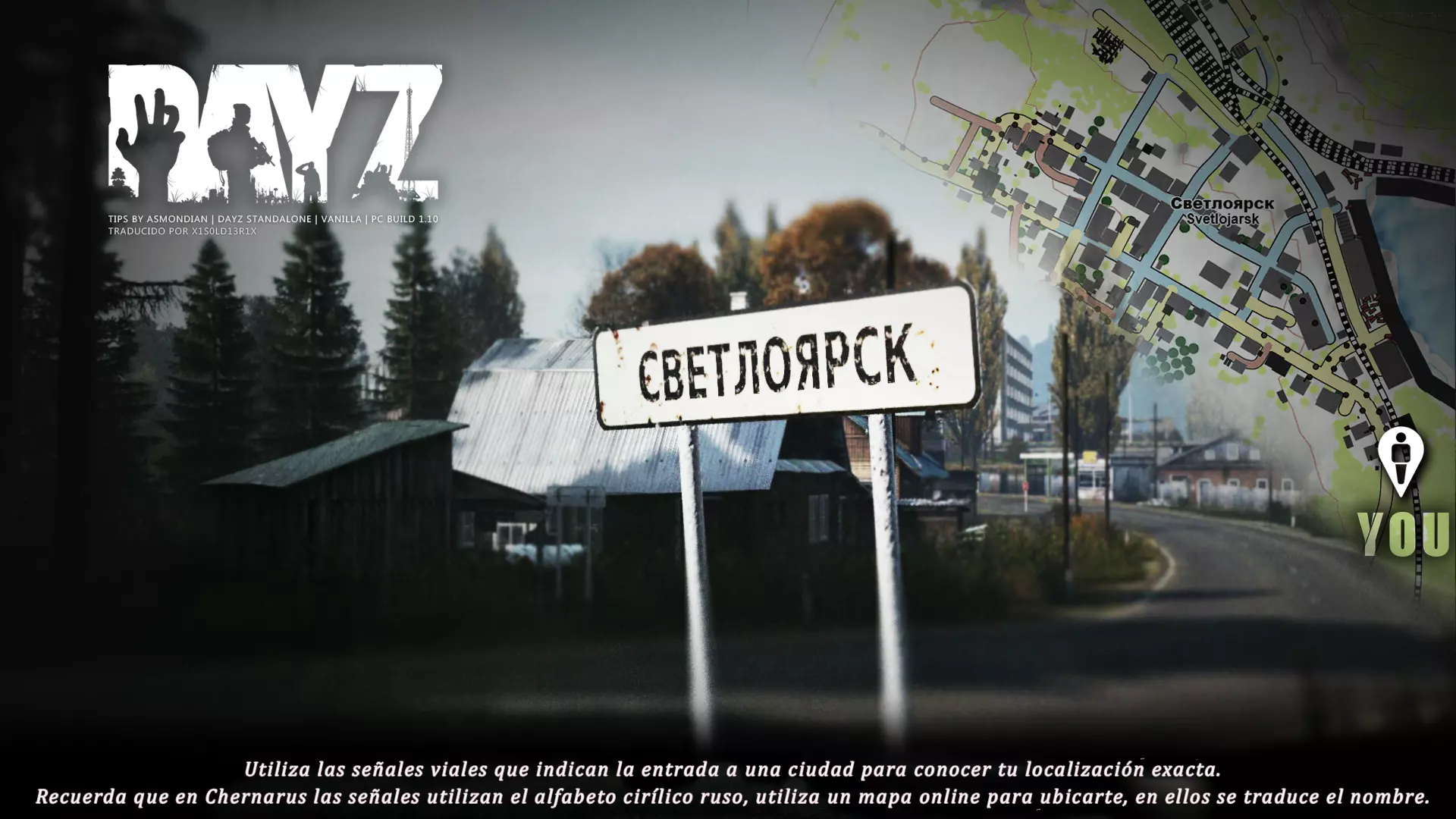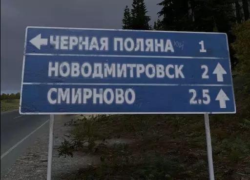 3.所有村庄在公路入口处都有这种白色的俄语标牌,上面会显示你正在进入或离开的村庄名称。为了确定自己的位置,你可以留意标牌上的名称,然后在导航地图中查找,通过对比西里尔字母就能知道自己的位置。(如果你一直待在海岸边,只需在沿海村庄中查找,这样会更快)