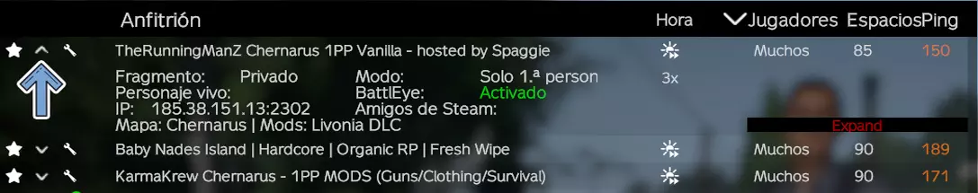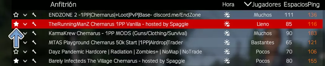 这是服务器搜索器,我们可以通过它根据自己的偏好选择服务器,包括或排除各种搜索参数。 首先,我们需要在官方服务器和社区服务器之间进行选择,推荐选择社区服务器,因为官方服务器没有管理员,而且充满了作弊者。这一点我们稍后会详细说明。 将服务器添加到收藏夹 ✰ ------> ★ 要将服务器标记为收藏,你需要点击想要标记的服务器名称左侧的星形图标(✰),所有服务器都有这个图标,点击后星形会变成白色(★),表示已标记为收藏。