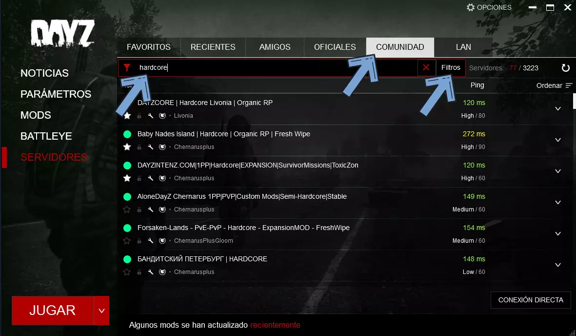 现在我们可以从启动器中查看服务器搜索器,按以下步骤操作:选择【社区服务器】,然后在搜索栏中输入【Hardcore】或【Vanilla】(可选),最后点击【筛选器】。所有步骤都在下图中进行了说明。 如果我们知道服务器的IP地址,可以点击右下角的【直接连接】按钮,然后输入IP地址即可。