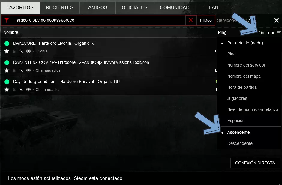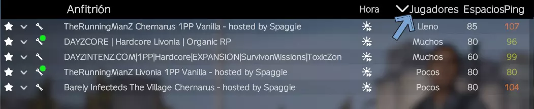 排序服务器 你可以根据服务器的玩家人数从最多到最少或从最少到最多对服务器列表进行排序。为此,只需点击服务器浏览器中的【玩家】标签即可。
