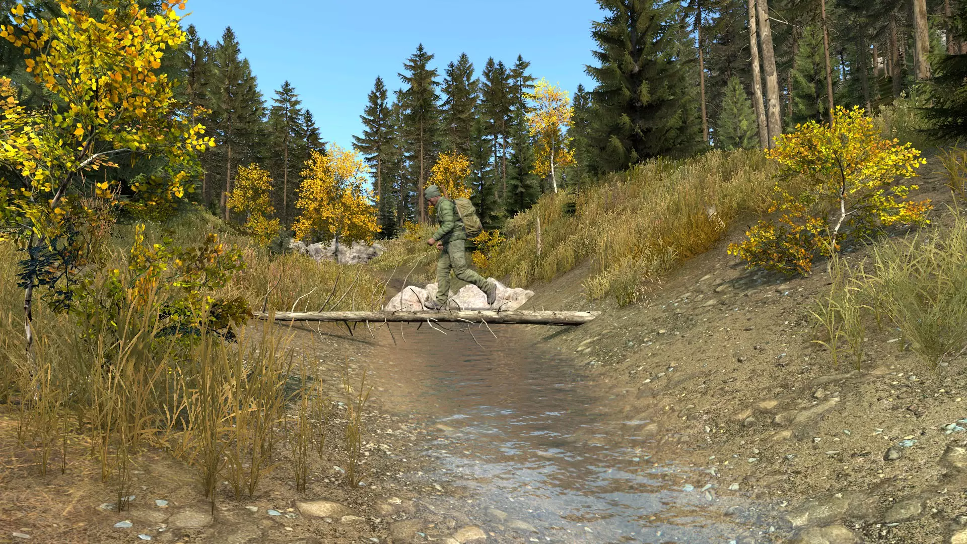 地图上遍布着许多湖泊,它们通常通过河流相互连接。即使是干涸的河流,沿着它们走也可能会找到一个小水洼。无论如何,在旅途中你都会遇到这些水域。你可以获取任意量的水,此外,如果温度需要,你还可以钓鱼和纳凉。这里有许多大小不一的水域,但记住,你必须先将水净化后才能饮用,否则可能会生病。 小溪流