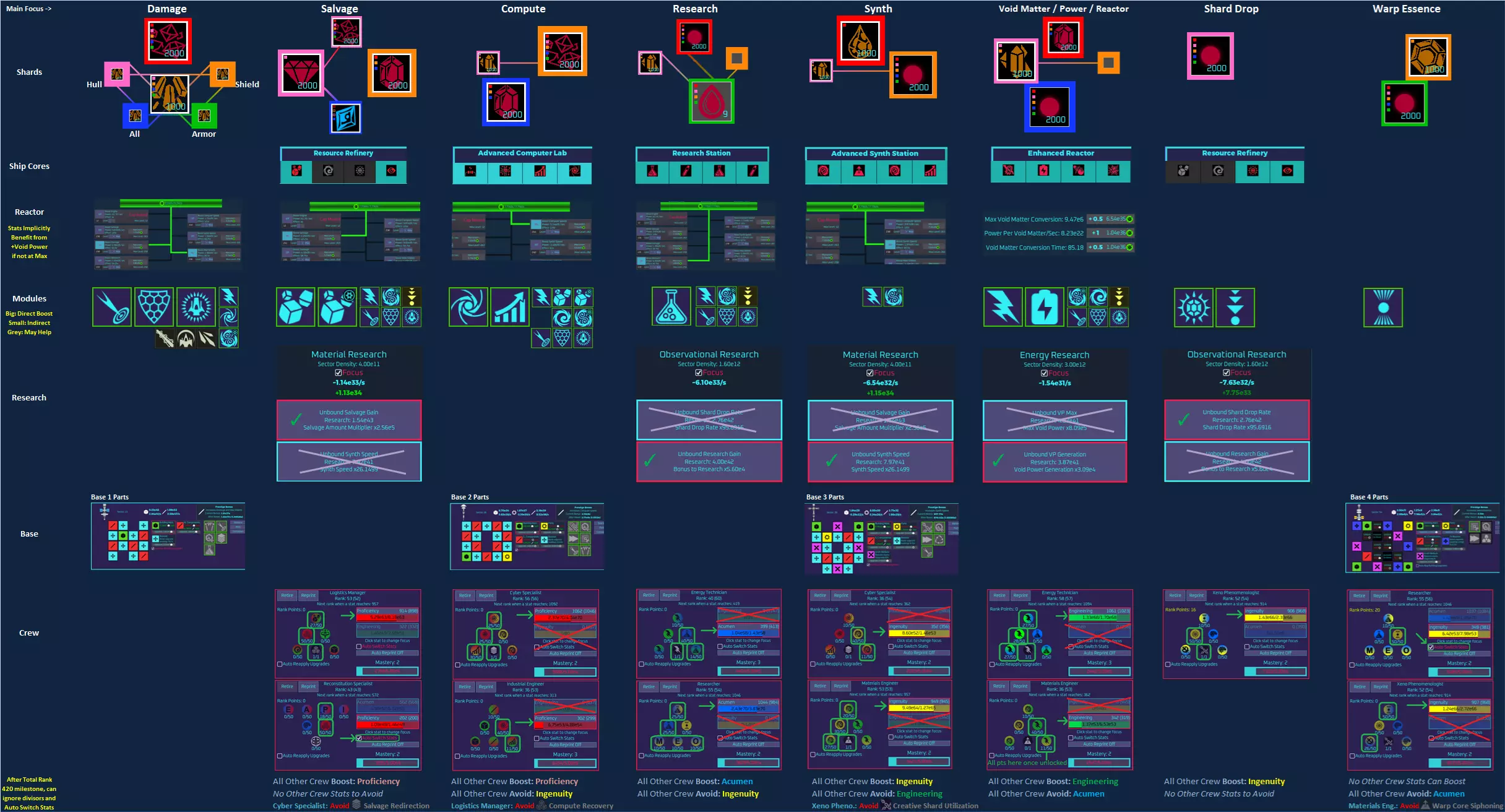 一份信息图表速查指南(又称“作弊表”),可帮助你记住在各个标签页(模块、碎片、舰船核心、反应堆、研究、基地和船员)上应优先设置哪些选项,以便协同增效并最大化特定属性(伤害/护盾、打捞、计算力、研究、合成、虚空物质/能量/反应堆、碎片掉落、跃迁精华)的加成。 希望你觉得这种图片格式比阅读一些复杂的指南更快捷直观。 剧透警告 本指南旨在对25-75星区(或许稍往后一些)的玩家有所帮助。其中自然包含一些剧透内容,包括如果你处于较早星区尚未解锁的功能。如果你不能立即认出某个图标或图像,可以将其视为尚未解锁的内容而忽略。在75区附近,情况发生了很大变化,本指南不再是关于如何极致优化所有内容的完整指南。 如何最大化各项属性