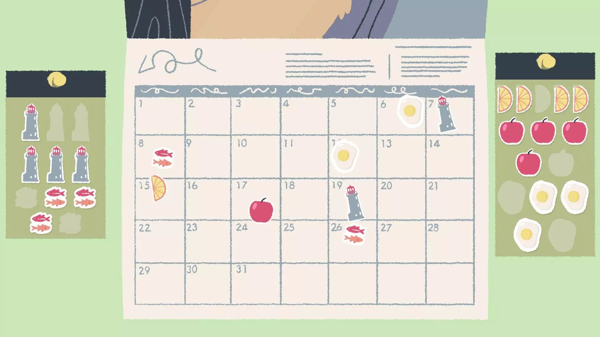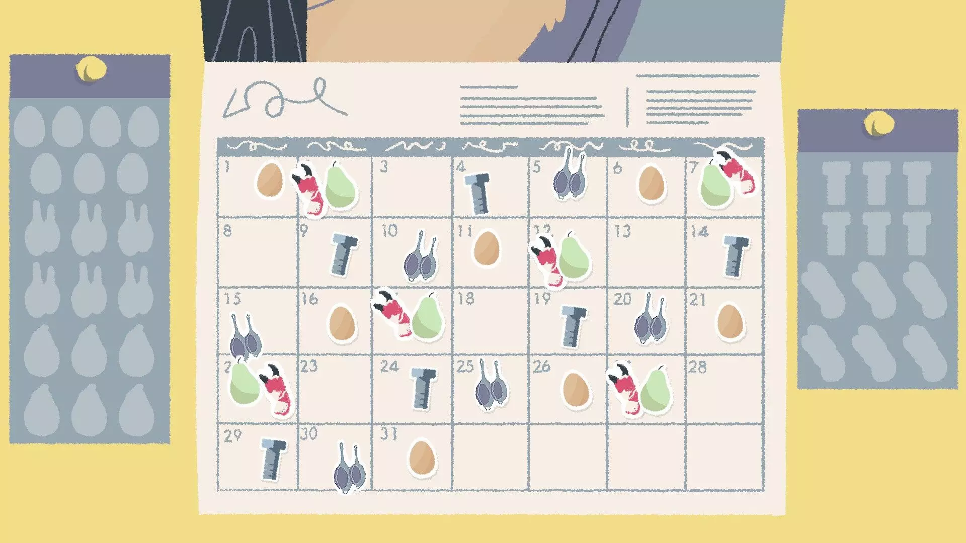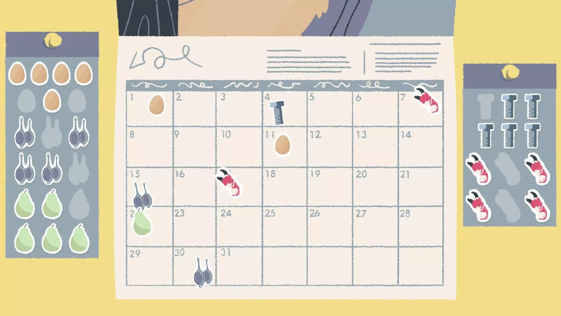 日历贴纸 [与第一章-第12关相同] 很多人似乎在日历贴纸谜题上遇到困难,所以我会尽量用例子来解释清楚。 将每种类型的贴纸每隔【X】天放置一次,其中【X】是根据日历上已放置的贴纸推算出来的。 例如:如果我们有一种类型的贴纸共五张,其中两张已放置在日历上,间隔14天,那么通过逻辑可以确定每种贴纸的间隔是7天,因为如果间隔14天的话,所有贴纸无法全部放在日历上。 提示:仅在显示的日历日期范围内操作,不会跨到新的月份。 所有类型的贴纸间隔天数相同,例如5天。忽略只有一个起始位置的贴纸类型——比较同一类型的两个贴纸的位置,如果贴纸数量过多无法全部放置:将数量减半。 如果我们在第7天有一个鸡蛋贴纸(例如),而你得出的答案是6天,这个答案能容纳除一个之外的所有贴纸,那么请检查你第一个贴纸之前的日期,因为可能存在空隙,该贴纸可以放在第1天。 示例 这个特定谜题的答案是5天,所以让我们倒推一下我们是如何得出这个答案的: 我们可以看到日历上有两个鸡蛋贴纸相隔10天,但我们还有五个额外的鸡蛋贴纸需要放置,因此不可能是10天——让我们看看另一种贴纸类型。蟹爪贴纸也相隔10天,并且还剩下四个贴纸。使用10天的话,每种类型的贴纸无法全部容纳,所以我们将10减半得到5,这样就能容纳所有类型的贴纸了。