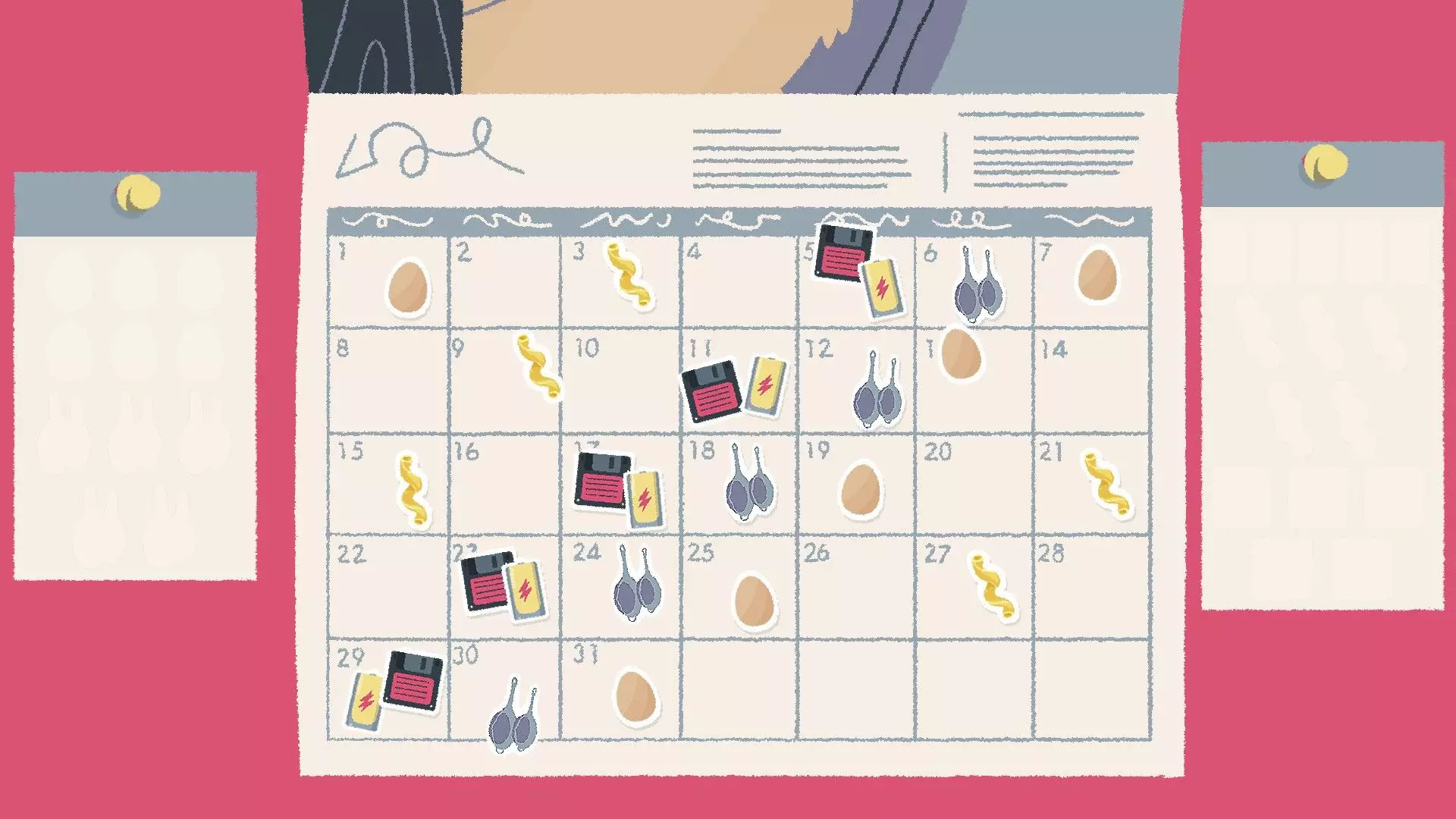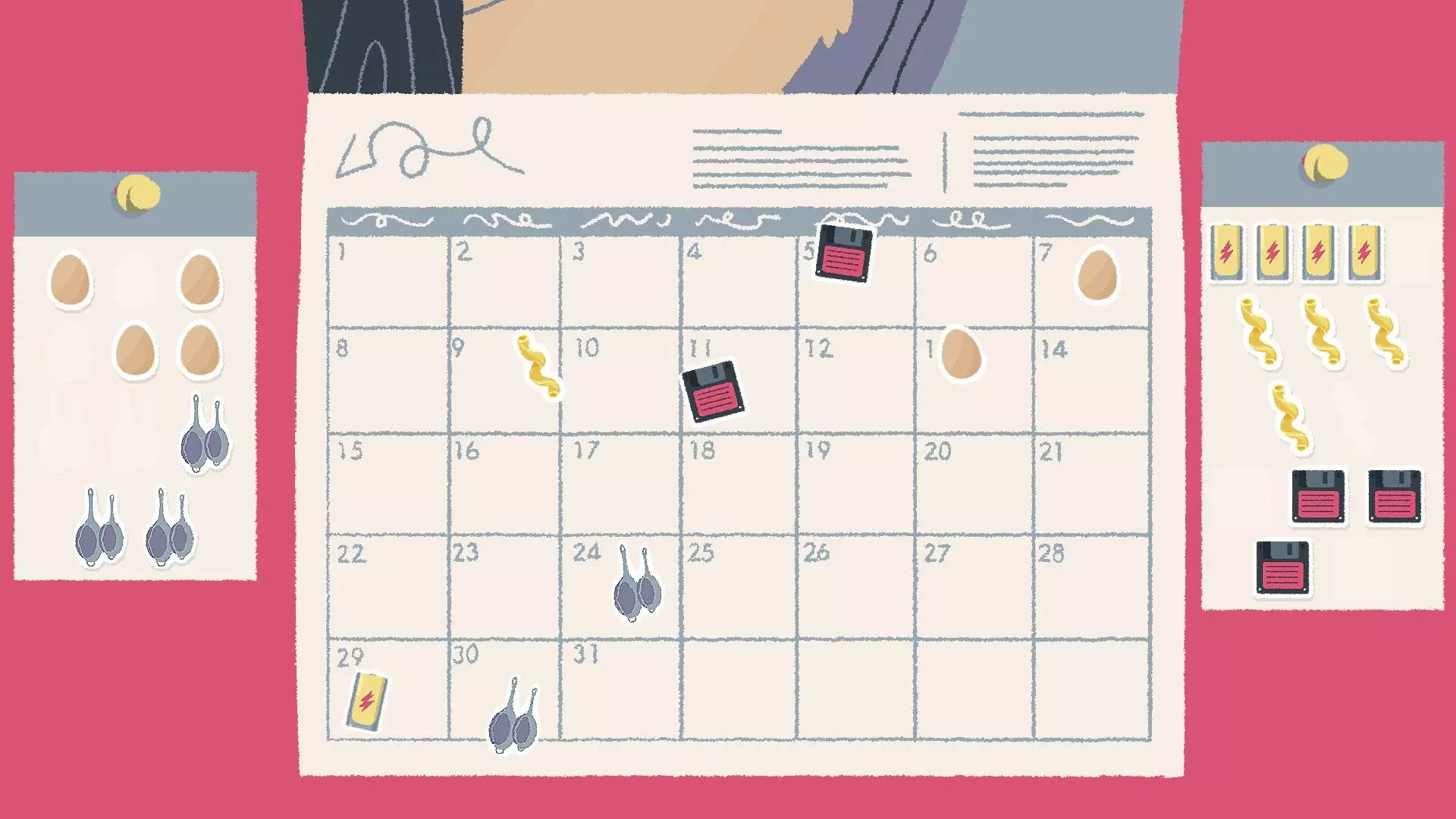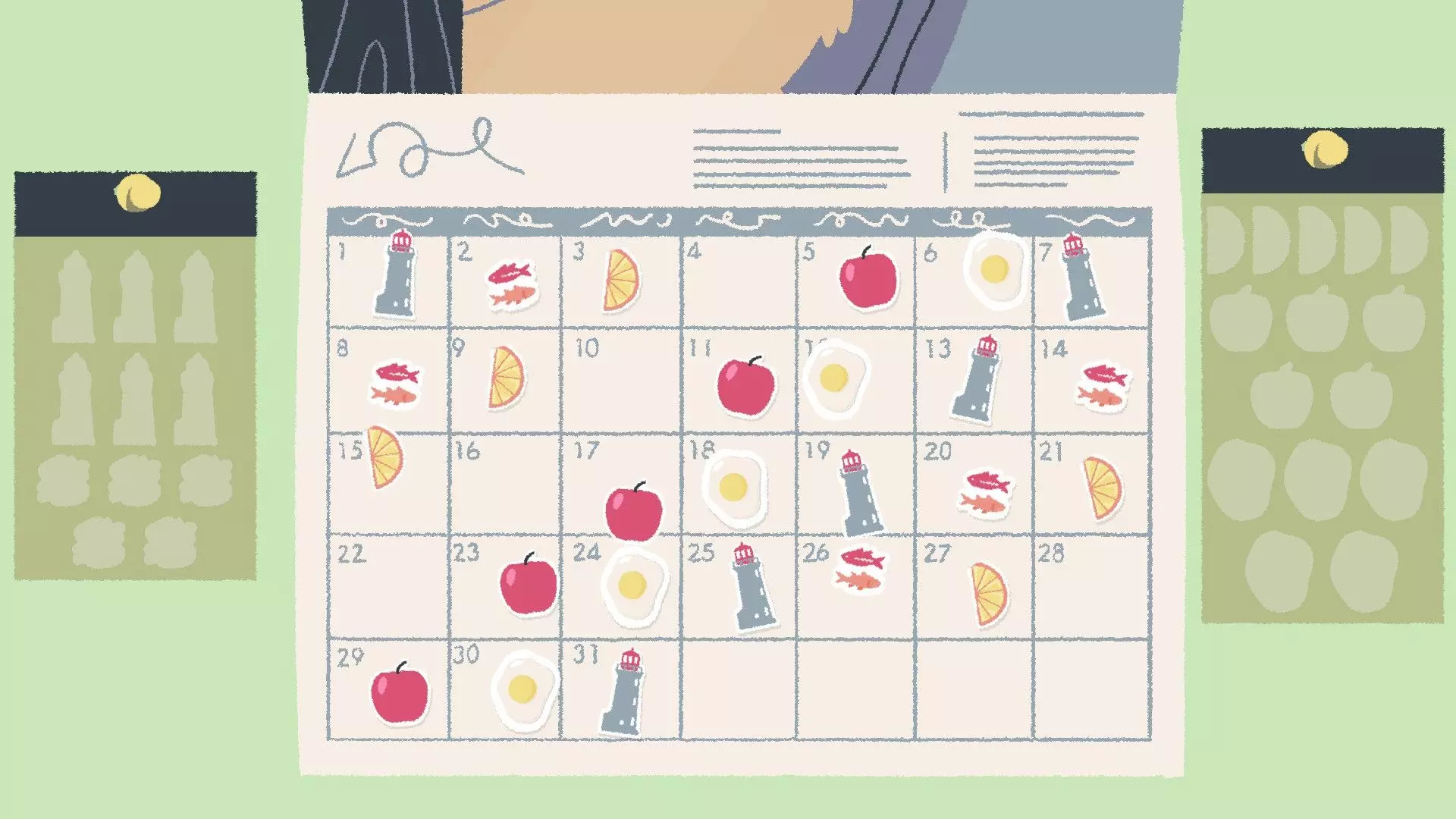 日历贴纸 [与第一章-第12关相同] 很多人似乎在日历贴纸谜题上遇到困难,所以我会尽量用例子来解释清楚。 将每种类型的贴纸每隔【X】天放置一次,其中【X】是根据日历上已放置的贴纸推算出来的。 例如:如果我们有一种类型的贴纸共五张,其中两张已放置在日历上,间隔14天,那么通过逻辑可以确定每种贴纸的间隔是7天,因为如果间隔14天的话,所有贴纸无法全部放在日历上。 提示:仅在显示的日历日期范围内操作,不会跨到新的月份。 所有类型的贴纸间隔天数相同,例如5天。忽略只有一个起始位置的贴纸类型——比较同一类型的两个贴纸的位置,如果贴纸数量过多无法全部放置:将数量减半。 如果我们在第7天有一个鸡蛋贴纸(例如),而你得出的答案是6天,这个答案能容纳除一个之外的所有贴纸,那么请检查你第一个贴纸之前的日期,因为可能存在空隙,该贴纸可以放在第1天。 示例 这个特定谜题的答案是5天,所以让我们倒推一下我们是如何得出这个答案的: 我们可以看到日历上有两个鸡蛋贴纸相隔10天,但我们还有五个额外的鸡蛋贴纸需要放置,因此不可能是10天——让我们看看另一种贴纸类型。蟹爪贴纸也相隔10天,并且还剩下四个贴纸。使用10天的话,每种类型的贴纸无法全部容纳,所以我们将10减半得到5,这样就能容纳所有类型的贴纸了。