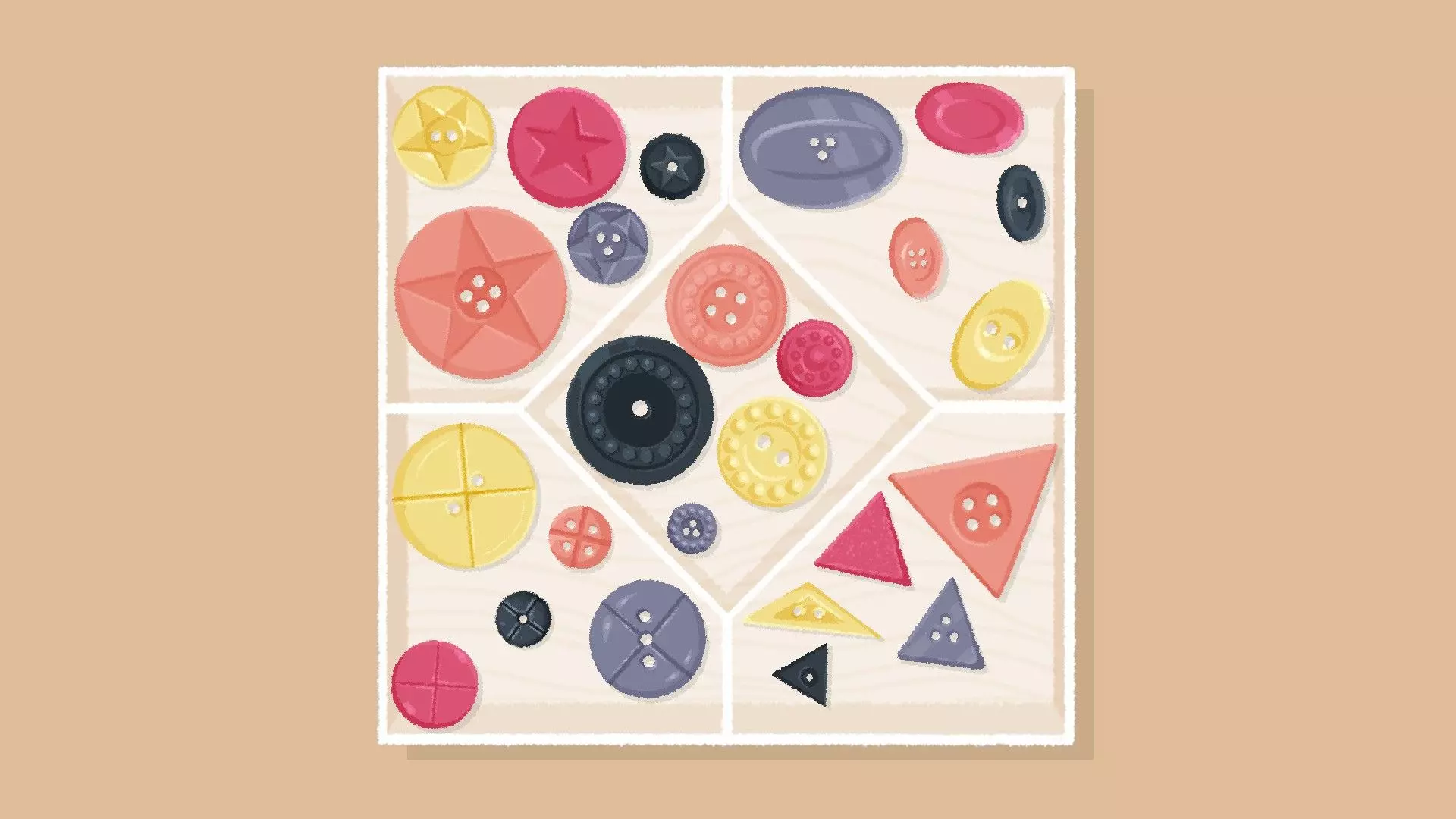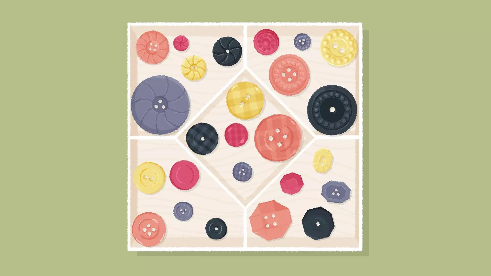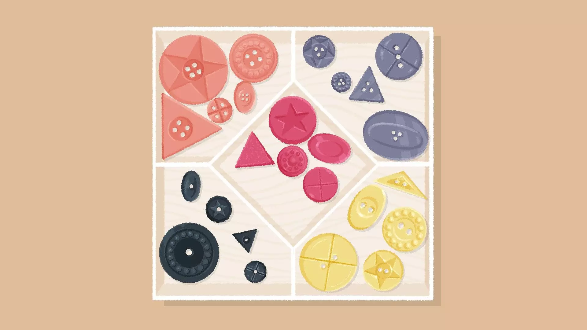 按钮 [与第三章 - 第8关相同] 按钮关卡通常有两种解法:根据孔洞数量(或颜色)分类,以及根据纹理分类。 孔洞数量解法 根据孔洞数量(或颜色)对按钮进行分类。 示例