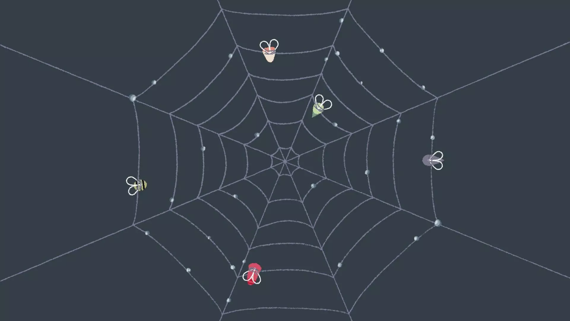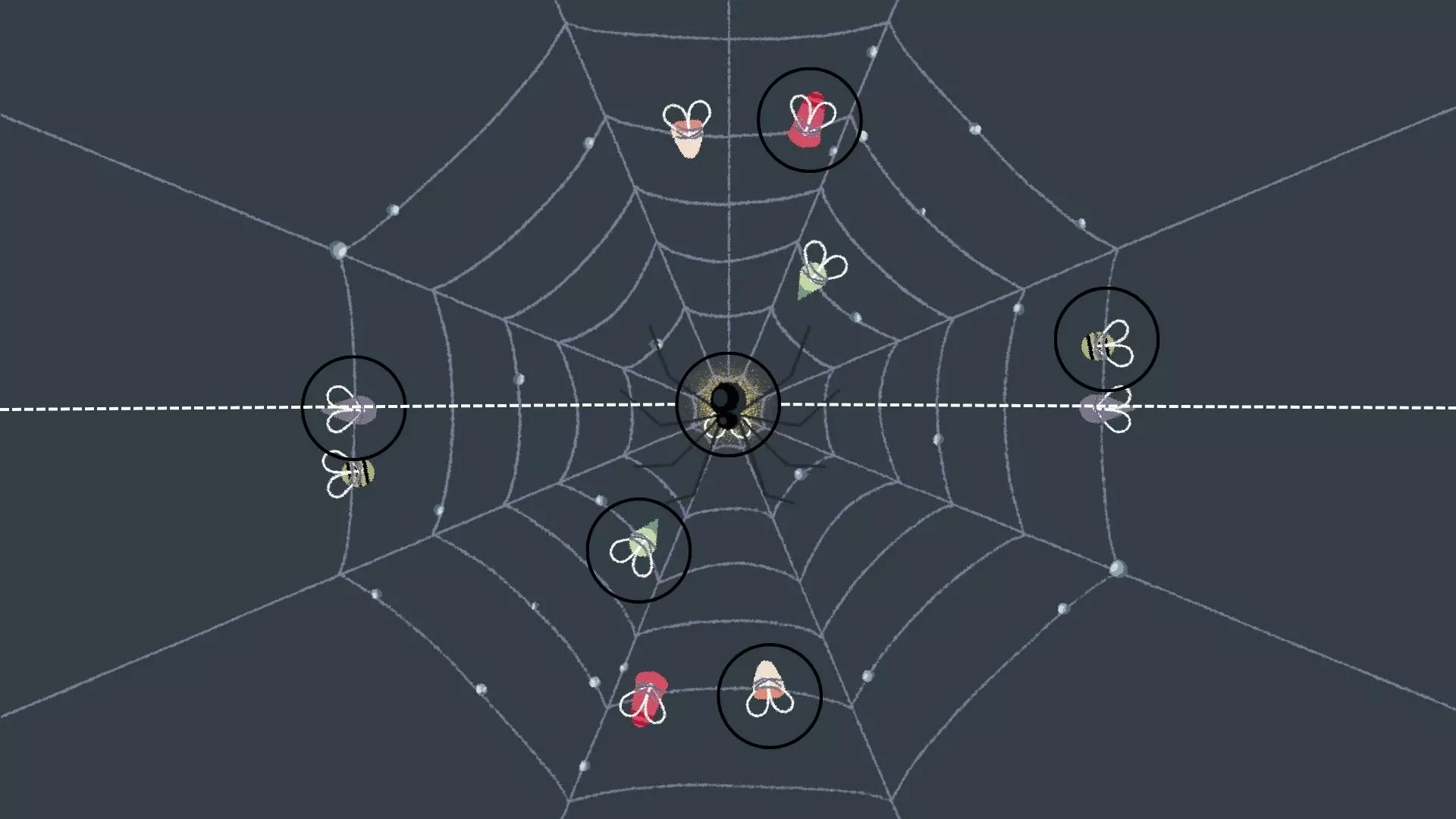 蛛网对称 [与第4章 - 第15关相同] 捕捉苍蝇并将其拖到蛛网上,使其对称,然后将发光的萤火虫放在中间,这会触发蜘蛛落入蛛网中心并吃掉萤火虫(在正确放置其他苍蝇后出现)。 示例