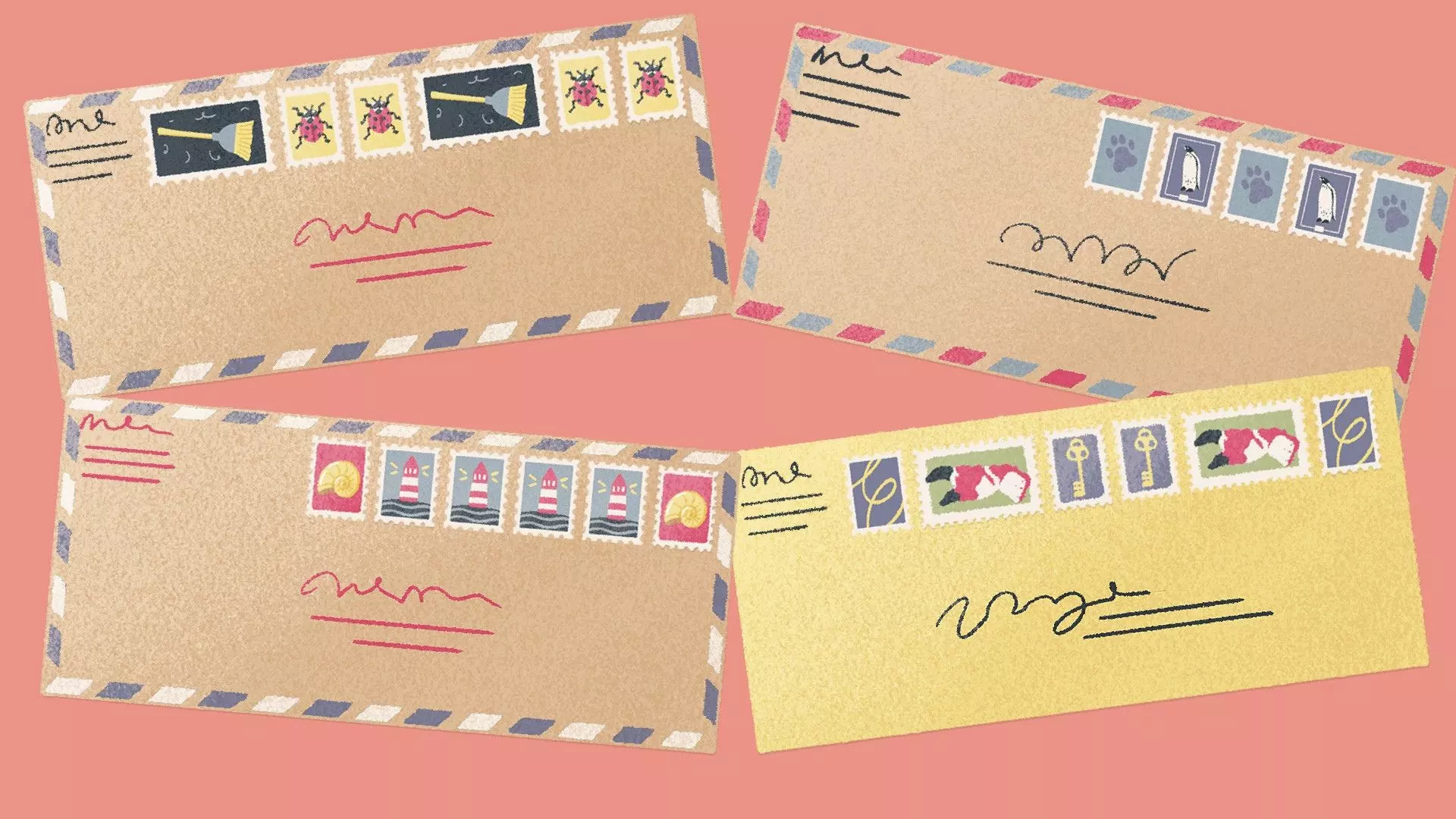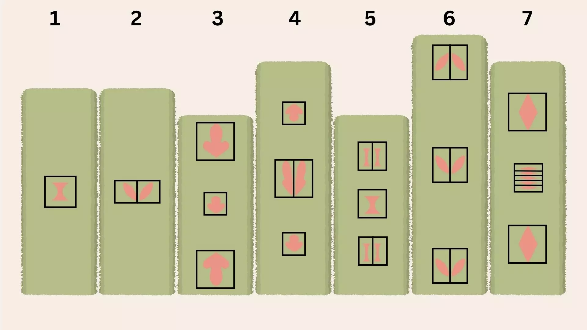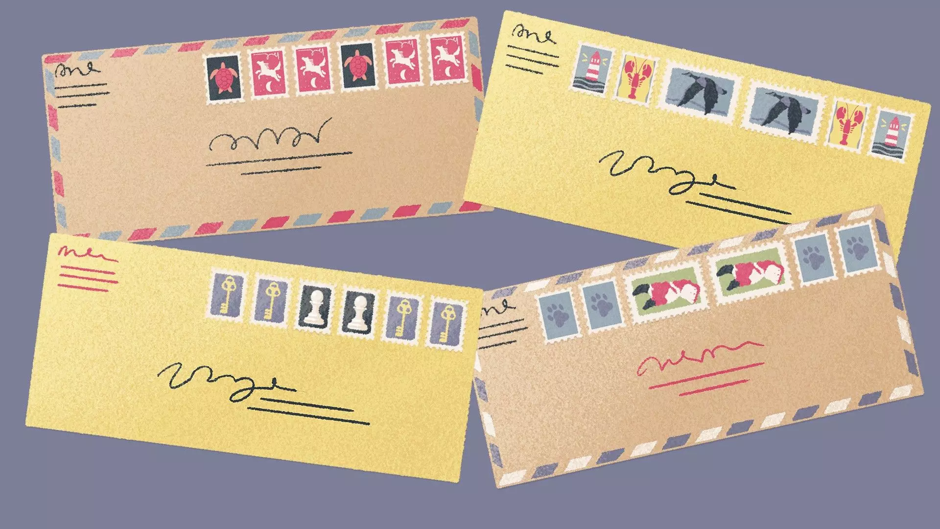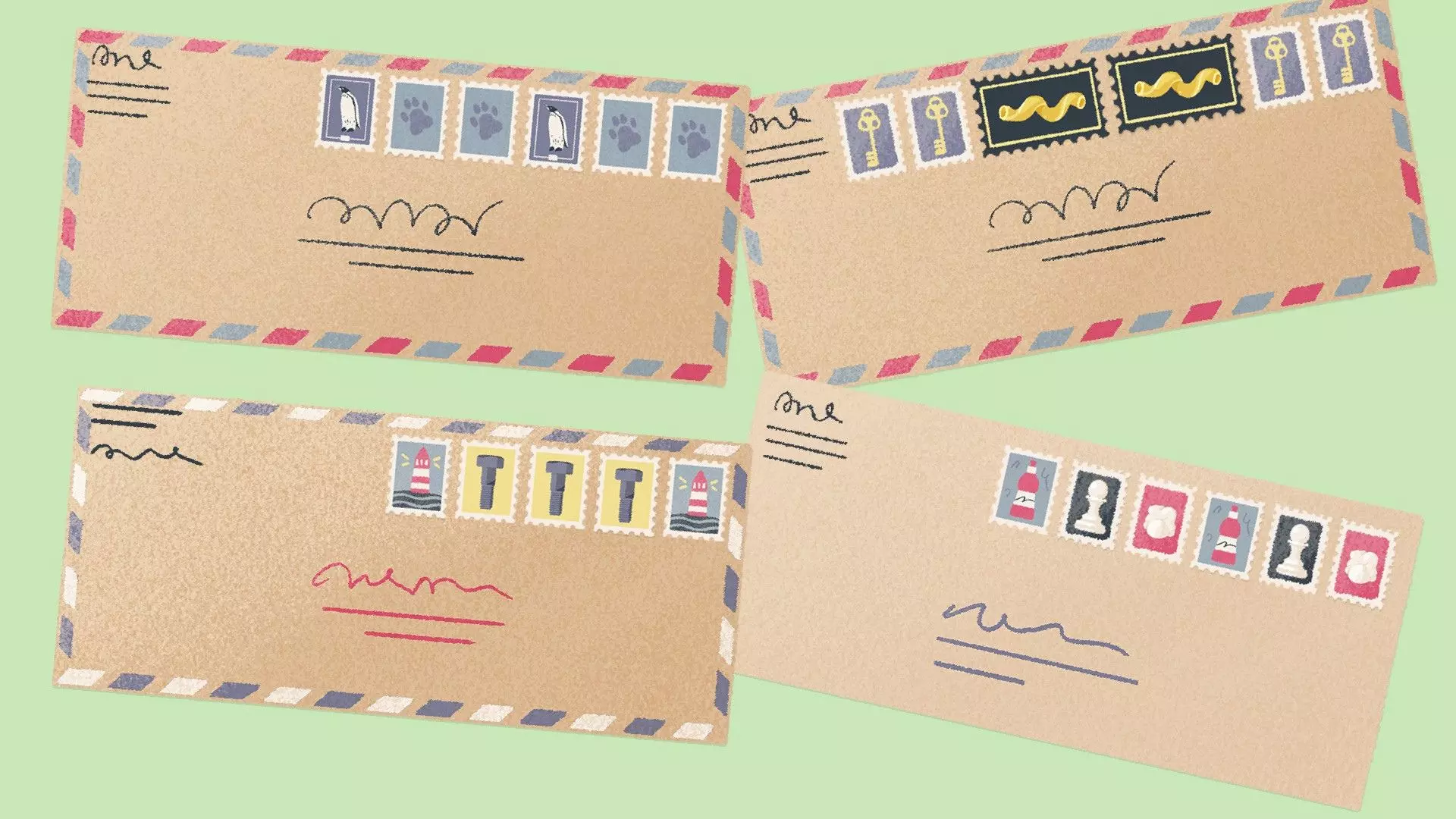 信封邮票 [与第一章 - 第九关相同] 为每个信封按重复图案放置邮票。 示例