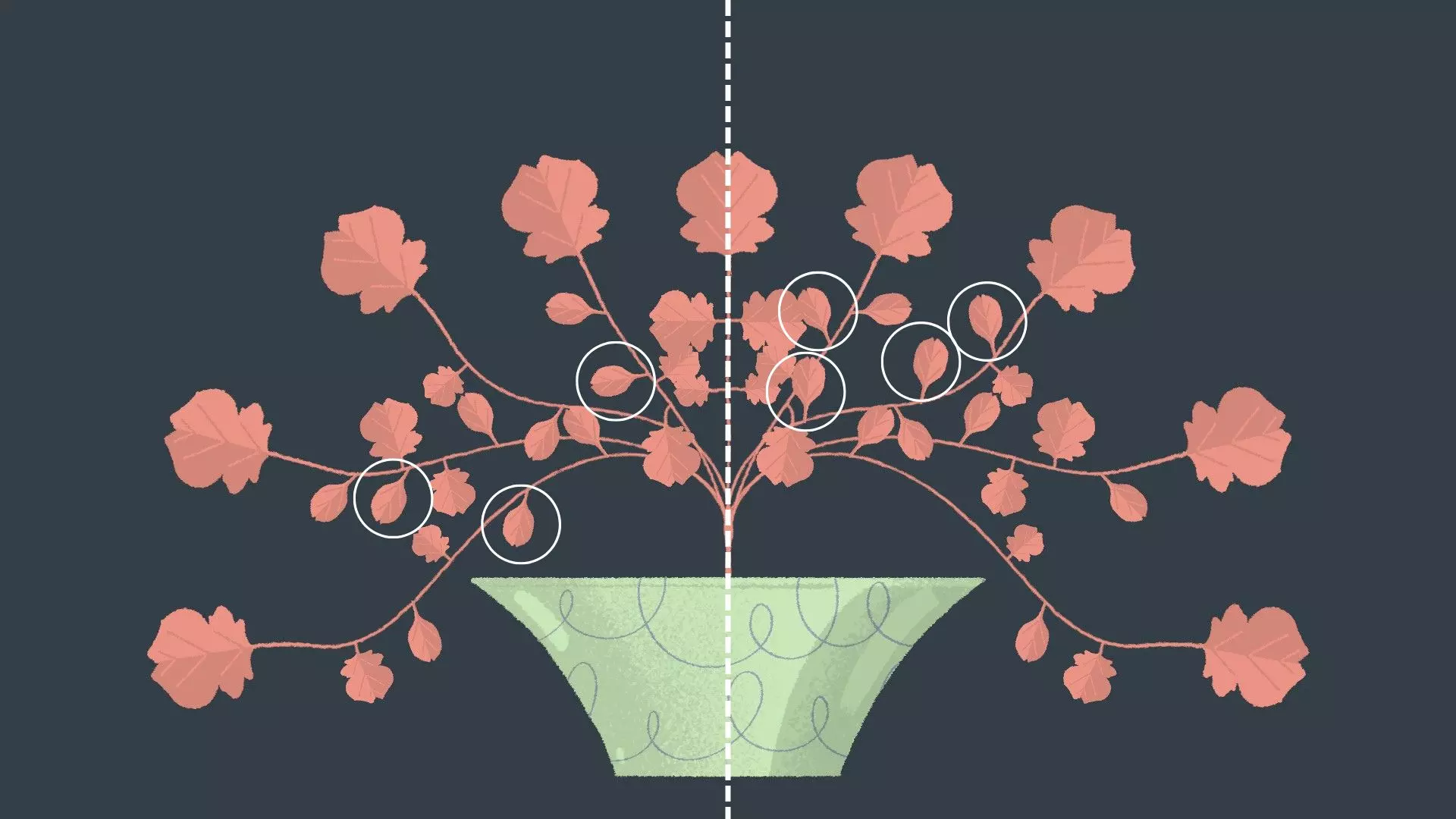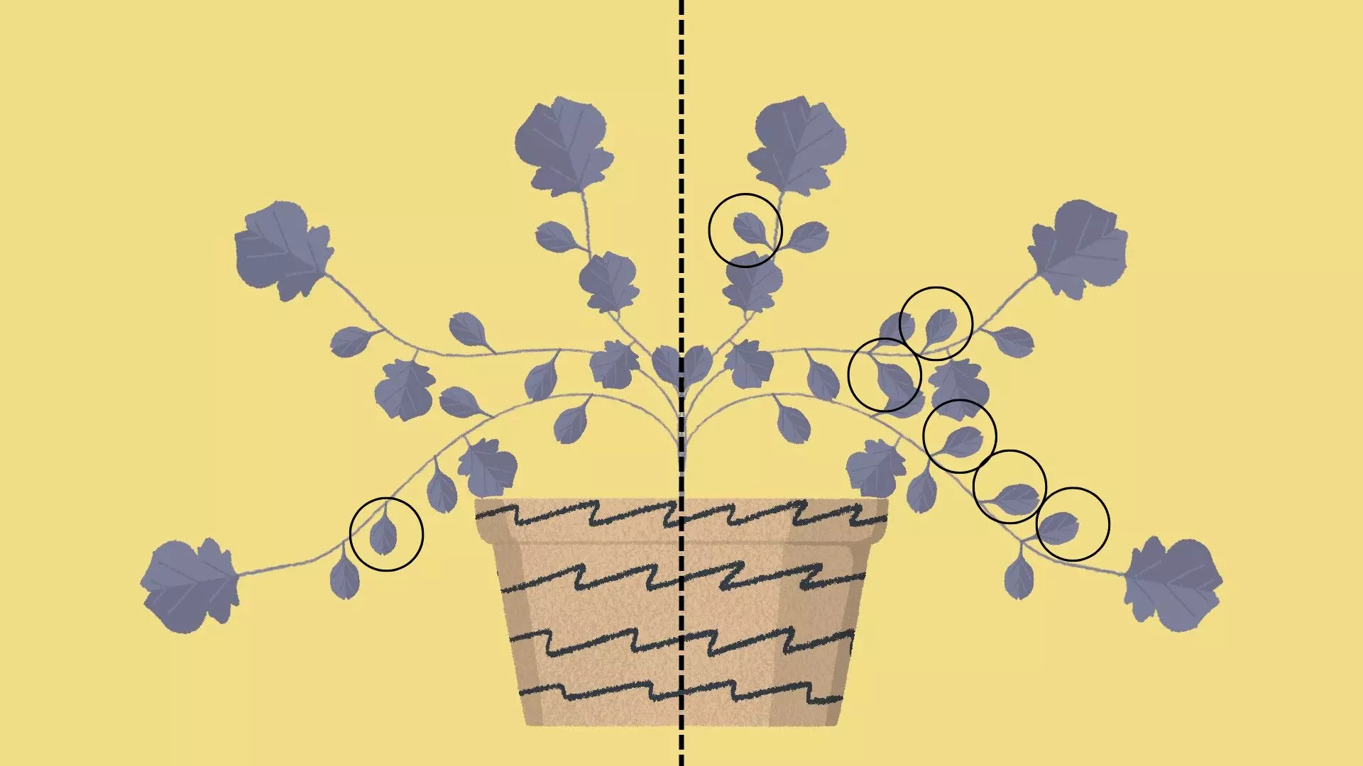 植物修剪 [与第4章 - 第3关和第8关相同] 通过摘除叶片使植物的叶子呈对称分布。 示例