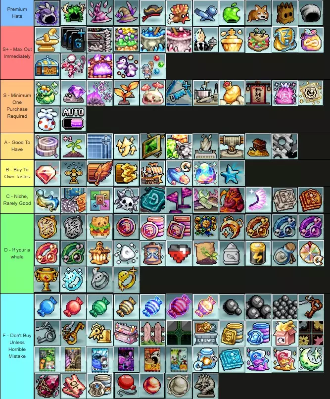 🚀 The First Things To Buy ItemsThis list doesnt contain limited special items because they cant be accessed anytime you want. To see what items you should or shouldnt get each rotation you can go the "Limited Specials" list. Infinity Hammer (w1-w2 Bonuses) Extra Card Slots (Usables) Crystal 3D Printer (w3 Bonuses) Brimstone Forge Slot (w1-w2 Bonuses) More Food Slots (Usables) Tower Building Slots (w3 Bonuses) Ritchelin Kitchen (w4 Bonuses) Royal Egg Club (w4 Bonuses) Souped Up Tube (w4 Bonuses) Chest Sluggo (w5 Bonuses) Divinity Sparkie (w5 Bonuses) More Sample Space (w3 Bonuses) NoticeYou should get "Carry Capacity, Storage Chest Space and Item Backpack Space" according to your needs and progress but getting a lot of them is always a good choice especially "Storage Chest Space". In the end game any storage increase helps a lot whether its storage space, carry capacity or backpack space. If you havent opened the later worlds, you can just get the ones you can buy at that moment or you can save it for later like wait for the limited specials you want. Your choice. If you already have the free teleportation upgrade, there’s no reason to buy daily teleports. And if you don’t have it yet, just wait until World 7 to unlock that upgrade instead. But if you’re a new player, it can still be worth getting one daily teleportation upgrade early on.” 💎 Limited Specials Limited Specials TabThese are the usefull things that you can buy in this rotation. Elemental Sorcerer Hat Steam Cap (Small increase but why not) Apple Launch Cap (Small increase but why not) Pardoned Turkey Hat (freebie) Siege Captain Hat Windwalker Hood Death Bringer Hood Arcanist Crown This section highlights valuable items and upgrades that occasionally appear in the gem shop rotation. It's intended for players who are saving gems for specific items when they return. The list will include the gem prices for each item as it becomes available. Since there's no official source listing prices for out-of-rotation items, this guide will be updated over time as they reappear. If you happen to know the price of an item not listed, feel free to message me or leave a comment. Note: These items are not ranked in any particular order and I dont know when they will be in rotation so just hope for them to get in the shop rotation. Windwalker Hood (890) Death Bringer Hood (890) Arcanist Crown (790) Elemental Sorcerer Hat (550) Siege Captain Hat (550) Elite Class Swap (900) Buy these if required. Super Tier Ribbon (490) For ease Dragonic Liquid Cauldron (969) Cosmic Balls (Base: 790, Total: 3160) Blueberry IceCream (900) Great for afk gains 5 star Cardifier (Base: 480, Total: 2880) Buy them only for boss cards except its useless Emerald Bling Pendant (1150) Good for coin farm Steam Cap (199) Small increase but why not Apple Launch Cap (199) Small increase but why not Balling Name Tag (Base: 680, You can get 5 so Total: 3400) For W7 bonuses but not that much of a priority but still big difference if you get all 5 of them Mega Feather Name (Base: 490, You can get 5 so Total: 2450) For W7 bonuses but not that much of a priority but still big difference if you get all 5 of them Exalted Stamps ( Base: 535, Total: 3745) Buying these with gems increases the amount required for extra Exalted Stamps in the Wind Walker’s Compass ability. ✅ High Priority Buys UsablesExtra Card Slots Storage Chest Space Item Backpack Space More Food Slots Carry Capacity Daily Teleport OdditiesConjuror PTS Parelle Villagers Resource Boost BonusesWorld 1- 2 Infinity Hammer Brimstone Forge Slot Bleach Liquid Cauldron Ivory Buble Cauldron World 3 Crystal 3D Printer Tower Building Slots More Sample Space World 4 Royal Egg Club Souped Up Tube Ritchelin Kitchen (Get these by how much kitchen you have)World 5 Chest Sluggo Divinity Sparkie Lava Sprouts ** Davy Jones Training (Mainly for the artifact find chance) golden Sprinkler (Getting 1 is more than enough)World 6 Pristine Charm (Collect all of them cause they give great account buffs these can be bought 2 times a day till you collet everyone one of them) ** King of All Winners (Probably one of the first things you need to get for W6 cause its bonkers) Shroom Familier ** Novelty Jade Coins Plot Of The Land (Get hem according to your progression) Insta Grow Generator (Get hem according to your progression but still you dont really need that much of these in the early and mid crops, but for the medal crops you gonna need at least some)World 7 Gallery Showcase More Coral (These are for quicker upgrades cause at some point it takes a lot of an amount to buy things also there will be more fishes to upgrade in the future with new W7 updates) Legend Talent Points Super Auto Points (These are just for the Spelunky Power) Bling Blang (These increase your overall amber gain drastically) ⚠️ Optional or Niche Buys UsablesWeakly Dungeon Boosters 4 Star Cardifier OdditiesOpal BonusesConsole Chips Zen Cogs Ancient Artifact (if you have excess gems) Mainframe Jevels Sigil Supercharge Summoner Stone Sand Of Time Fenceyard Space Compost Bag ❌ Low Value / Avoid Buying 2hour Lantern Any Time Candy Any Cosmetic(except the premium hats) Arcade Balls Star Talent Reset Regular Talent Reset Premium Stones Any Obol Stacks Cog Inventory Space Fluorescent Flaggies Pet Storage Pandoras Office Box Burning Bad Books Any Card Pack 📊 Gem Pack Tier List These are listed according to their priority Auto Loot is a must, kinda think that this game is 5$. Its that necessary.W7 packs are not included cause I couldnt found their photosTier List