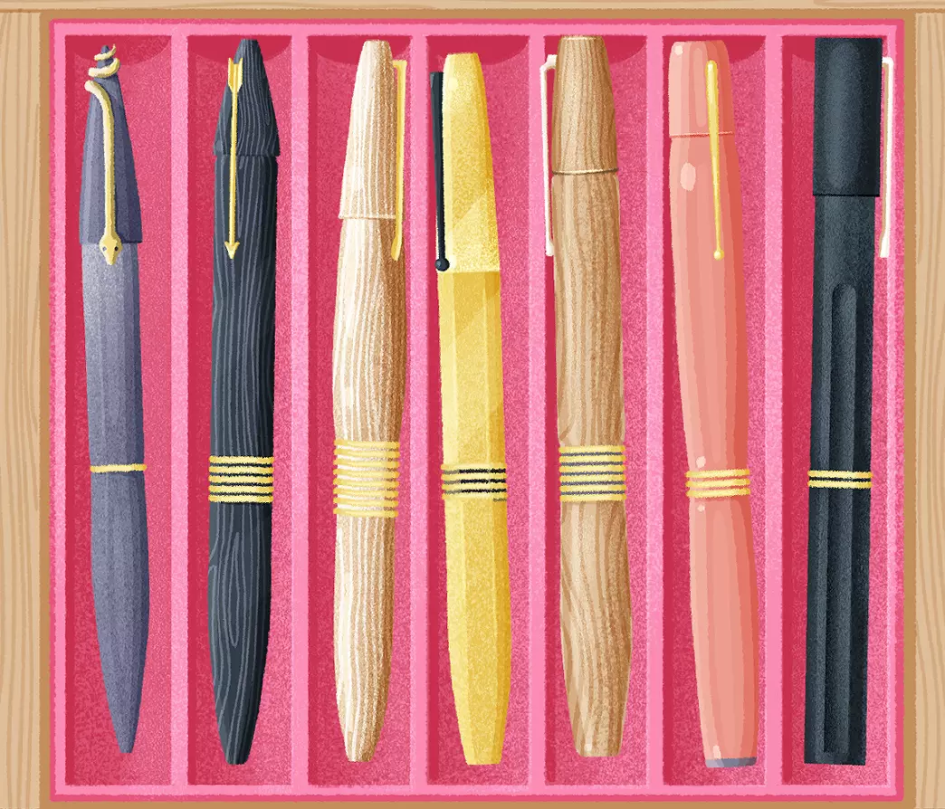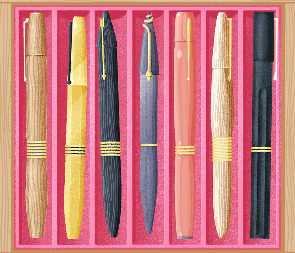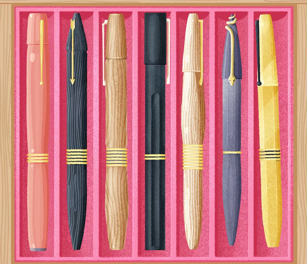 提示:这些钢笔的主人对笔尖粗细有广泛的偏好。 说明:按照笔尖底部(或顶部)的粗短程度排列钢笔。 答案: