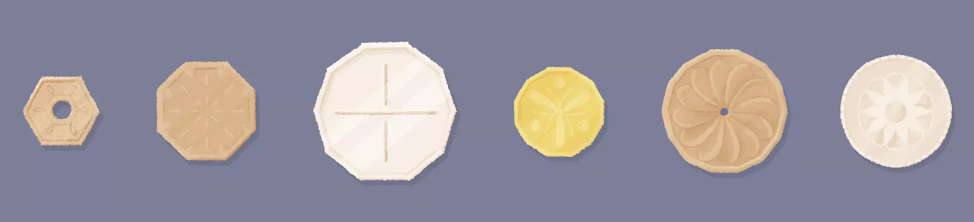 提示:这里有些硬币上有精美的图案——而其他的…… 说明:根据硬币是否有孔洞、有图案无孔洞或完全无图案无孔洞,将它们按行分组。 答案: