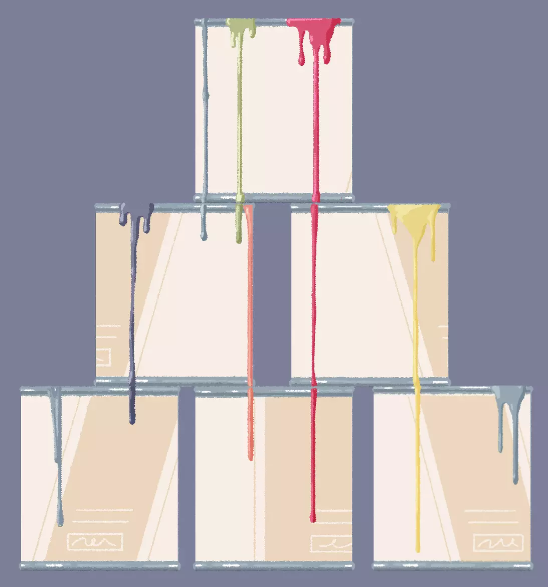 颜料罐 提示:什么样的人会把不止一种颜色的颜料放进同一个罐子里? 说明:旋转颜料罐,使滴落的颜料对齐。 解法: