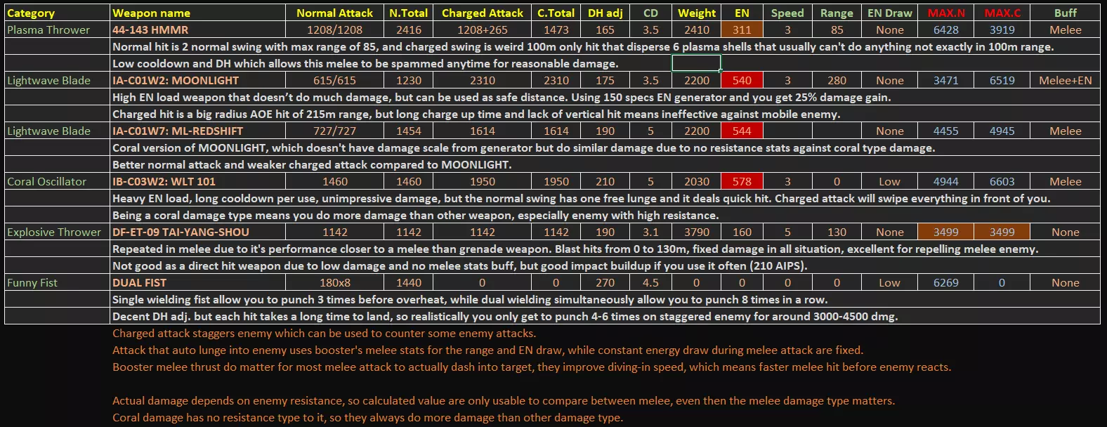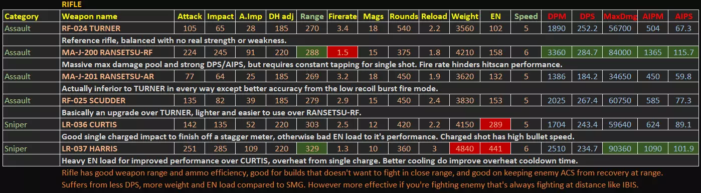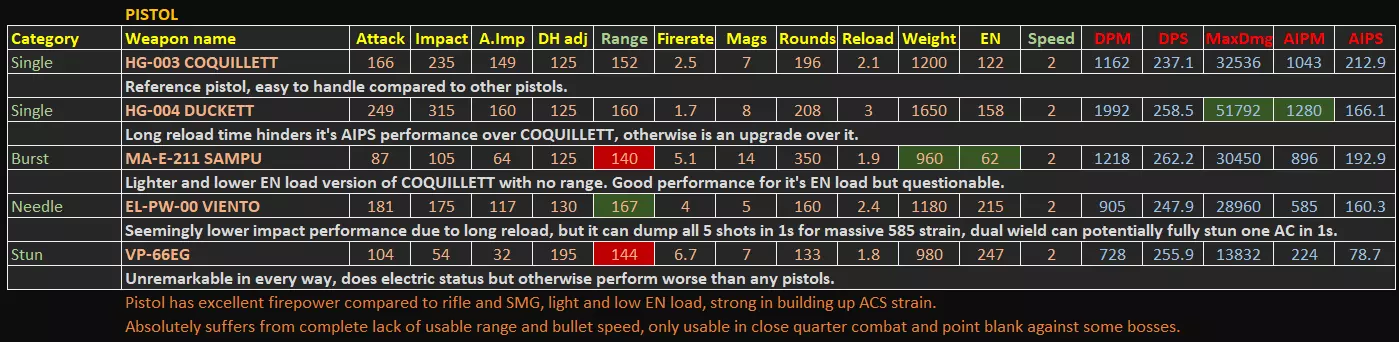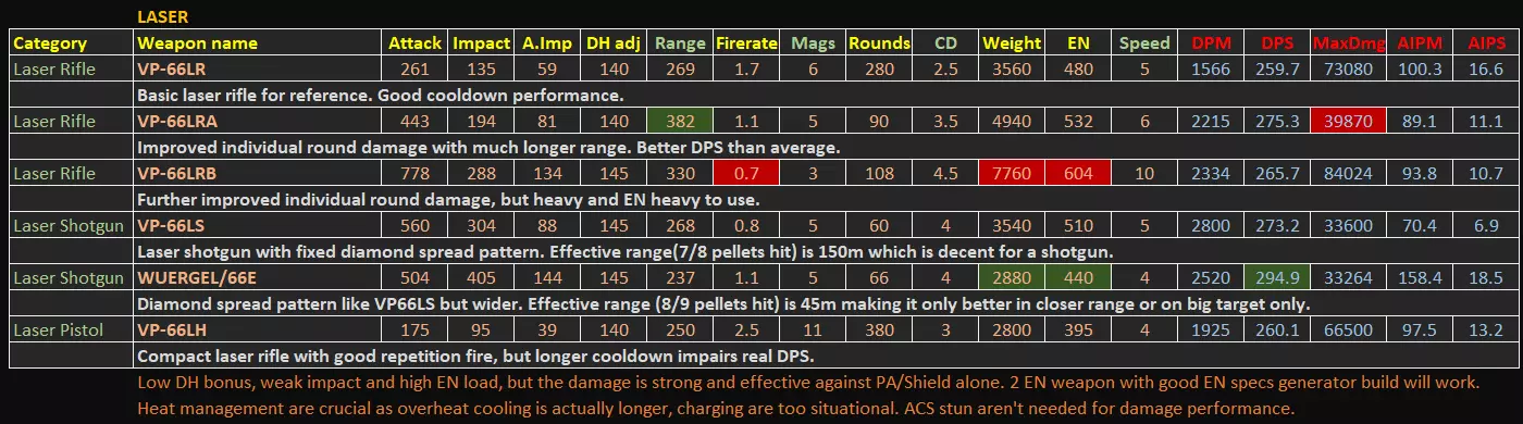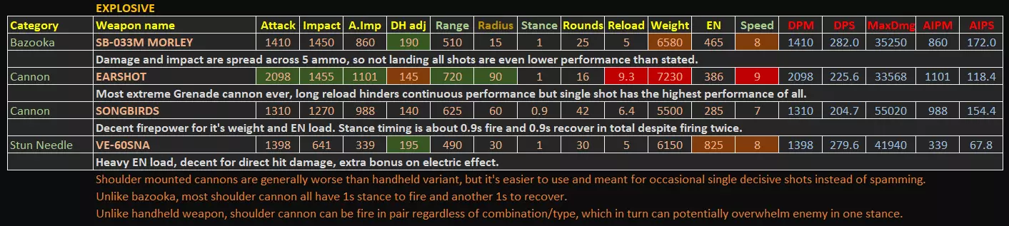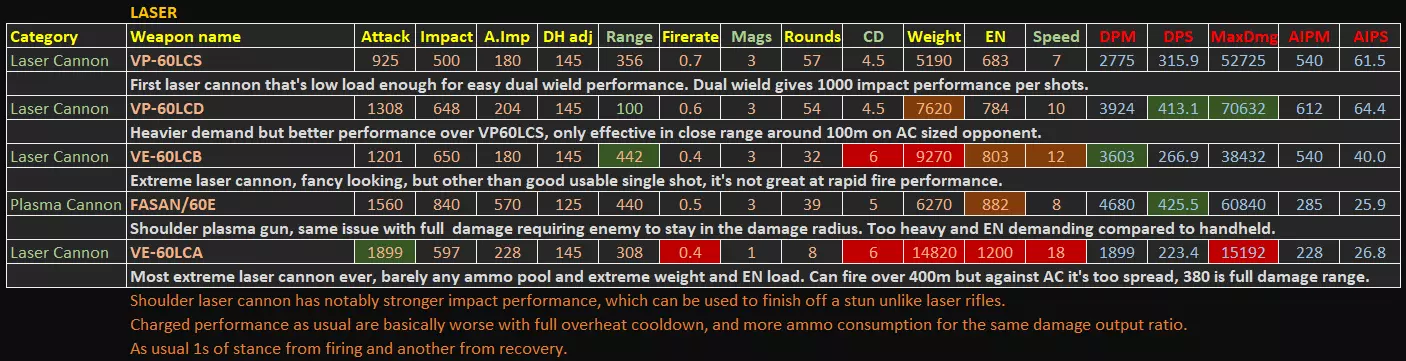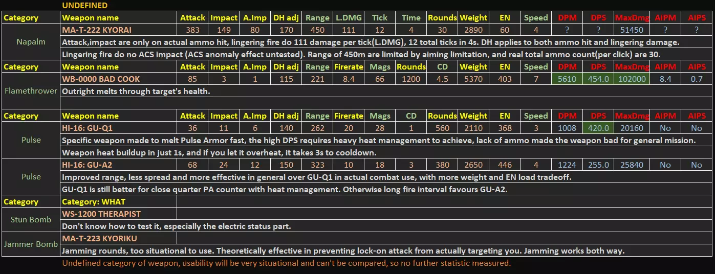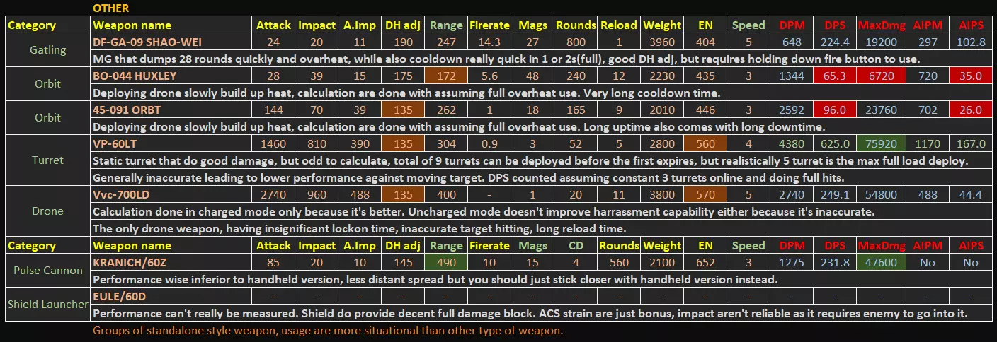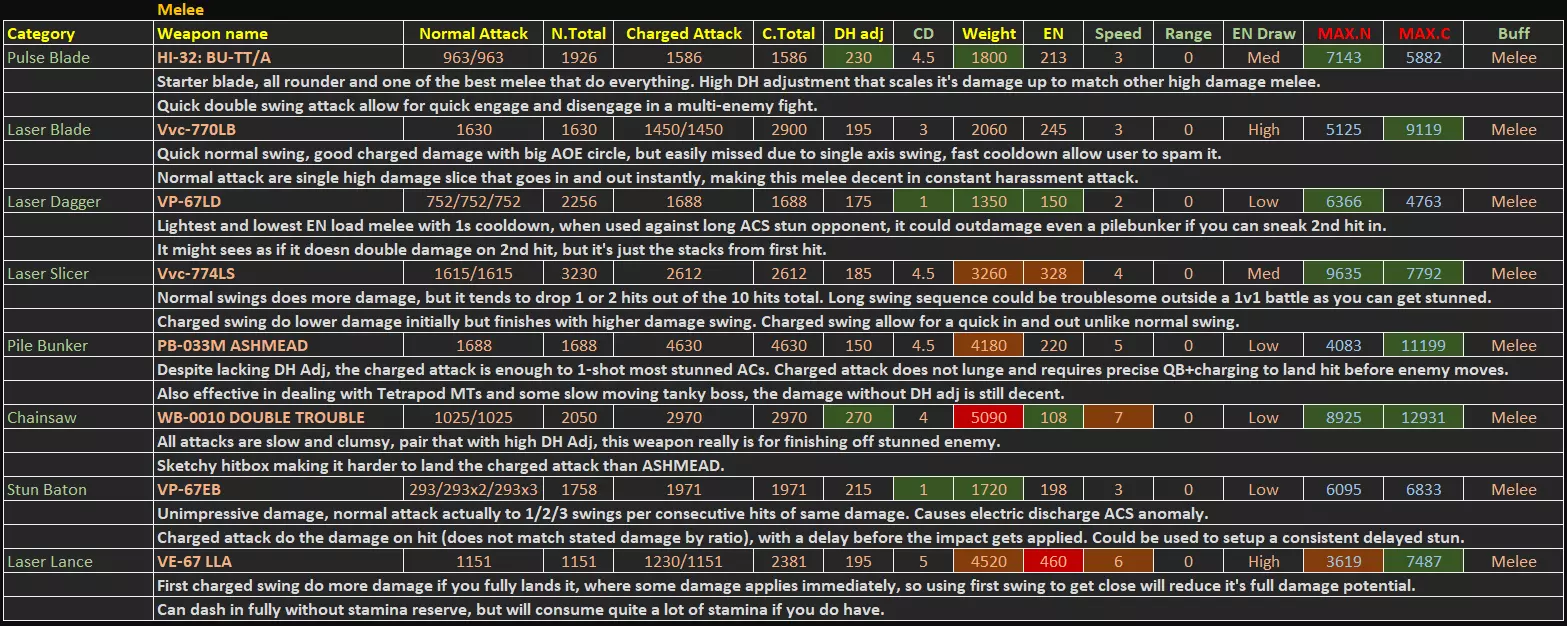 本指南包含游戏内统计菜单未显示的额外数据,这些额外数据均为计算得出或实测结果。本指南将突出一些无法从有限的游戏内数据中直接读取的隐藏优势/劣势。 基本信息 - 更新至1.09.1补丁 - 所有额外数据均经过合理计算或游戏内测试。不适用于PVP强度衡量。 - 精确的激光冷却时间和子弹速度数据可从游戏文件regulation.bin中提取,未来可能会更新激光部分以及子弹速度数值,因为枪支的子弹速度存在未标明的显著差异,这也是etsujin在多次削弱后仍表现不错的一大优势。1) 手臂武器 信息(V1.09.1)