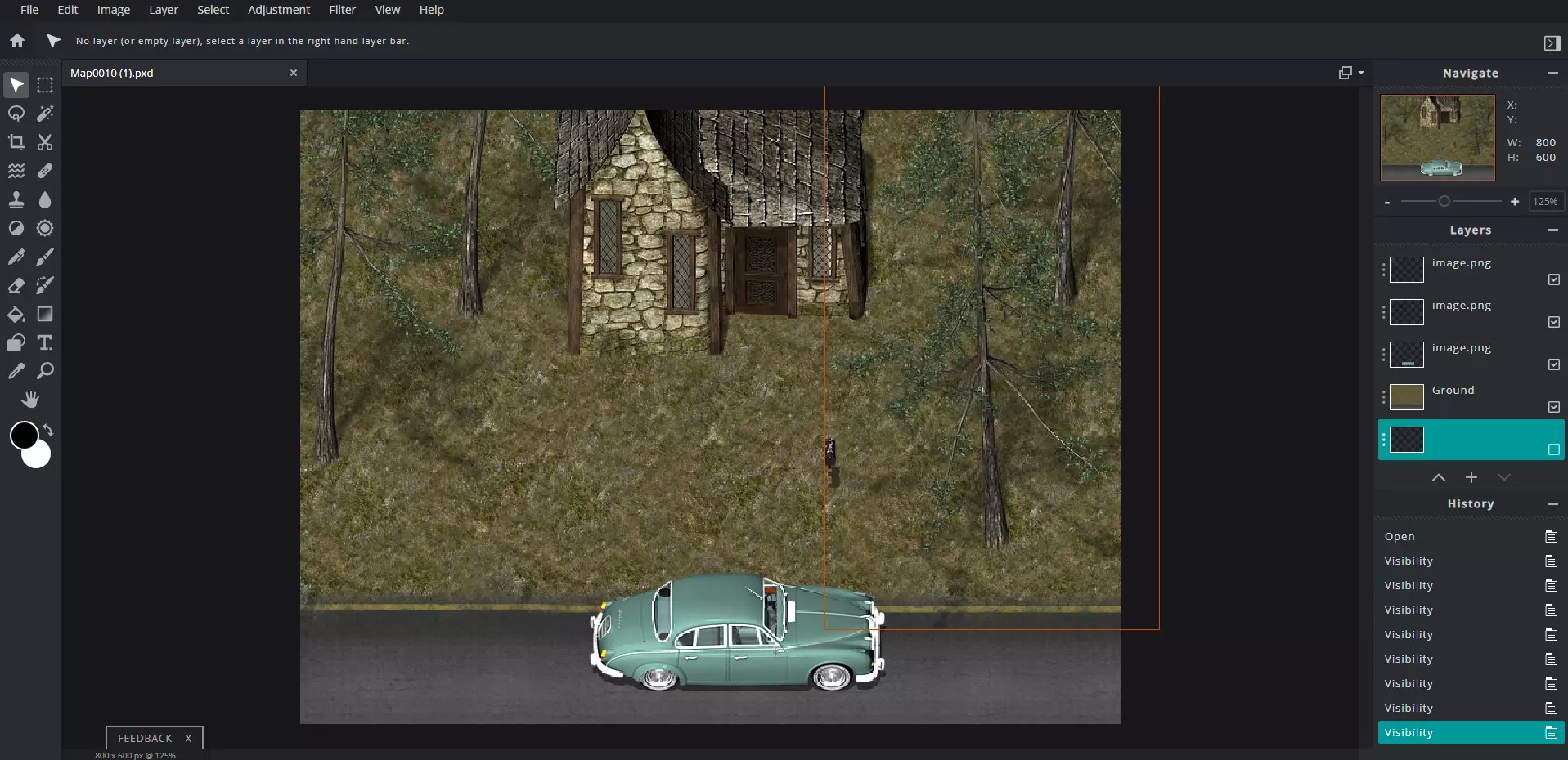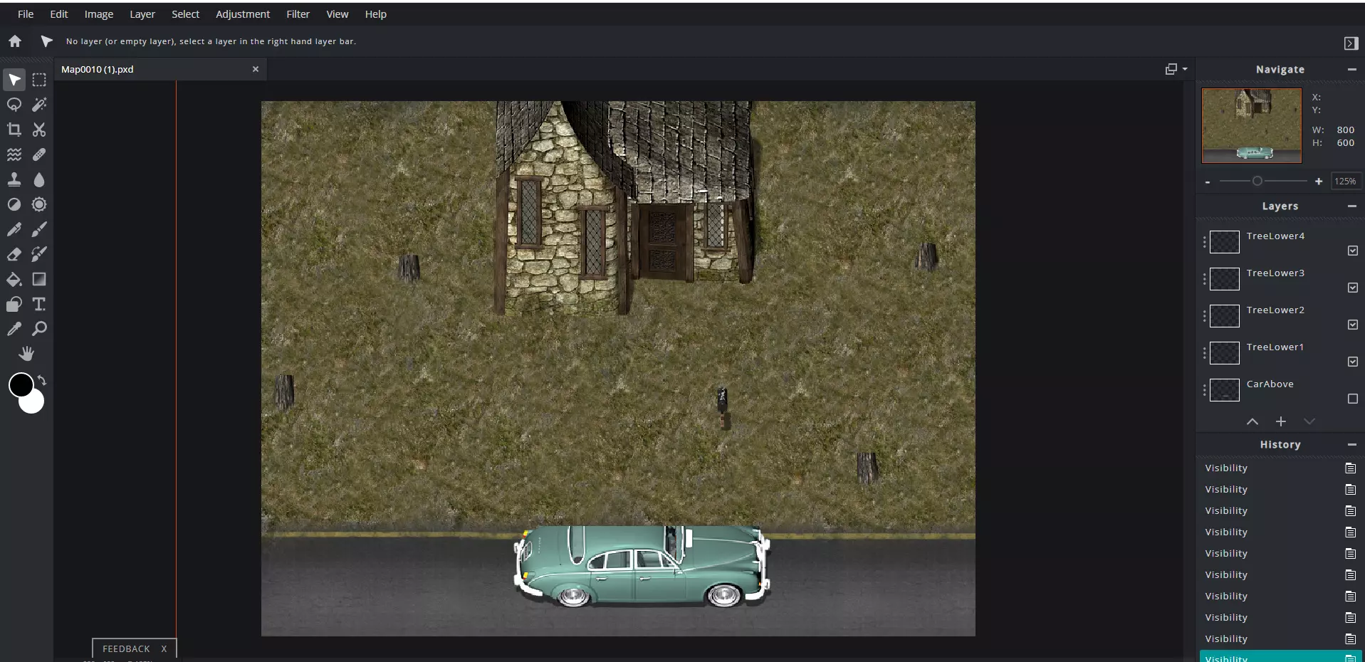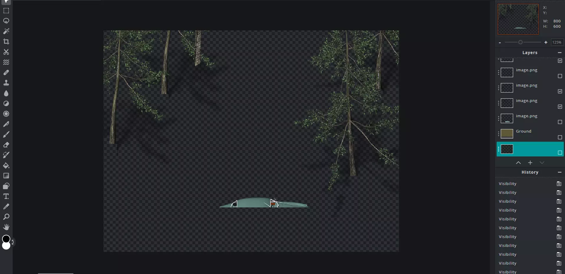 当你满意后,将整个图像保存为.png格式,并放入游戏“img”文件夹下的“parallax”文件夹中。在.png文件名前加上“!”,这样它就不会重复显示。 接下来可能是最棘手的部分:设置地图的上层和下层(这就是为什么给所有图层标注会让事情变得容易得多的原因)。 对于下层部分,关闭所有在游戏中会出现在角色上方的图层(例如树枝、架空的桥、屋顶的突出部分等)。由于大多数这类图像是完整的一张图,而不是分开的,你可能需要自己将图像切成两半。使用选框工具或套索工具,在图像上框选出会出现在角色上方的部分,按“剪切”(Ctrl+X),然后“粘贴”(Ctrl+V)为单独的图层。然后,如果需要的话,将分离的图层与原始图层对齐到应有的位置,再将其关闭。