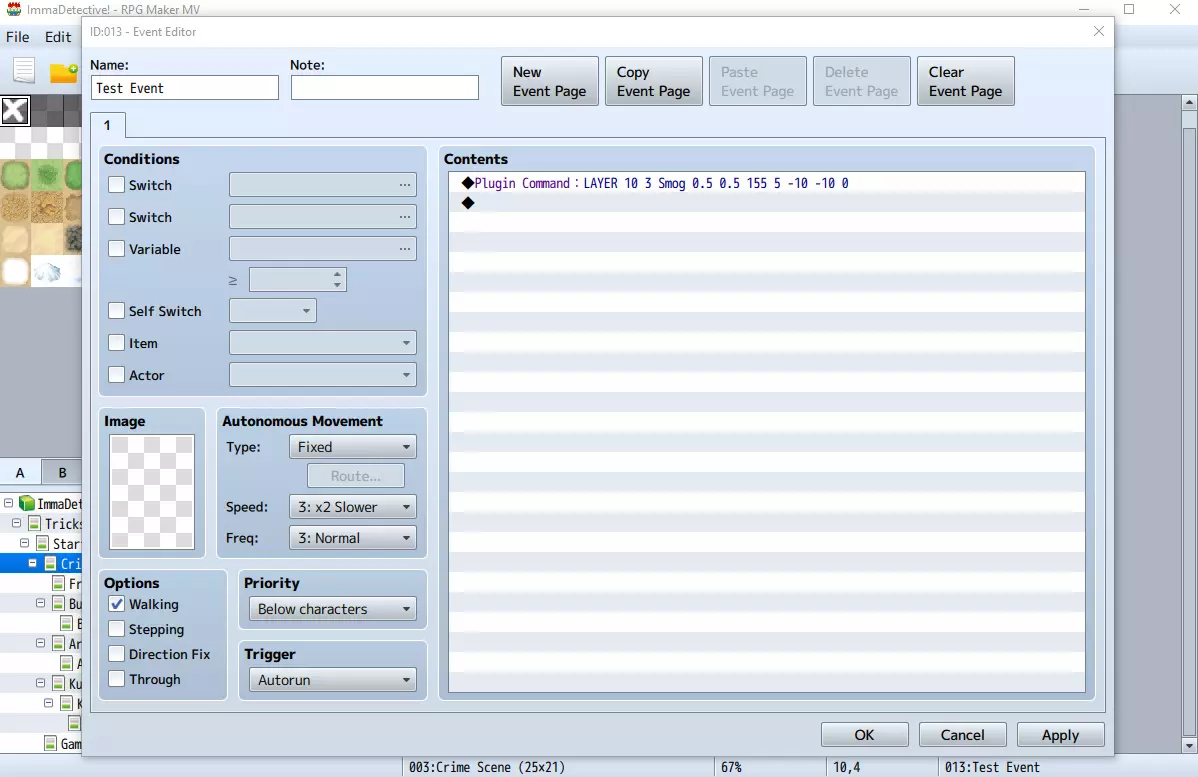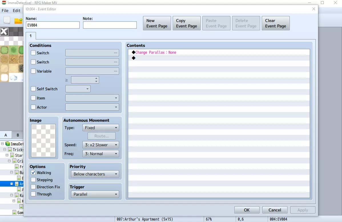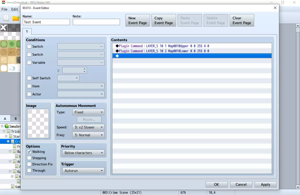 这些插件命令来自Galv的插件。我不会详细介绍所有可能的使用方法,但会说明示例中各部分的含义: 【LAYER_S】:表示图像将保持静态且不会重复。 第一个数字(示例中的“10”):这是你希望图像显示的地图ID。 第二个数字(示例中分别为“1”和“2”):这些是图像的ID。数字具体是多少并不重要,只要确保它们彼此不同,这样图像就不会相互替换。 图像名称(示例中分别为“Map0010Upper”和“Map0010Lower”):前两个数字之后是你保存在“layers”文件夹中的图像名称。接下来的3个数字对基础设置来说并不重要,只需确保第3个数字像示例中那样设为255,因为该数字代表图像的不透明度。 倒数第二个数字(在示例中分别为“4”和“0”):这是最重要的数字。它用于设置图像的优先级,即图像相对于其他角色和图像的显示顺序。对于上层图像,你需要将其设为“4”(使图像显示在除天气外的所有内容之上)。对于下层图像,你需要将其设为“0”(使图像显示在所有内容之下)。 最后一步是在 parallax 地图上创建一个并行事件。该事件只需一个命令:【更改 parallax:无】。