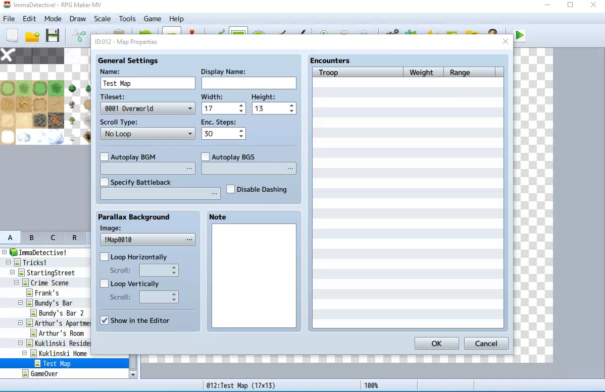 在引擎中设置视差图 在引擎中,打开你的视差图的地图属性(如果之前跳过了该步骤,可以创建一个新地图)。将地图的图块集设置为包含你刚创建的新图像的图块集(即带有绘制的X和O的A1图块集)。 然后,在【视差背景】下,选择保存在“parallaxes”文件夹中的视差图.png文件(文件名前带有“!”的那个)。此图像不会作为游戏中的实际地图,它仅用于展示游戏中地图的外观,以便你像往常一样设置事件和图块碰撞。