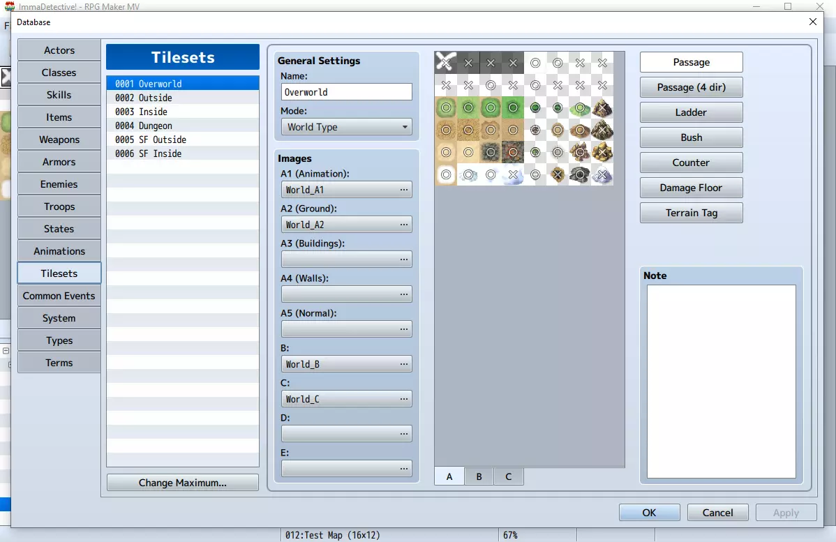 关闭原始图层,使唯一可见的图层是你创建的新图层,然后将其另存为新的.png文件到游戏“img”文件夹中的“tilsets”文件夹。在引擎的“Tilesets”(图块集)下,将新图像添加到图块集中,然后将“X”图块及其正下方图块的碰撞属性设置为不可通行,将“O”图块及其正下方图块的碰撞属性设置为可通行(无星号)。这就是你将用于在视差地图上设置每个图块碰撞属性的图块集。