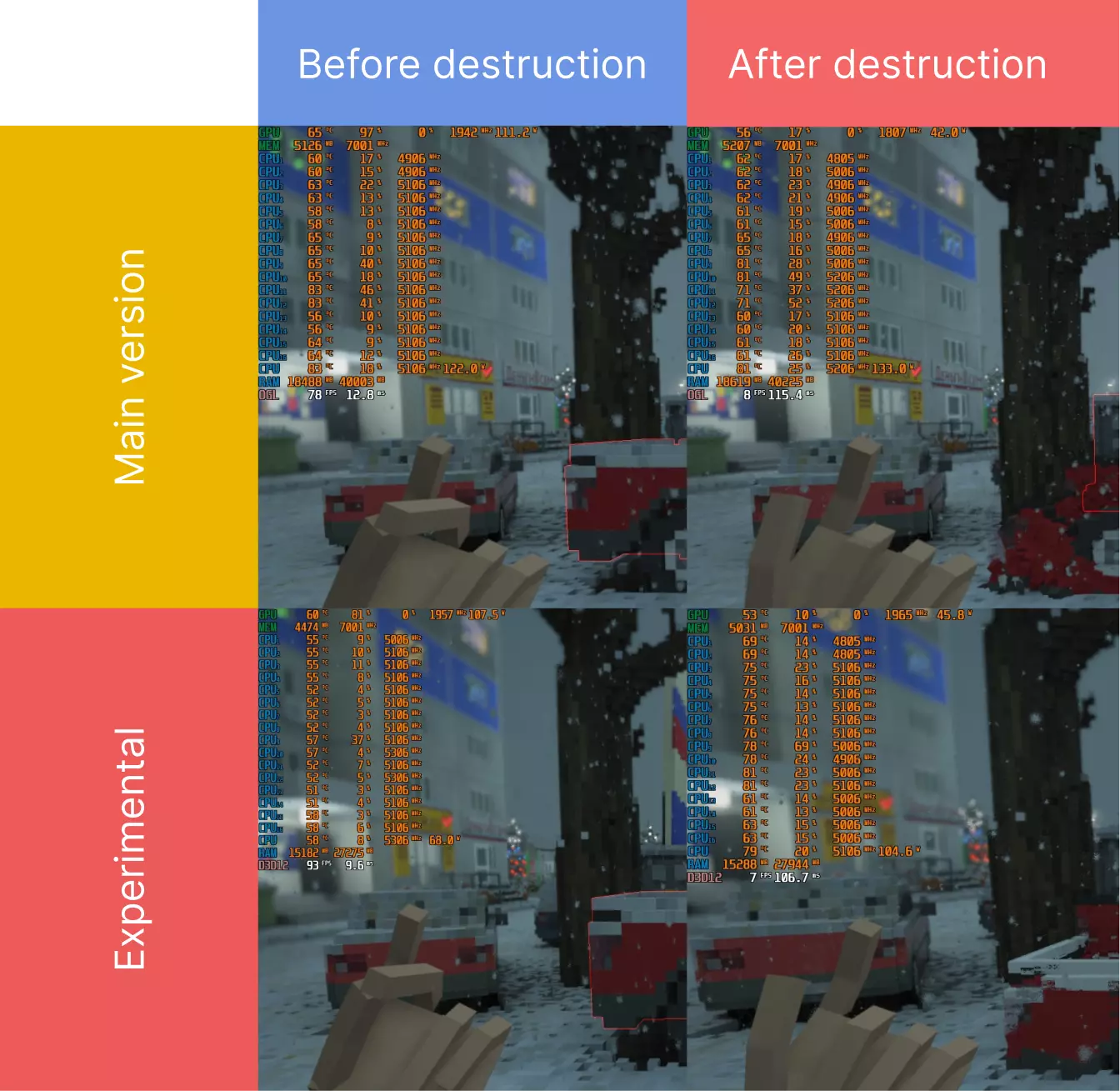 Хоть Nvidia и рассказывает об этом как о инновации, но по факту первое изображение с помощью трассировки лучшей было сделано еще 1963-м, а сама Nvidia уже имела реализацию трассировки лучей в реальном времени уже на лето 2018 Так вот, если прочитать про основные недостатки трассировки лучей, то все станет ясным: "Серьёзным недостатком метода обратного трассирования является производительность. Метод растеризации и сканирования строк использует когерентность данных, чтобы распределить вычисления между пикселями. В то время как метод трассирования лучей каждый раз начинает процесс определения цвета пикселя заново, рассматривая каждый луч наблюдения в отдельности." (c) Википедия И как бы, сейчас в Cyberpunk 2077 Nvidia всунула Ray Tracing и дала на серии видеокарт 30-ой серии 30 fps с этим, с попытками сбалансировать это с помощью DLSS, в игре, хотя бы в которой есть возможность этим насладиться (я знаю что придется всматриваться в картинку, чтобы увидеть разницу, но все же картинка выглядит реалистичнее, особенно когда много источников света, хотя кроме реалистичных снимков в этом смысла нет), но Teardown, бл*ть, зачем!? Технически очевидно что там основные ресурсы будет сжирать просчет разрушений, так еще и это... Ну и дополняет эту ситуацию отличная разрушаемость (за что и полюбил Teardown), но просчет физики может залочить фреймрейт вплоть до 1 fps и создать задержку отрисовки кадра вплоть до 400+ мс; Здесь казалось бы все тоже очевидно, чем больше объектов - тем больше нужно просчетов физики, НО, к моему удивлению, если создать серьезные разрушения (допустим разрушение целого дома на воксели за раз), то RivaTuner (приложение для отслеживания фреймрейта и загруженности железа) сообщает что ни видеокарта, ни процессор не нагружен на 100% (есть спектр проблем, когда такое случается в играх из-за проблем с железом, но это уникальный случай с нашей игрой), нагрузка падает до 1-10% что по видеокарте, что по процессору, а значит блокирующая операция явно уже не в железе; То есть, в момент какого-нибудь примитивного разрушения (допустим выстрел с рпг в стену) - подскочит нагрузка на процессор и видеокарту, тут все понятно и с этим железо, в зависимости от их производительности, справится, но при преодолении определенной отметки по кол-ву вокселей для просчета физики игра во что-то упирается и не понятно чего ей мало; Чтобы вы понимали я получаю такую ситуацию на сборке с i9-11900KF + RTX 3050 + 32gb (16x2) 3200 mhz RAM + Водянка от Be quiet, и это ненормально... Чтож, перейдем к следующему разделу, где попытаемся понять, что мы можем с этим сделать... Что мы можем сделать? Как мы выяснили до этого, основными причинами нашего недуга низким фреймрейтом является тяжелый Ray-Tracing в реальном времени для отрисовки и сложность просчета физики при большом кол-ве объектов, соответственно, обработаем каждый из факторов: Графика и Ray-TracingГарантированный, очевидный и не самый приятный вариант - это понижение настроек графики, да да, понижение качества графики, понижение scale'а изображения до 50% (через конфиг игры можно вплодь до 40% опустить если не ниже) и понижение разрешения изображения, влодь до игры в окнном режиме и это не наш вариант; Оптимальный вариантКазалось бы можно отключить Ray Tracing, но х*й там плавал, разработчик игры на оф. сайте заявил, что это не возможно, тк это не опция игры, а основная часть движка, поэтому единственное что мы мо