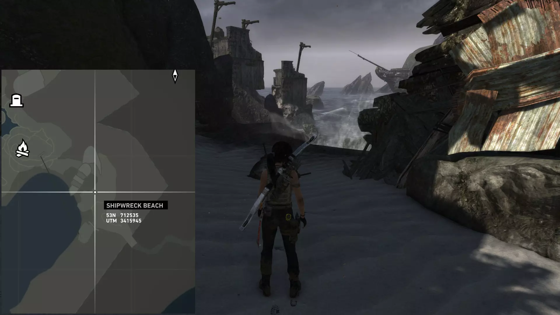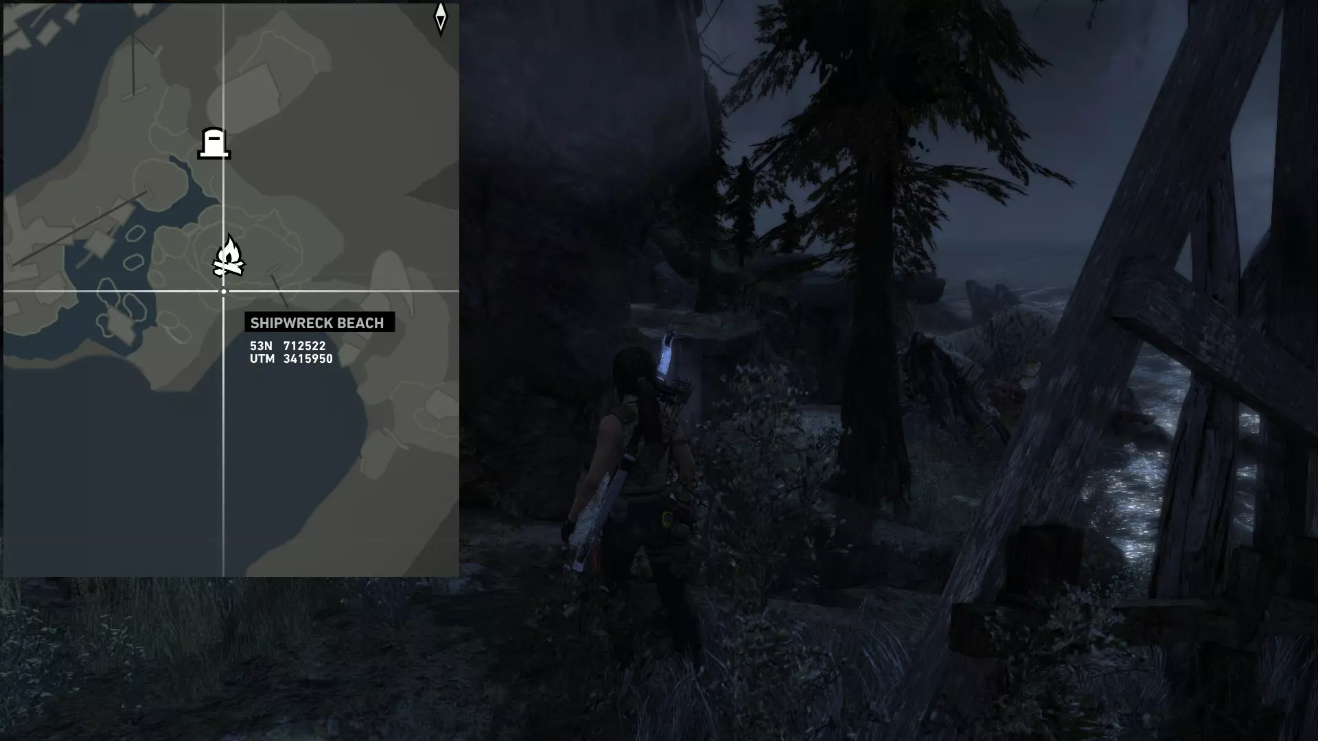 转身沿着海岸前往第二个残骸处。最后一枚地雷位于残骸后方的沙滩上。 坟墓#05 位于木桥右侧