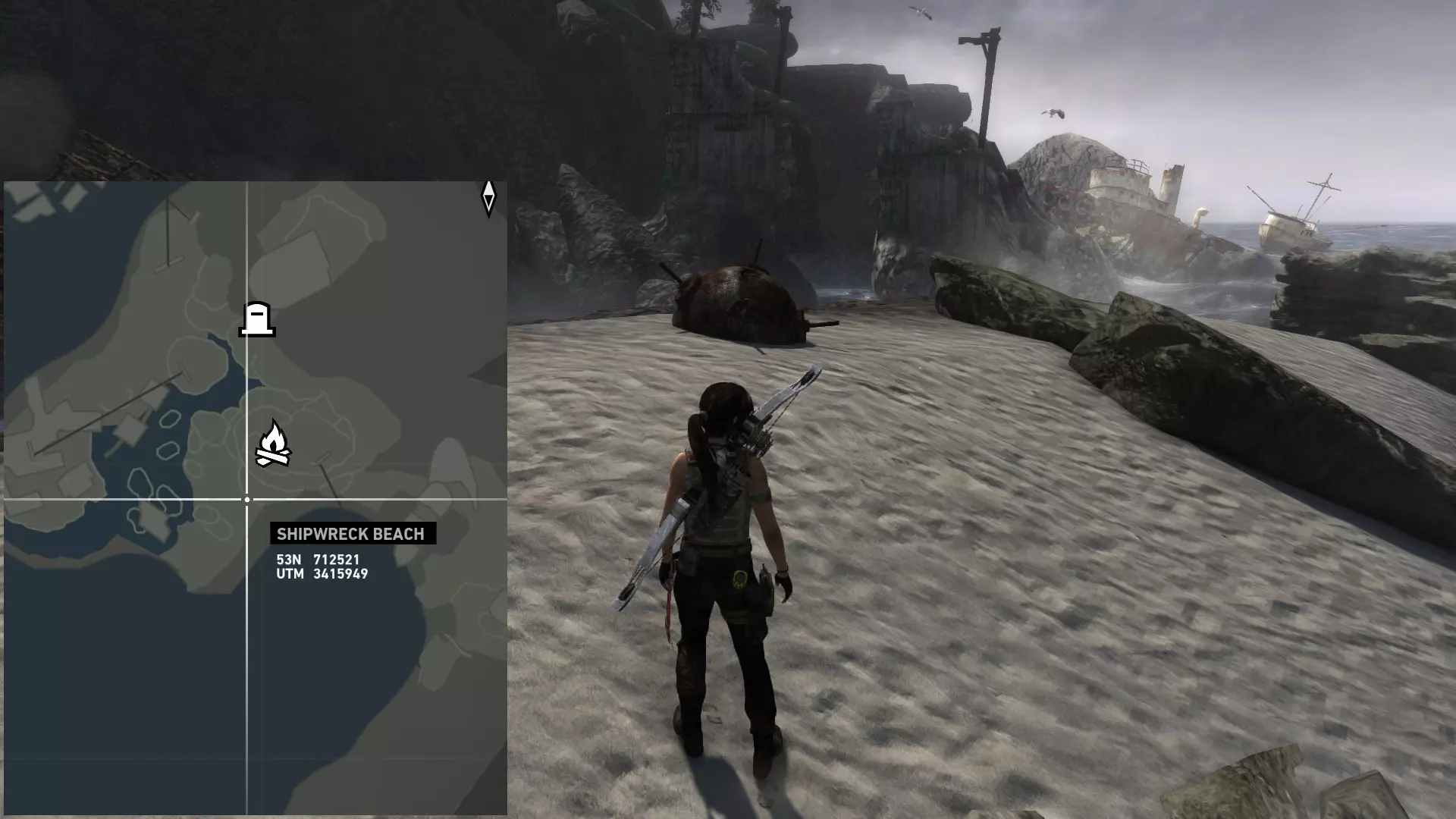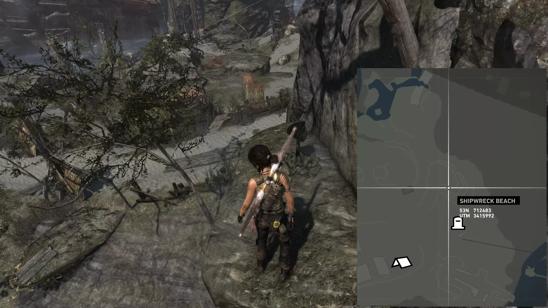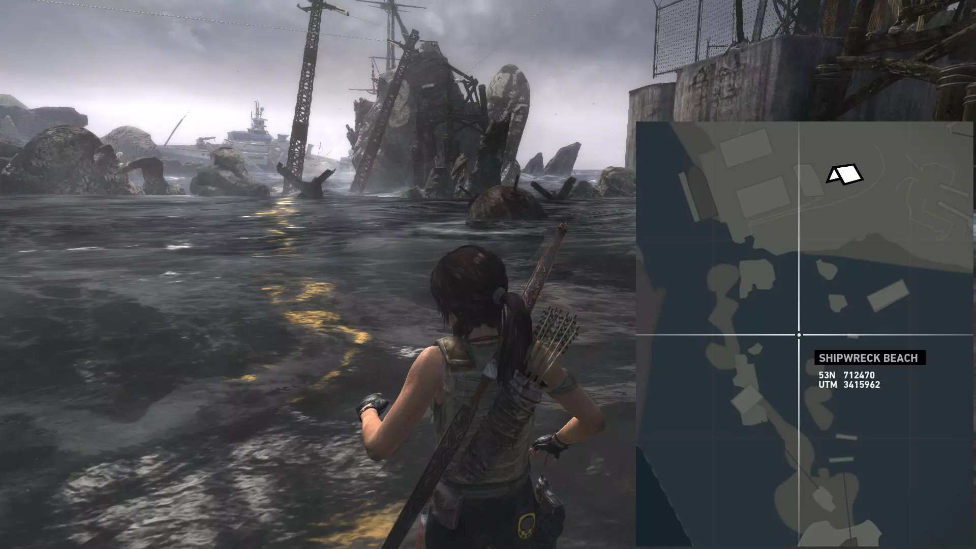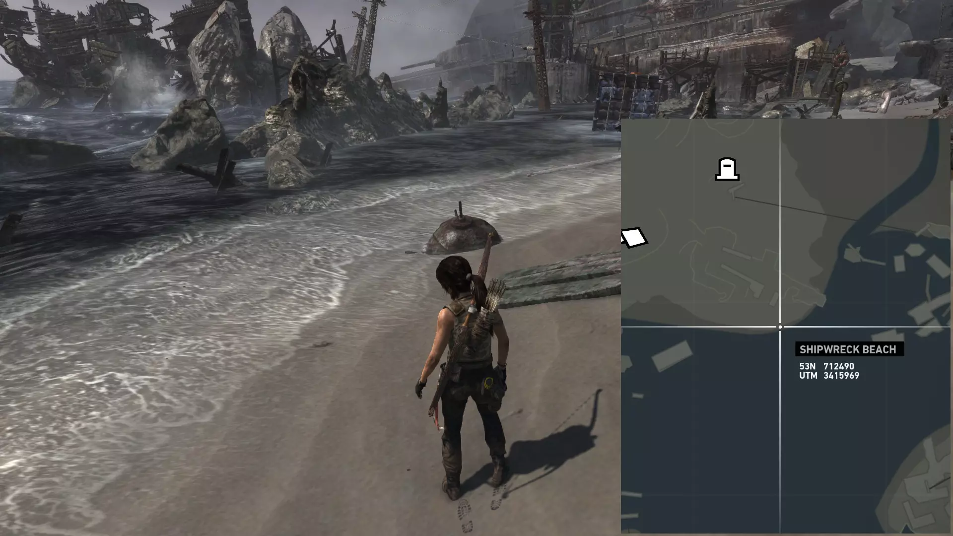 ...以及这块岩石的右侧。 第二次探索 在乔纳给你弓之后,你才能到达该地点的其他区域。 该区域分为四个部分: 第一处残骸,你可以在那里找到两枚浮动地雷; 我称之为“半岛”的区域,地面是沙地,有 puddles 和高大建筑,你可以在那里找到两枚(如果在残骸处漏掉一枚就是三枚)地雷和一个坟墓; 第二处残骸,你可以在那里找到一枚地雷; 半岛和第二处残骸之间的高地,通往地堡区域,你可以在那里找到最后一个坟墓。 地雷 #06 残骸之中