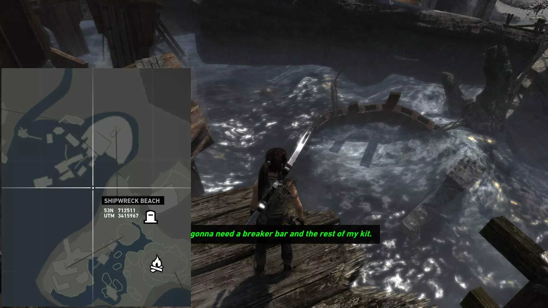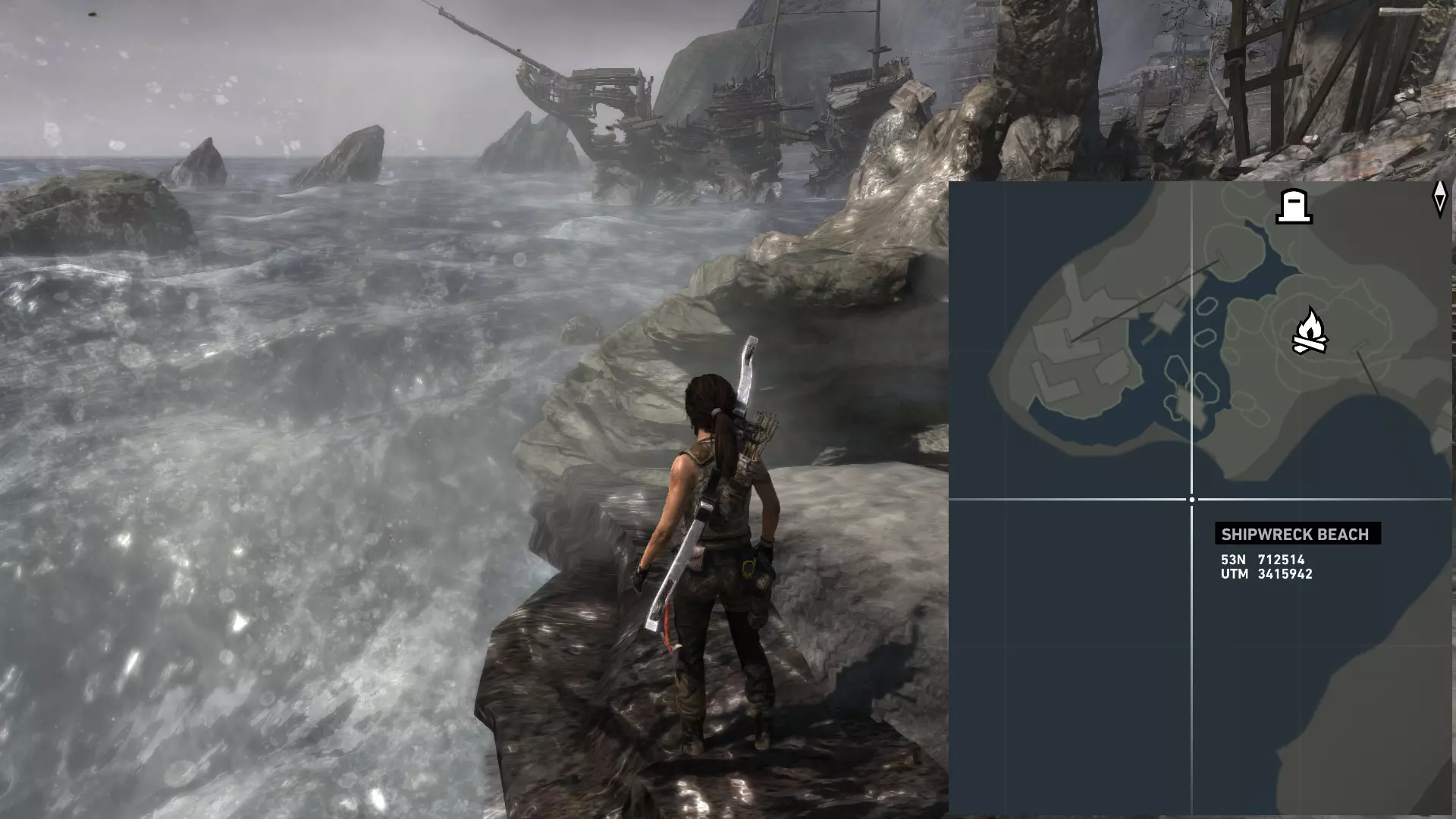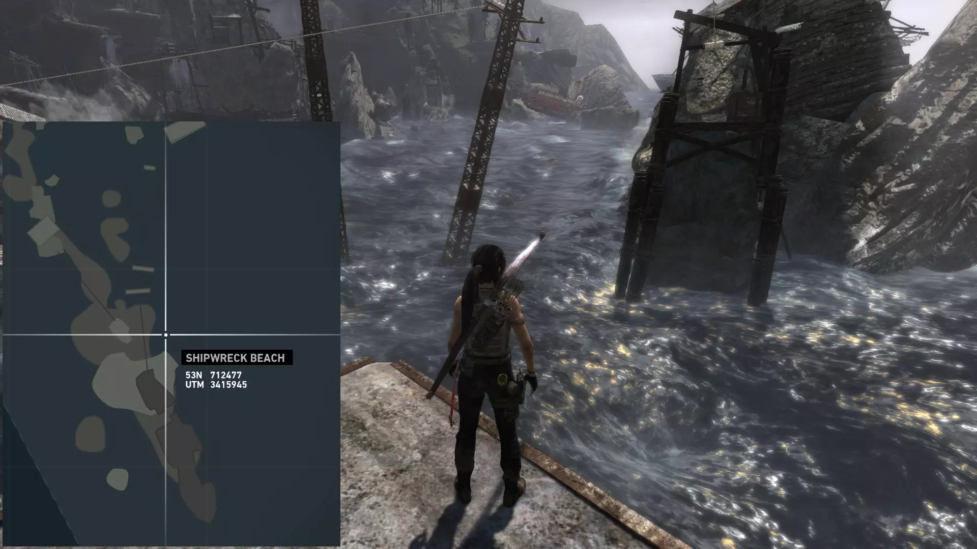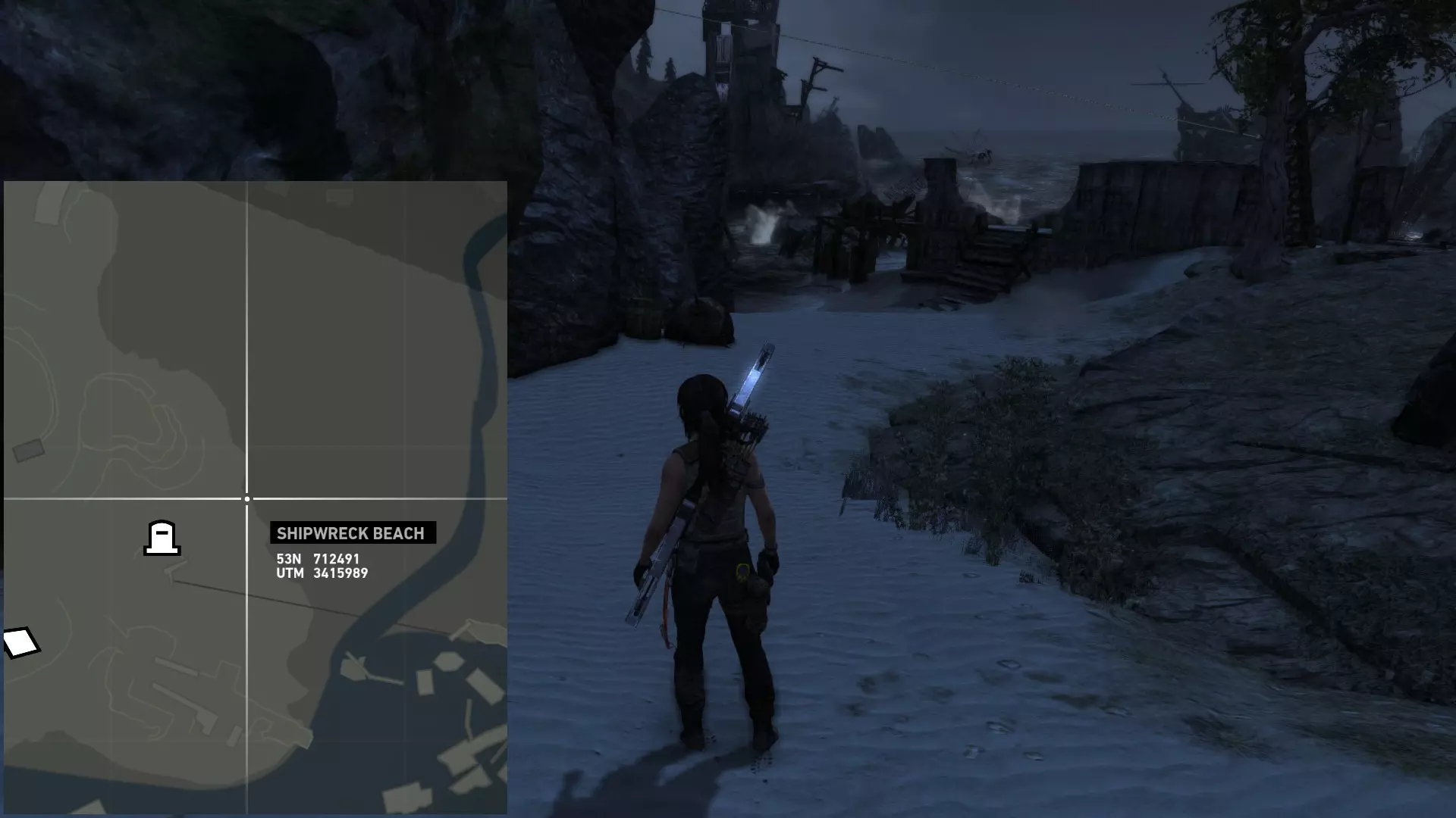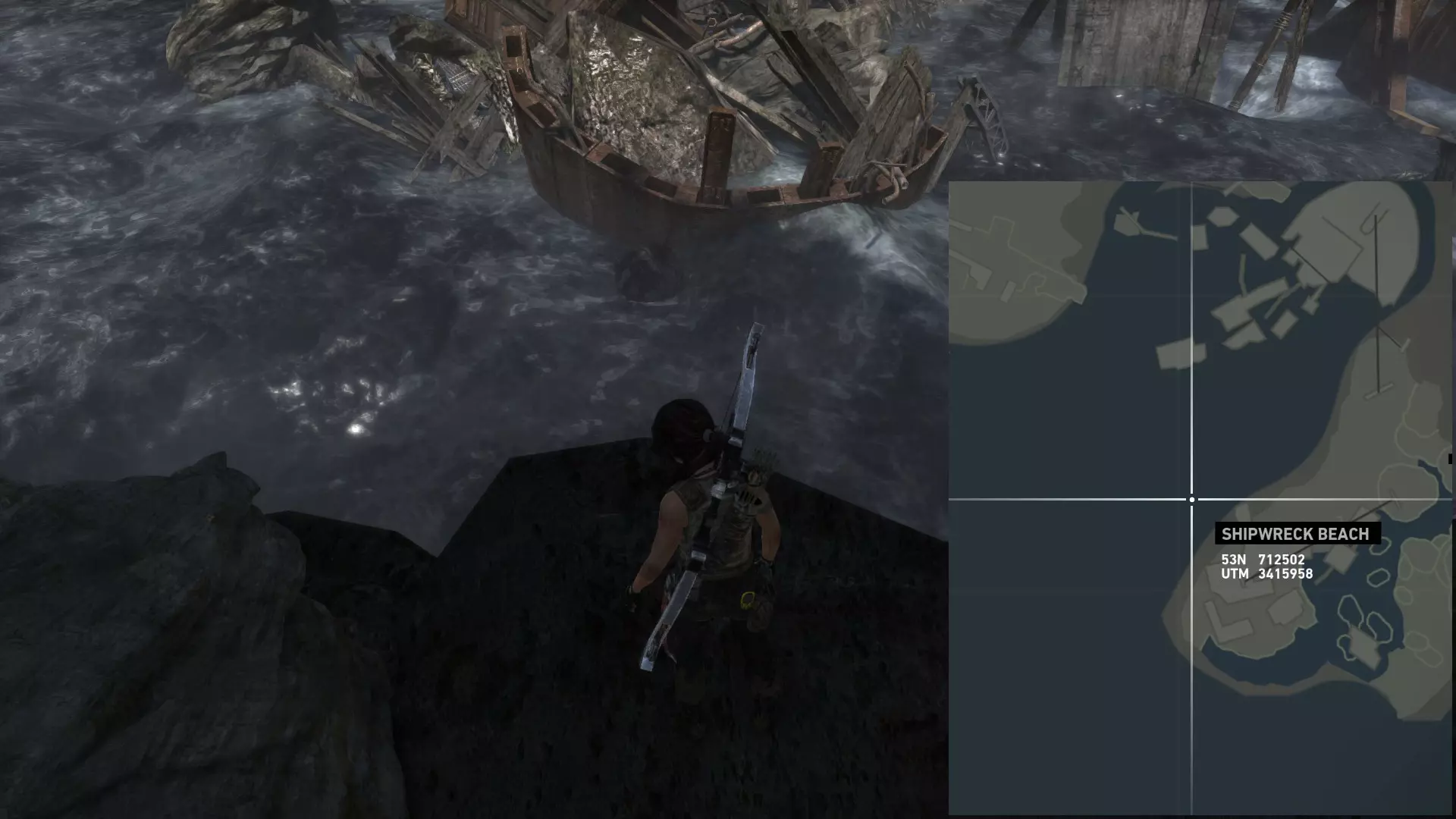 ...以及这块岩石的右侧。 第二次探索 在乔纳给你弓之后,你才能到达该地点的其他区域。 该区域分为四个部分: 第一处残骸,你可以在那里找到两枚浮动地雷; 我称之为“半岛”的区域,地面是沙地,有 puddles 和高大建筑,你可以在那里找到两枚(如果在残骸处漏掉一枚就是三枚)地雷和一个坟墓; 第二处残骸,你可以在那里找到一枚地雷; 半岛和第二处残骸之间的高地,通往地堡区域,你可以在那里找到最后一个坟墓。 地雷 #06 残骸之中