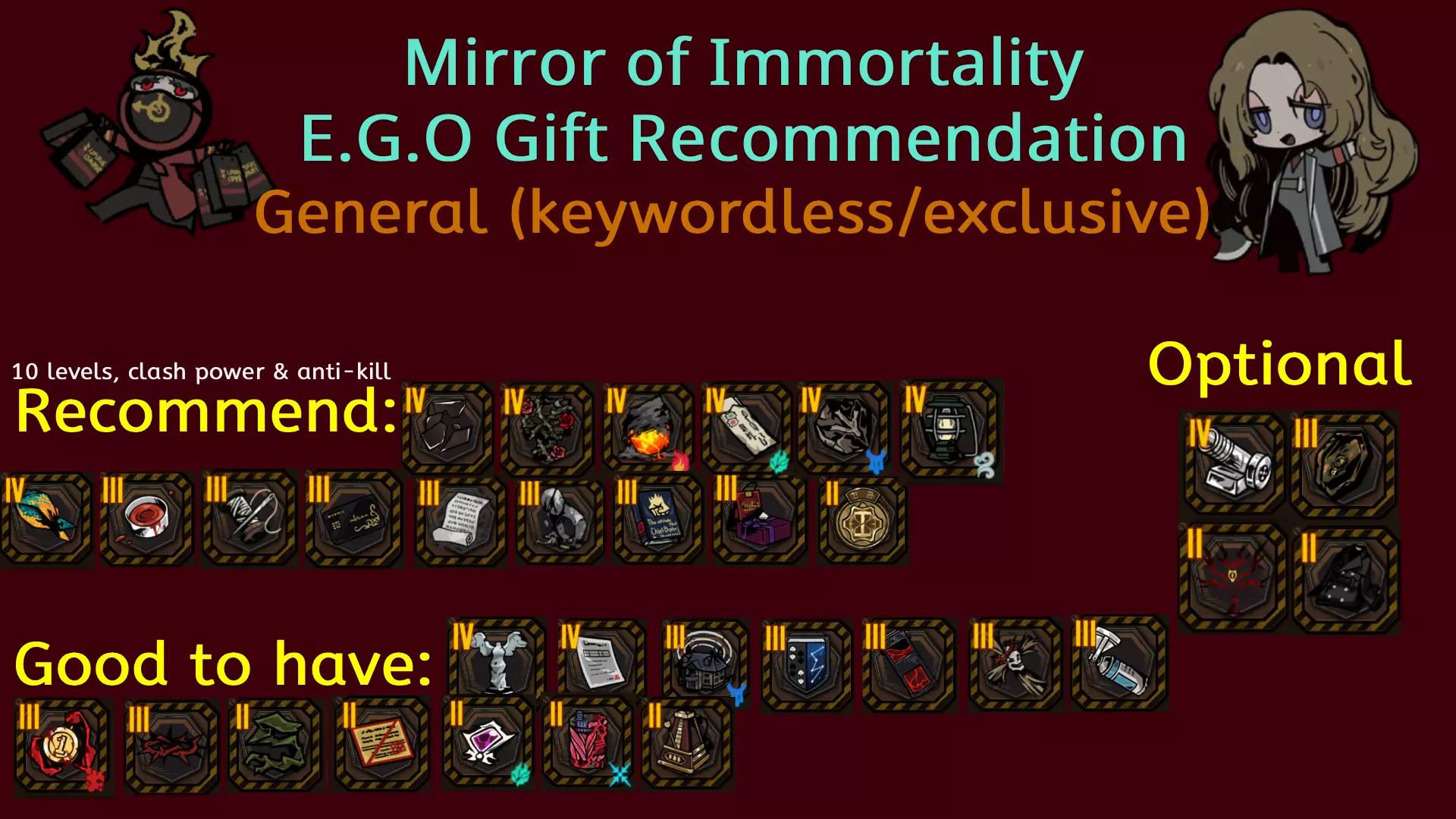 E.G.O礼物清单:有助于提升伤害并改善通关体验 简介 面向在镜像地牢中缺乏选择E.G.O礼物经验的新手指南。本指南将帮助你了解任何队伍应获取哪些E.G.O礼物以通过更高楼层。 本指南假设你已了解镜像地牢的基础知识,例如如何融合、如何选择恩赐和试炼等。如果你不知道如何获取特定的E.G.O礼物,建议查阅相关指南。 E.G.O礼物清单