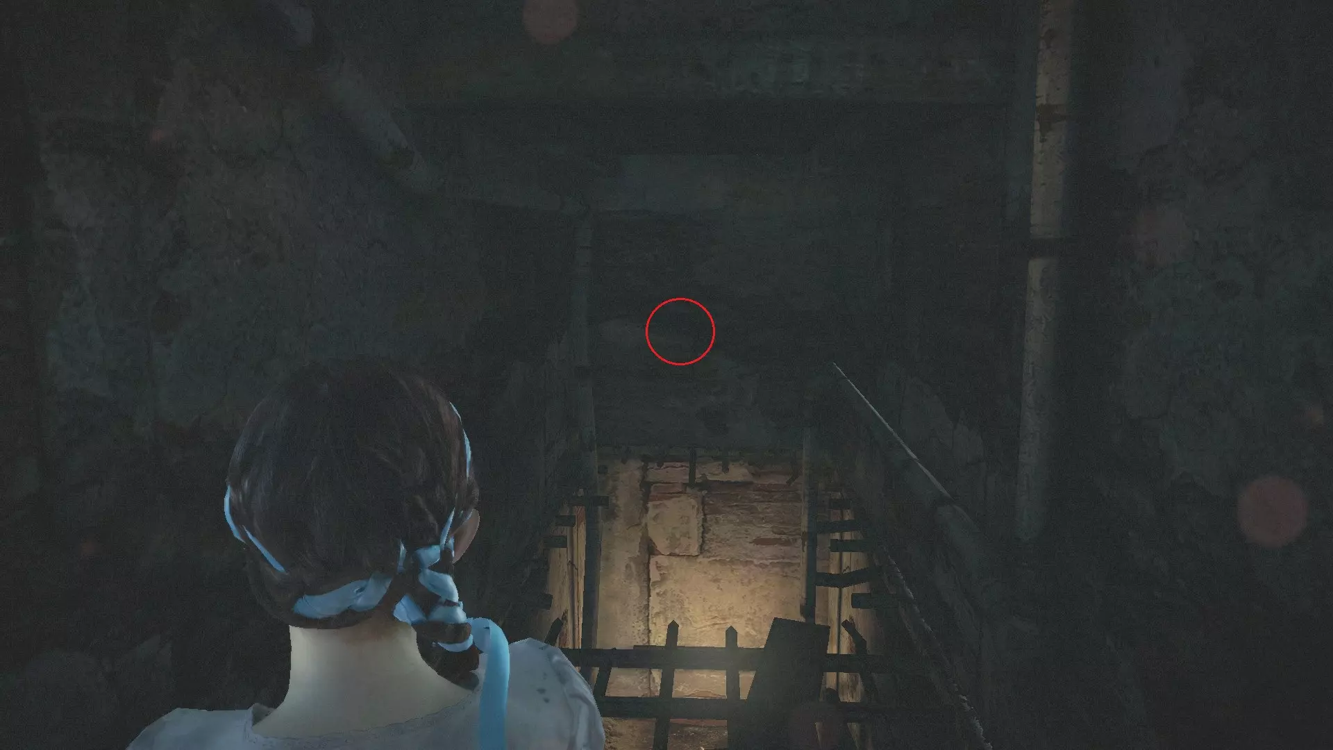 徽章塔(4/9):再次在圆形窗口遇到女孩后,沿着楼梯向下走,转身射击楼梯下方的徽章。