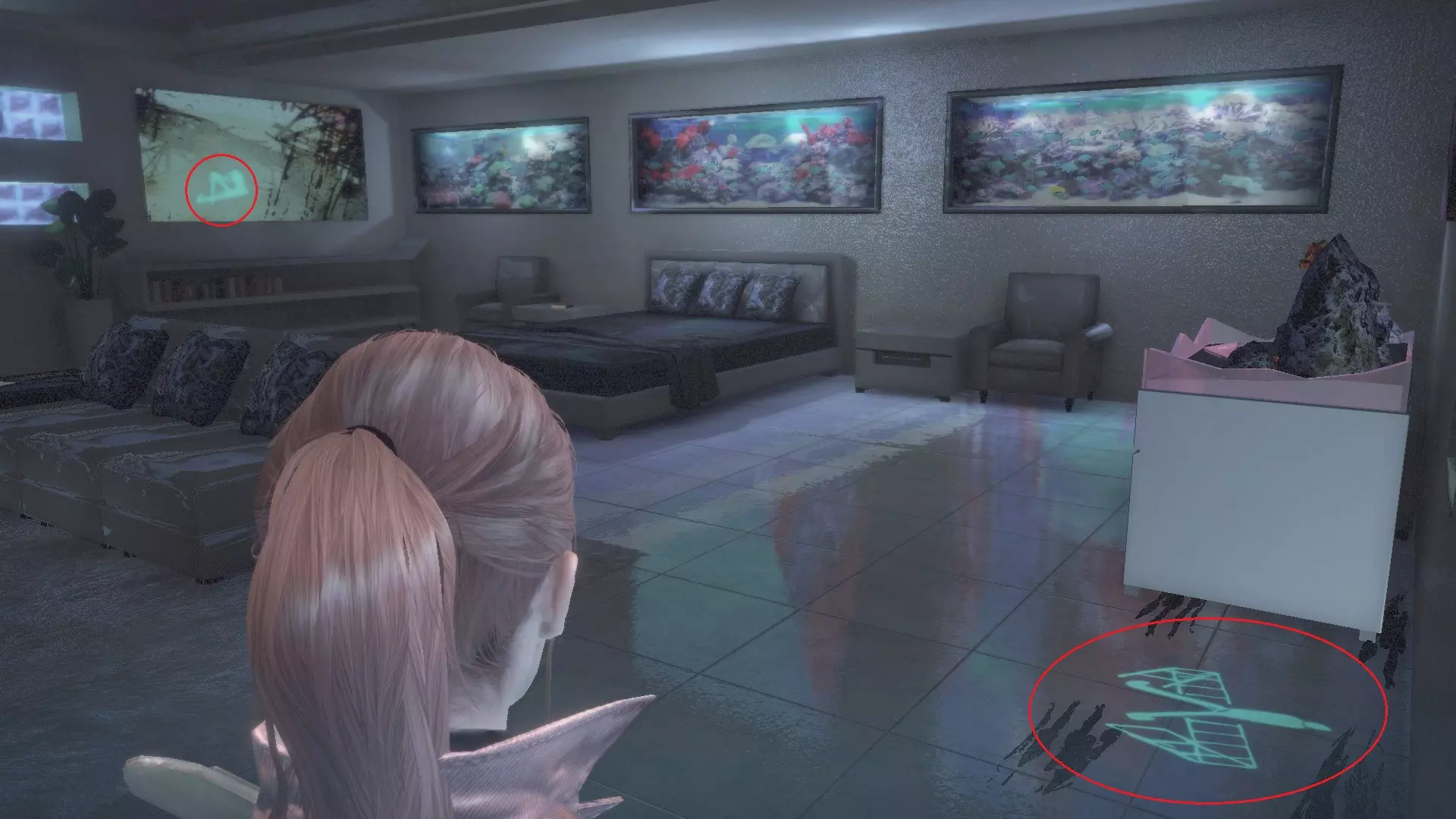 在有显示器的房间里,找到门左侧的拉杆。它可以切换水道中的闸门。你打开哪个闸门将决定娜塔莉娅能在哪里收集到虫子。 卡夫卡画作(3/6):进入舒适的房间后,照亮床左侧的画以及水族箱下方的地面。
