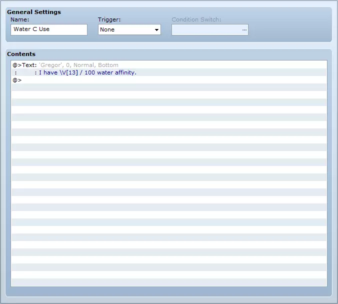 此外,我还加入了关键道具,让玩家可以查看游戏中被称为【元素亲和】的资源。玩家只需调用特定元素变量的公共事件即可。