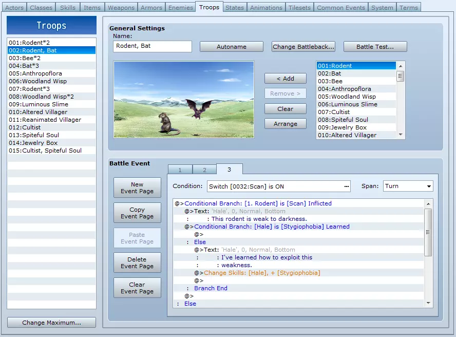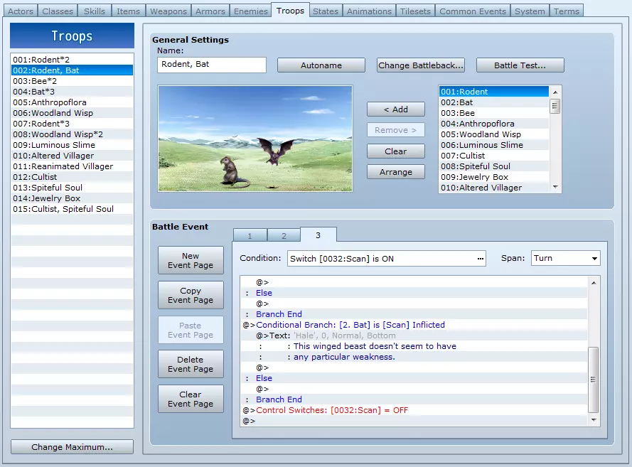 至于后半部分,我们有一个不会传授任何技能的敌人。需要注意的是,在本次事件结束时,我已经关闭了扫描开关。这基本上是为它的下次使用做好了准备。 在只有一个目标的战斗中,你无需使用条件分支来寻找目标。 因此,本节提供了一个非常简单的教程,教你如何为游戏创建扫描类型的技能,并介绍了战斗事件的集成可以多么简单。