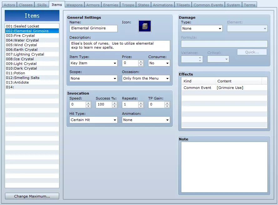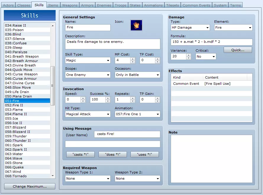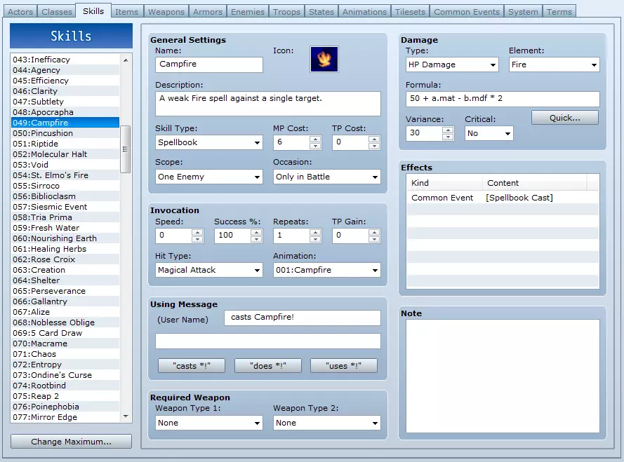 现在,你只需找到想要使用的技能并为其添加此设置。选择第一个法术,在“效果”中的“其他”选项卡下,选择“公共事件”,然后从下拉列表中选取我们刚刚创建的公共事件。对这个技能链中除最后一个法术外的每个法术都重复此操作。这样就完成了。