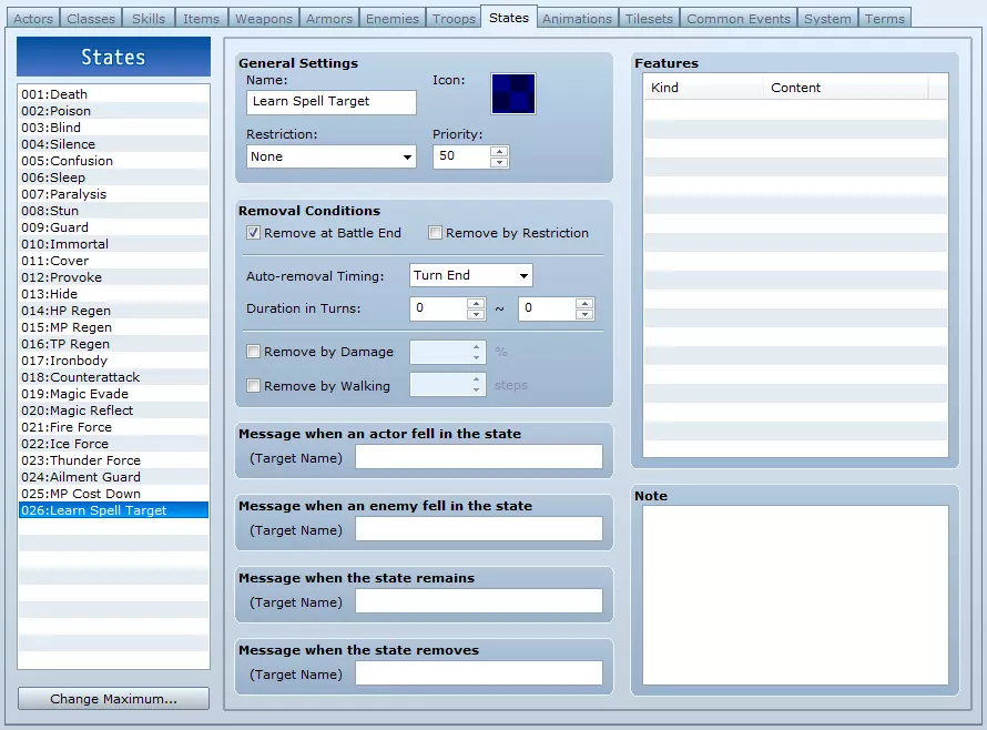 现在,别忘了,如果有其他人使用这个法术,无论是队友还是敌人,都会提升那个变量,所以如果让其他人使用这个法术,你需要复制一个该法术。确保有空白位置,然后复制粘贴,并且确保在效果区域中没有公共事件。 2. 通过学习进阶 下一种方式遵循许多《最终幻想》系列中青魔法师的模式。当法术对你施放时,你就能学会它。我甚至通过状态设置了一种简单的公共事件方式,确保法术的目标就是学习法术的人。这次不需要变量,实际上非常简单。不过,在寻找事件指令之类的内容时,我不会再像之前那样手把手地指导你了。 记住:如果你打算让多个角色使用这个系统,并且不希望他们通过互相施法来传授这些法术,那么你需要为敌人制作一个版本的法术,这个版本要能调用公共事件并施加状态;同时还要制作另一个没有这些功能的版本。或者,你也可以让所有角色都使用同一个版本,允许他们通过这种方式互相传授法术。我只是个教程,又不是警察,你想怎么做都行,说不定这样还挺有意思的。反正我也不是什么好教程,我自己都可能会那么做,所以我又有什么资格评判呢?我用于此的技能将是【学习技能】,状态为【学习技能目标】,公共事件为【学习技能使用】。当我提及技能、状态和公共事件时,我会尽量使用引号,所以如果我没有使用引号,那我实际上是在谈论学习技能或技能目标。另外,我的魔法学习者是【戴帽者哈蒂】,这是我的原创角色,请勿盗用。 首先,我们要创建技能。为了教程方便,我复制了默认的【火焰I】并将名称改为【学习技能】。我们稍后会回到这一步。你也可以选择修改已有的技能来适应这一点。 接下来,我们要创建状态【学习技能目标】。不要为其设置图标。不要为其添加功能。标记为战斗结束时移除。自动移除时机应设为回合结束。持续时间可以是0或1回合,测试中没有区别。这样,玩家将不会看到它,并且除了让我们的公共事件对其进行检查外,它不会以任何方式影响游戏玩法。