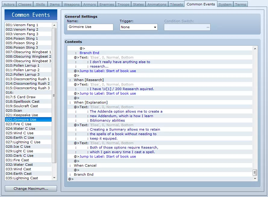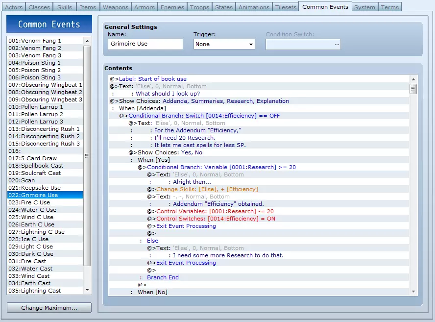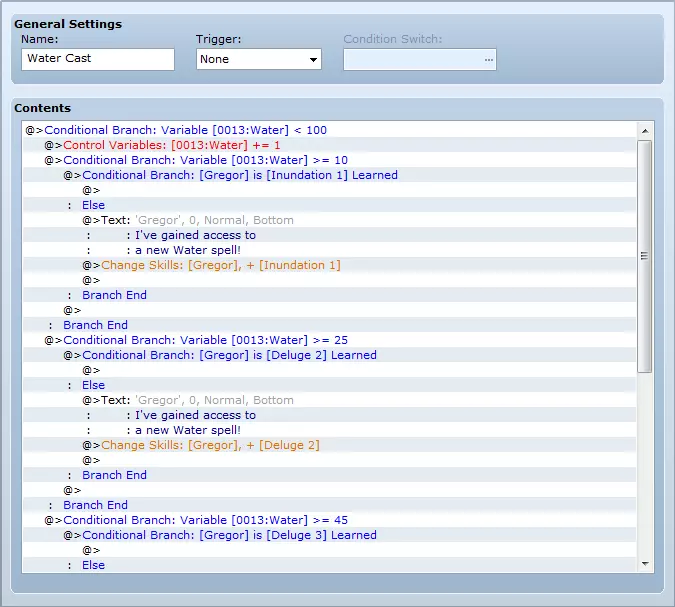 我的目标是介绍几种无需脚本即可创建替代传统等级提升的技能进阶系统的方法。这些方法都相当简单,旨在随着教程的推进,让你了解该软件的更多功能。 简介 RPG Maker VX Ace 自带默认的技能习得系统,你可以在其中设定角色学习技能的等级。这确实是一个不错且可靠的系统,但有时我们需要更具创意的方法。 我的目标是介绍几种无需脚本即可创建替代传统等级提升的技能进阶系统的方法。对我来说,脚本编写简直就是魔法;那些能熟练运用脚本的人都非常了不起,脚本本身则像是一门基于巫术的高深莫测的艺术。 我接下来会使用一些自己比较熟悉的简单功能,包括公共事件、变量和条件分支。 这些方法不一定完全是独创的,我可能会列举一些使用类似系统的现有游戏。其中有些很可能会让你联想到《传说》系列、《最终幻想》系列和《魔界战记》系列的游戏。不过,这些方法肯定不会像那些专业发行的游戏那样完善。 第一部分会手把手详细教学,第二部分的指导会稍微少一些,而从第三部分开始,更多的是建议而非教程。请记住,这些系统并非相互排斥,将它们融合可以创造出更有趣的效果,可能更符合你在自己项目中想要的感觉。 1. 通过使用进阶 2. 通过学习进阶 3. 法术强度缩放 4. 通过资源/整合装备进阶 5. 关于整合装备的补充说明 6. 通过扫描进阶 1. 通过使用进阶 使用这种方法,角色可以通过施展旧法术来获得新法术。例如,施展足够次数的火焰1级,角色就会学会火焰2级。这对于玩过《传说》系列游戏的人来说应该相当熟悉,在该系列中,施展基础武技会使角色获得更高级的武技。稍作调整,你甚至可以利用其他变量,通过让多个技能各自使用特定次数来学习组合技能,不过这里我就不展开细说了。 【注意】:如果有多个角色使用此系统且拥有相同技能,你需要让他们使用同一技能的复制品,也就是两个除了调用的公共事件不同外,其他所有方面都完全相同的技能。他们还需要各自独立的公共事件和独立的变量。 设置过程相当简单。除了要学习的技能外,你只需要一个公共事件和一个专门用于此功能的变量。你需要为每个将要创建的技能链准备一套这样的设置。所以,如果你想制作火焰、冰霜和治疗类法术,就需要为火焰、冰霜和治疗各创建一个公共事件,并且以类似的方式设置三个独立变量。 对于公共事件,第一步是使用【控制变量】,它位于第一个标签页的左列,【游戏进程】标题下方。你要确保变量选择【单个】,并选中该技能链对应的变量。操作方式选择【增加】,操作数选择【常数】,并将数值设为1。 接下来,我们要选择【条件分支】,它位于第一个标签页的左列,【流程控制】标题下方。我们需要确保处于第一个标签页,然后选择【变量】。你需要选择用于此操作的变量,接着选择【等于】或【大于等于】,并设置一个常量。这个常量将是你需要施放特定法术多少次才能学会该法术的次数。在本教程中,我们设为20。你可以取消勾选【设置条件不满足时的处理】选项,但这并非必须操作。 现在,确保下一步操作位于条件分支内的下一行。也就是说,选择【Else】之前的那一行,或者如果你取消勾选了【设置条件不满足时的处理】选项,则选择【分支结束】之前的那一行。这一步,你需要在第一个标签页的右侧栏、【角色】标题下选择【更改技能】。接下来,在【角色】标题下选择【固定】,然后选择将要施放该法术的角色。操作方式选择【学习】,并从下方的下拉列表中选择他们将要学习的技能。 以上就是通过多次施放某个法术来学习新法术的公共事件设置。如果你希望角色能通过这种方式持续学习法术,只需在之前的【分支结束】后重复上述操作即可。
