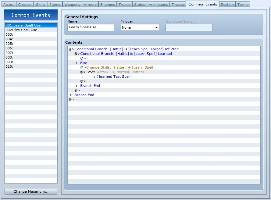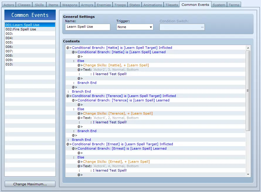 就是这样。至少对于一个技能和一个角色来说是这样。 你想要更多角色?只需将你在公共事件【学习技能使用】中所做的内容复制粘贴到同一个公共事件中,放在上一个分支结束之后,并在所有3种适用情况下更改角色。重复此操作,直到涵盖所有可以通过这种方式学习该技能的角色。